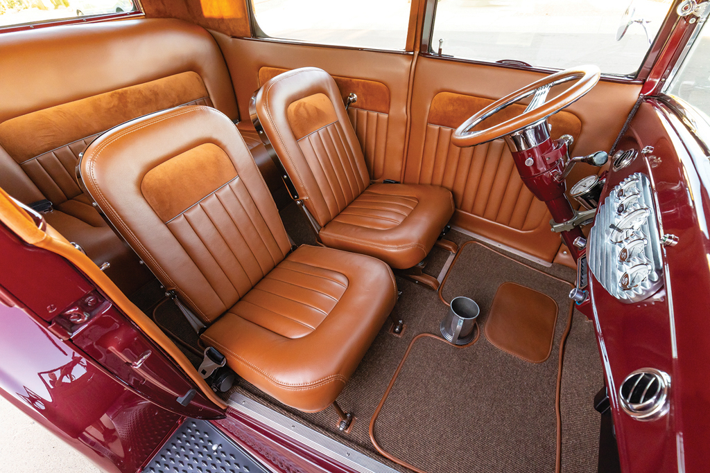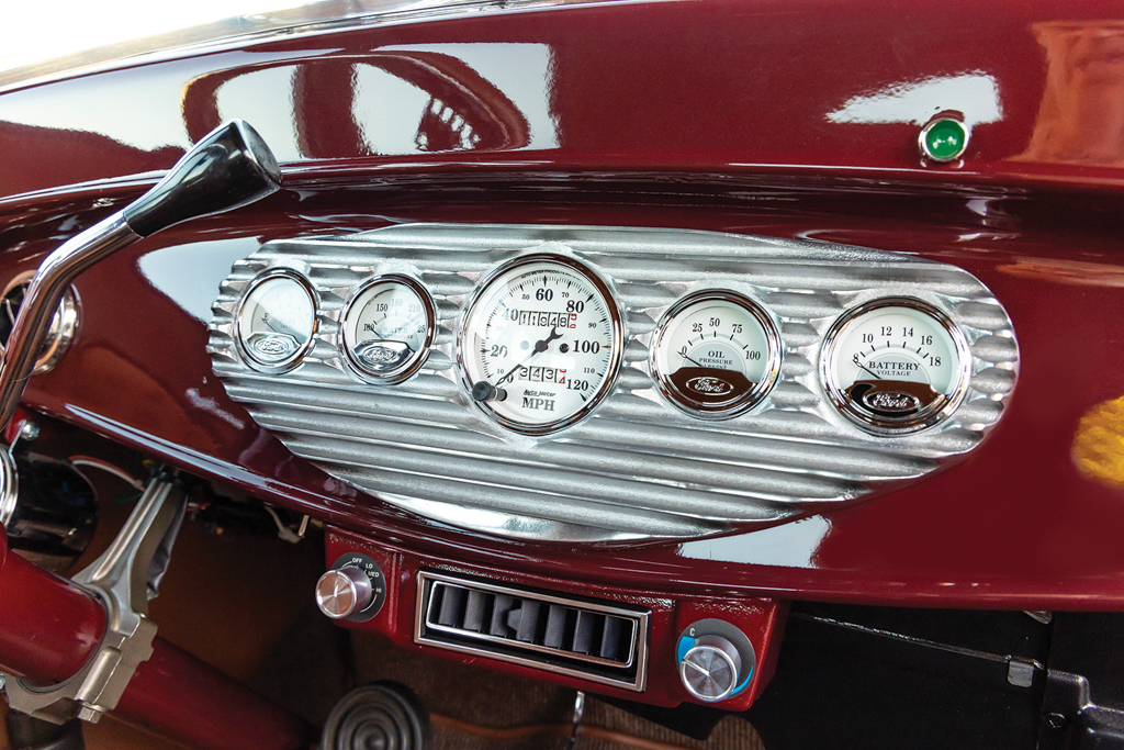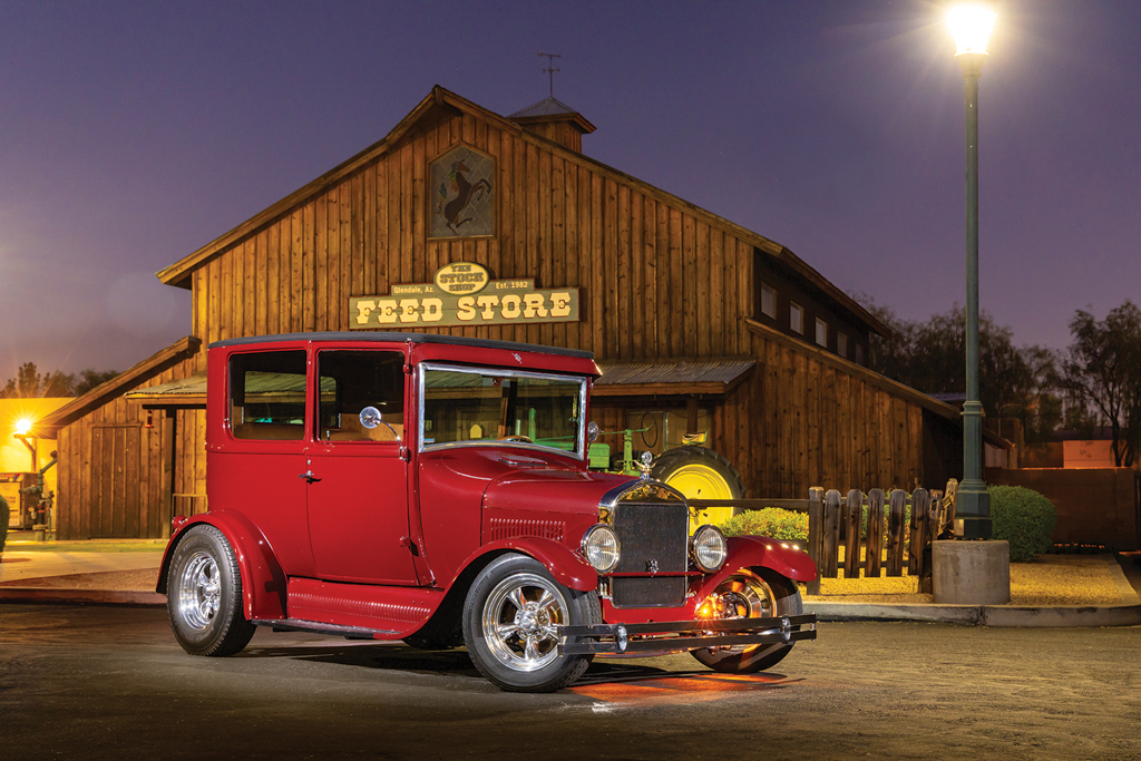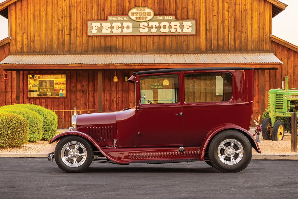 The 1926 Ford Model T sedan is all steel, just as it came from Henry back in the day. From here Lyle fit a Model A front visor, a 1929 Ford front bumper (although lowered and tucked), 1932 Ford door handles, and steel splash aprons punched with louvers by Chip. More custom treatments include the 1935-40 Ford-style mirror stems with Model A mirrors attached and a homemade custom-dropped headlight bar that holds up the stock Model T lighting—note the front and rear lighting are all LED. The four-piece hood is a Rootlieb with side louvers. There was plenty of bodywork to be done but the necessary patch panels were handled by Lyle. The final bodywork was conducted at Ultimate Collision, and it was they, too, who applied the burgundy base coat followed by the clearcoat.