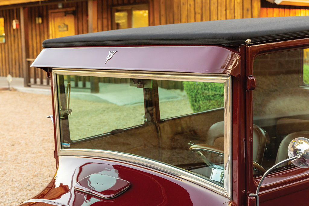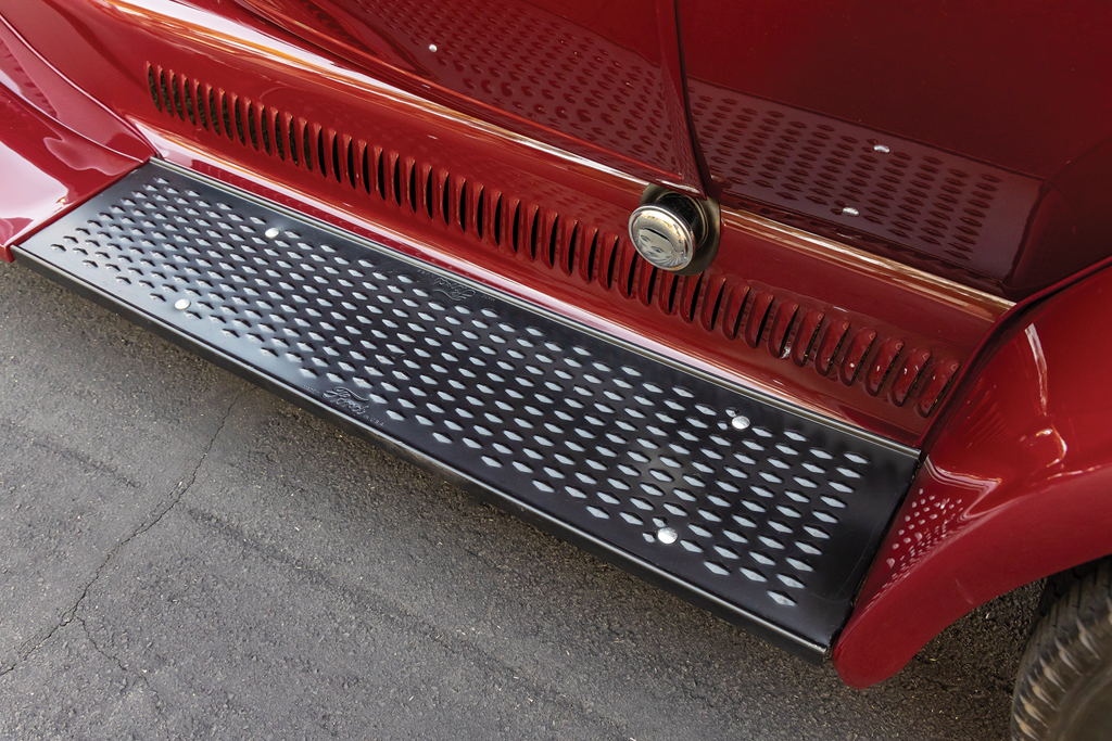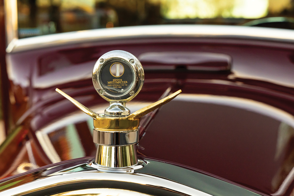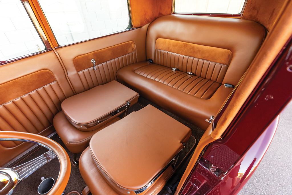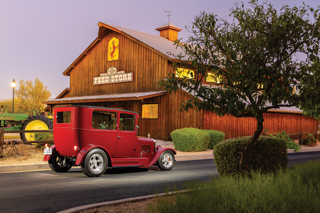 The 1926 Ford Model T sedan is all steel, just as it came from Henry back in the day. From here Lyle fit a Model A front visor, a 1929 Ford front bumper (although lowered and tucked), 1932 Ford door handles, and steel splash aprons punched with louvers by Chip. More custom treatments include the 1935-40 Ford-style mirror stems with Model A mirrors attached and a homemade custom-dropped headlight bar that holds up the stock Model T lighting—note the front and rear lighting are all LED. The four-piece hood is a Rootlieb with side louvers. There was plenty of bodywork to be done but the necessary patch panels were handled by Lyle. The final bodywork was conducted at Ultimate Collision, and it was they, too, who applied the burgundy base coat followed by the clearcoat.
