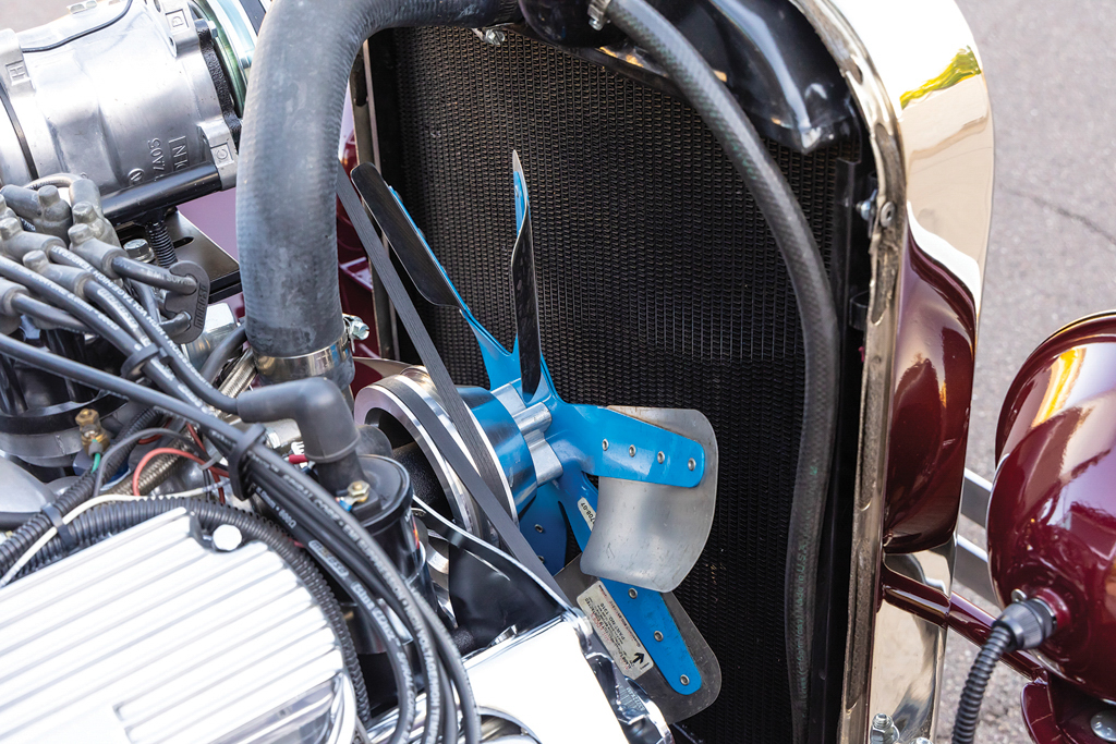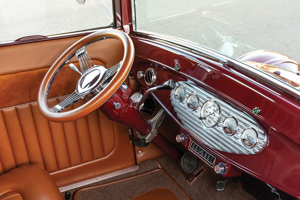 Inside the stock Model T dash top surrounds a 1932 Ford dash and aftermarket insert that is filled with AutoMeter gauges, Vintage Air controls and air registers as well as the ignition switch. Lyle fitted the Painless Performance Products wiring kit as well as installed the Vintage Air system. The Peterbilt air condenser, complete with its cooling fans and shroud (owner fabricated), is installed behind the passenger side splash apron. The tach is mounted to the bottom of the dash and to the left of the GM truck tilt steering column that is topped with a Speedway Motors three-spoke banjo steering wheel. We should note that the column is held in position with a connecting rod serving as the column drop. The front buckets are Model A with custom-made stainless trim to mimic a mid-’60s-looking Chevy Impala. (That’s an L.A. Roadsters Show mug resting on the floor between the seats.) The rear seat is a 1926 Ford Model T. The seating is covered in Chestnut vinyl, the headliner is Chestnut Suede, and the carpeting is German square weave all done by hot rod upholsterer supreme Glenn Kramer of Hot Rod Interiors by Glenn in Arizona.