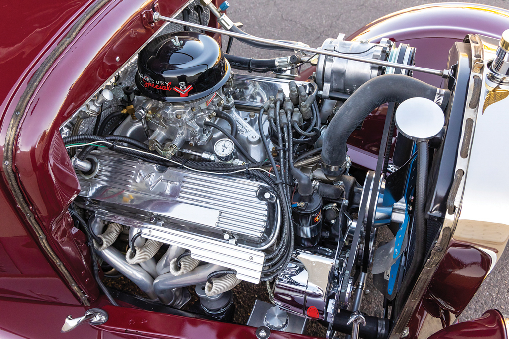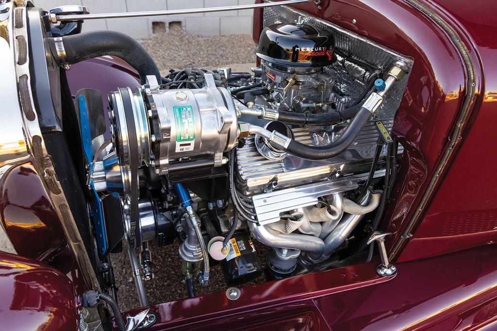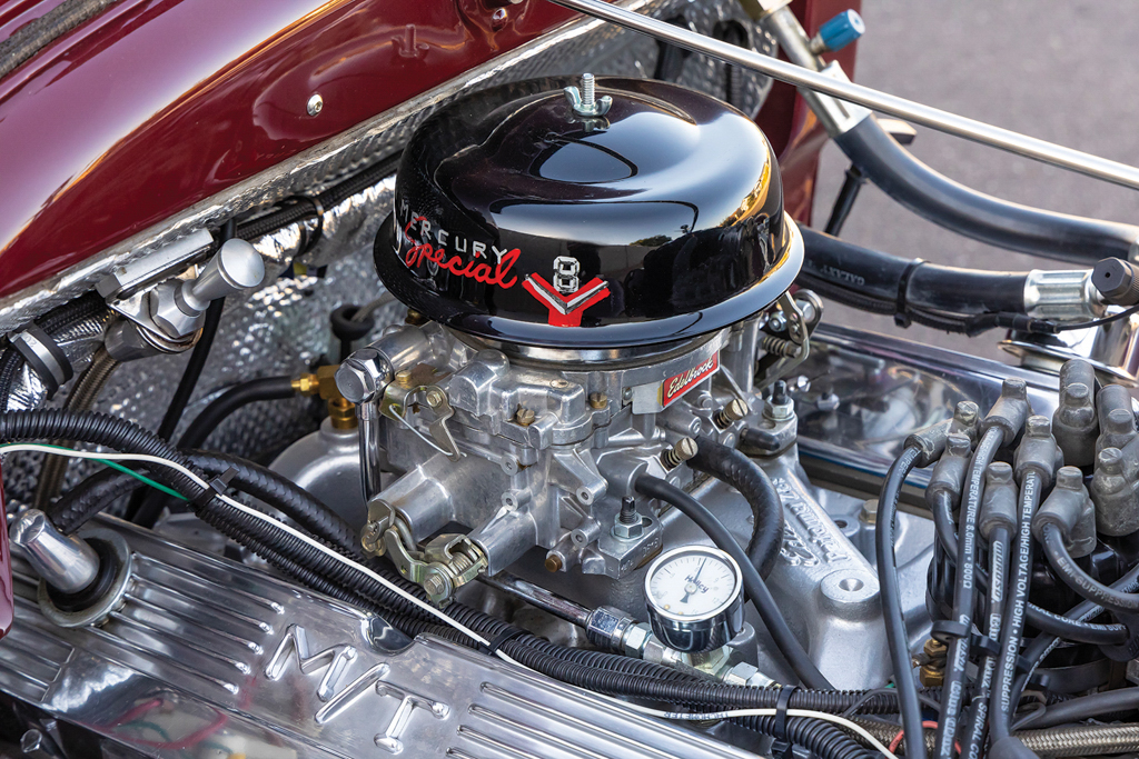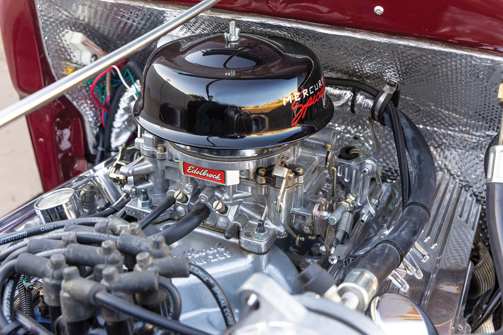 Power for the tall T comes by way of a 5.0L (302 inches) V8 that began its life as an EFI motor. It didn’t take Lyle long to replace the EFI with an Street Master Edelbrock intake manifold and 500-cfm four-barrel carburetor with an inline Holley fuel gauge. The air cleaner is a Speedway Motors piece that was then hand painted with a “Mercury Special V8” logo while the polished valve covers are the old-school Mickey Thompson (M/T) model. Ignition comes by way of a PerTronix distributor with 8mm Moroso spark plug wires, a Powermaster alternator, Ford starter, and is lit by an Optima RedTop battery. Coated Sanderson shorty (1-7/8-inch) headers are used along with a 2-1/4-inch exhaust pipe running back to a single Flowmaster muffler. The transmission is a 1966 Ford C4 with a Hughes Street Master 2,500-rpm stall speed converter.