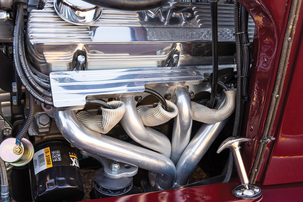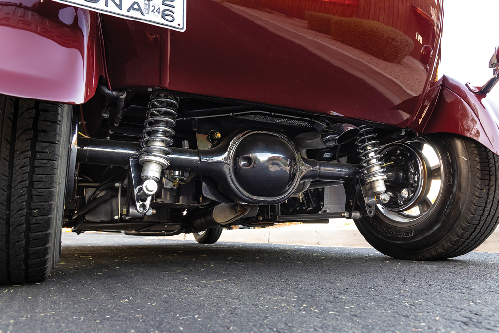The suspension consists of a Pete and Jakes four-bar frontend with a SO-CAL Speed Shop–supplied 4-inch drop I-beam axle, chrome tube shocks with early Ford spindles, and SO-CAL steering arms. The front transverse leaf spring features reversed eyes and has “buttons” between the leaves to ease the ride. The rack-and-pinion steering is a 1969 Mustang quick ratio that is twisted into action through a 1969 GM truck tilt steering column. Outback is a 1971 Maverick 8-inch rear end along with a 2.78 ring-and-pinion and stock axles, an owner-built Panhard bar and AFCO coilovers from Speedway Motors are used in the back.