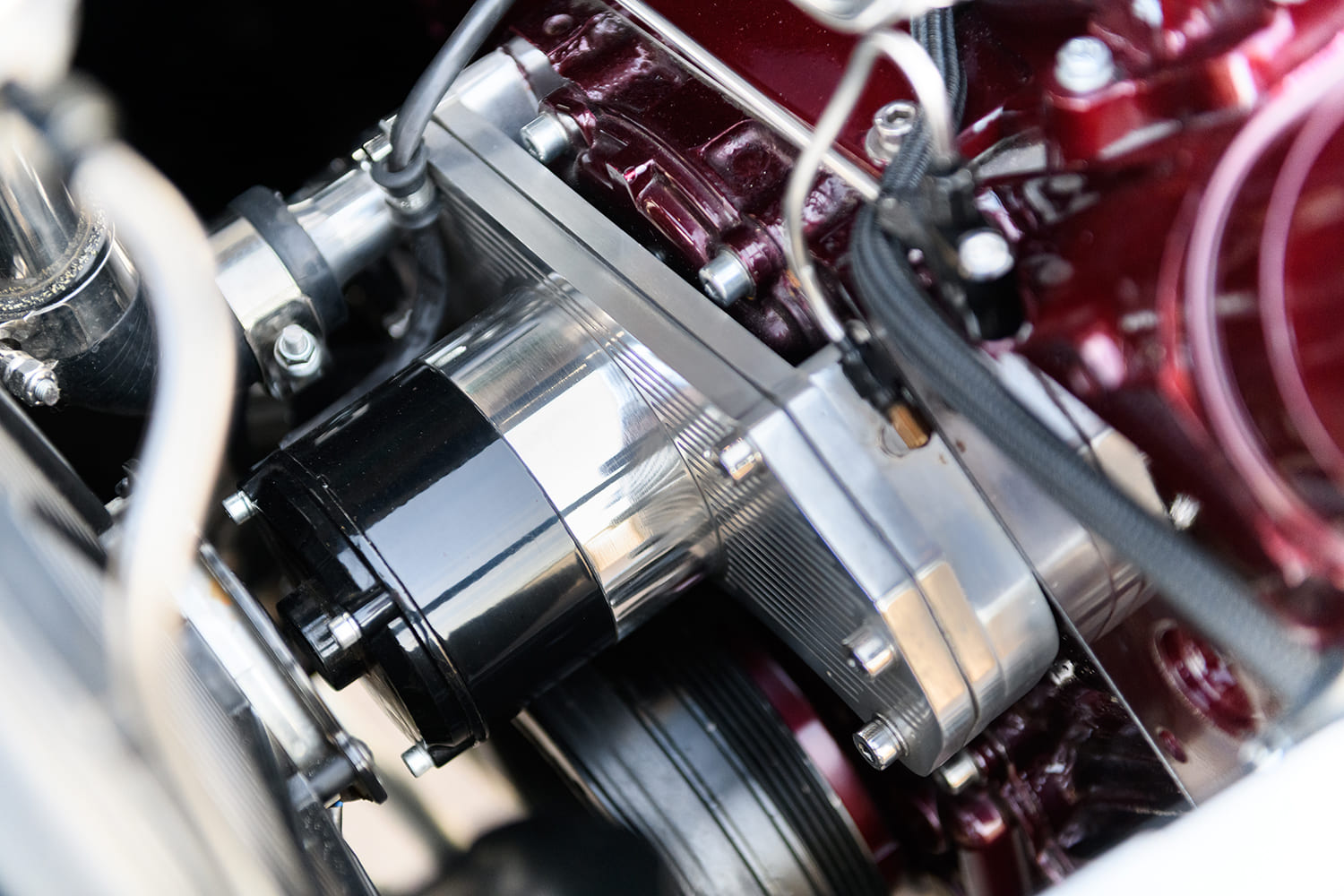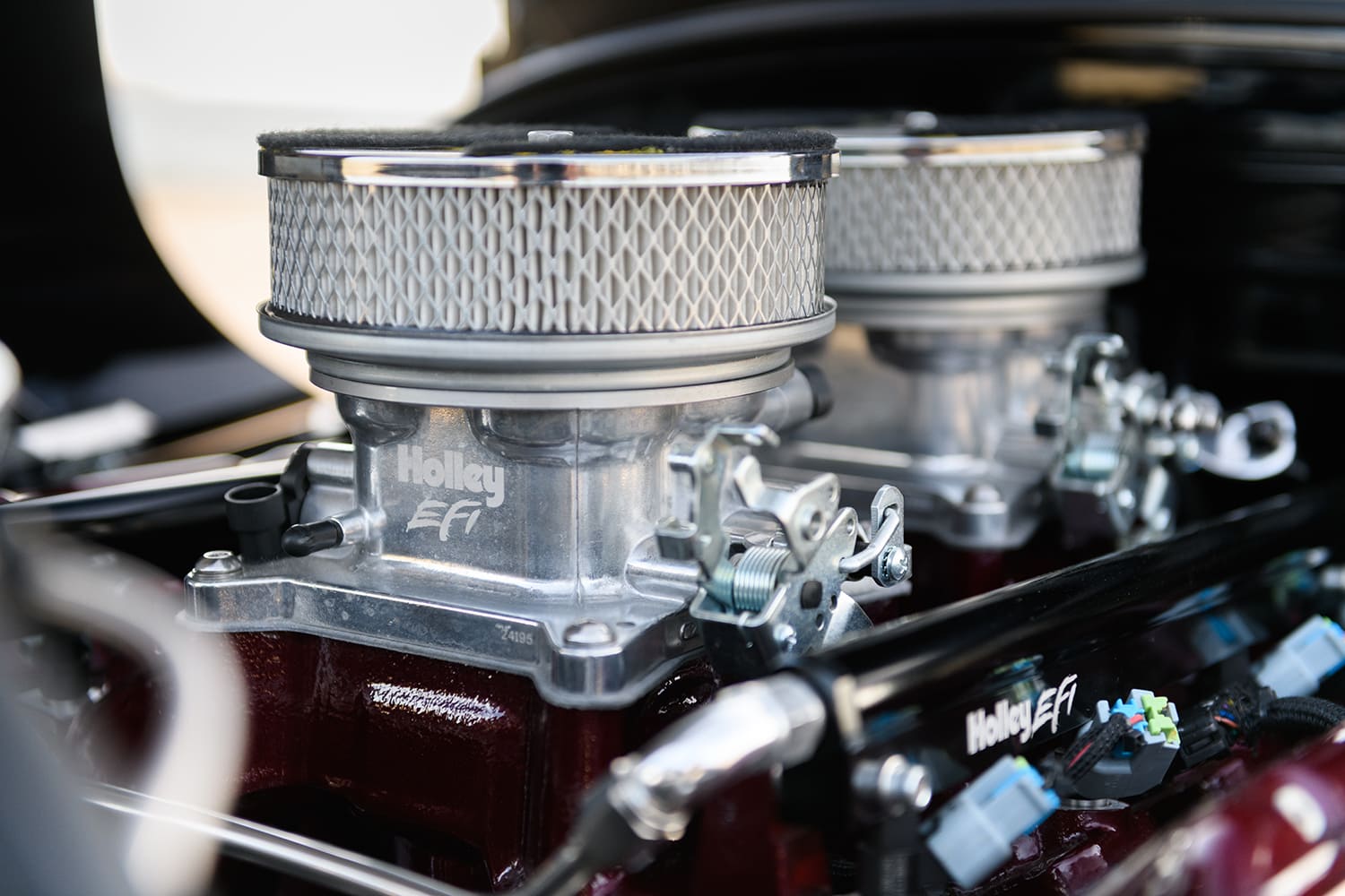 Power for the channeled sedan comes from a 6.0L LS engine, which has been used for years, particularly in GM’s truck line. It features an iron block with aluminum heads, delivering a respectable and reliable 325 hp. John sanded the block smooth and painted it in House of Kolor burgundy. While the internals remain factory, the exterior has received careful attention and enhancements. For instance, the induction system is Holley-based, utilizing a dual-plane intake and a pair of Holley throttle bodies, totaling 1,000 cfm. A Holley 100-gph inline electric fuel pump is used in conjunction and is designed initially for naturally aspirated and EFI-equipped engines. Holley valve covers conceal the MSD coils atop the factory heads using Texas Speed plug wires. Block Hugger headers connect to 2-1/2-inch ceramic-coated pipes that tie into Flowmaster mufflers. Engine accessories include a JEGS electric water pump, a Derale electric fan and heat sync fluid coolers, an LS starter, an OPTIMA battery beneath the rear seating, and the custom aluminum 15-gallon gas tank. Along with the LS is a 4L60E overdrive trans equipped with a Lokar floor shifter and an Inland Empire Driveline driveshaft.
