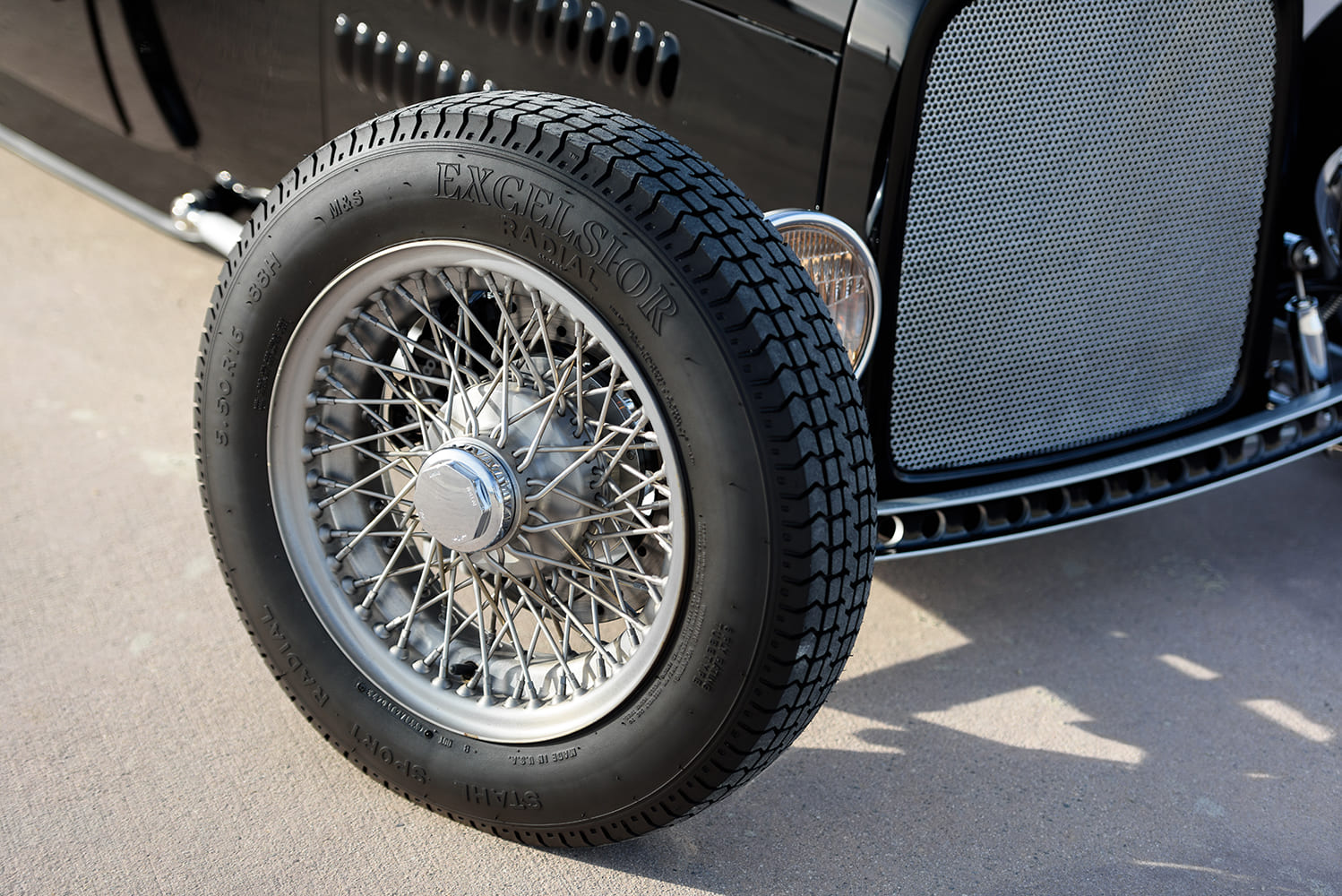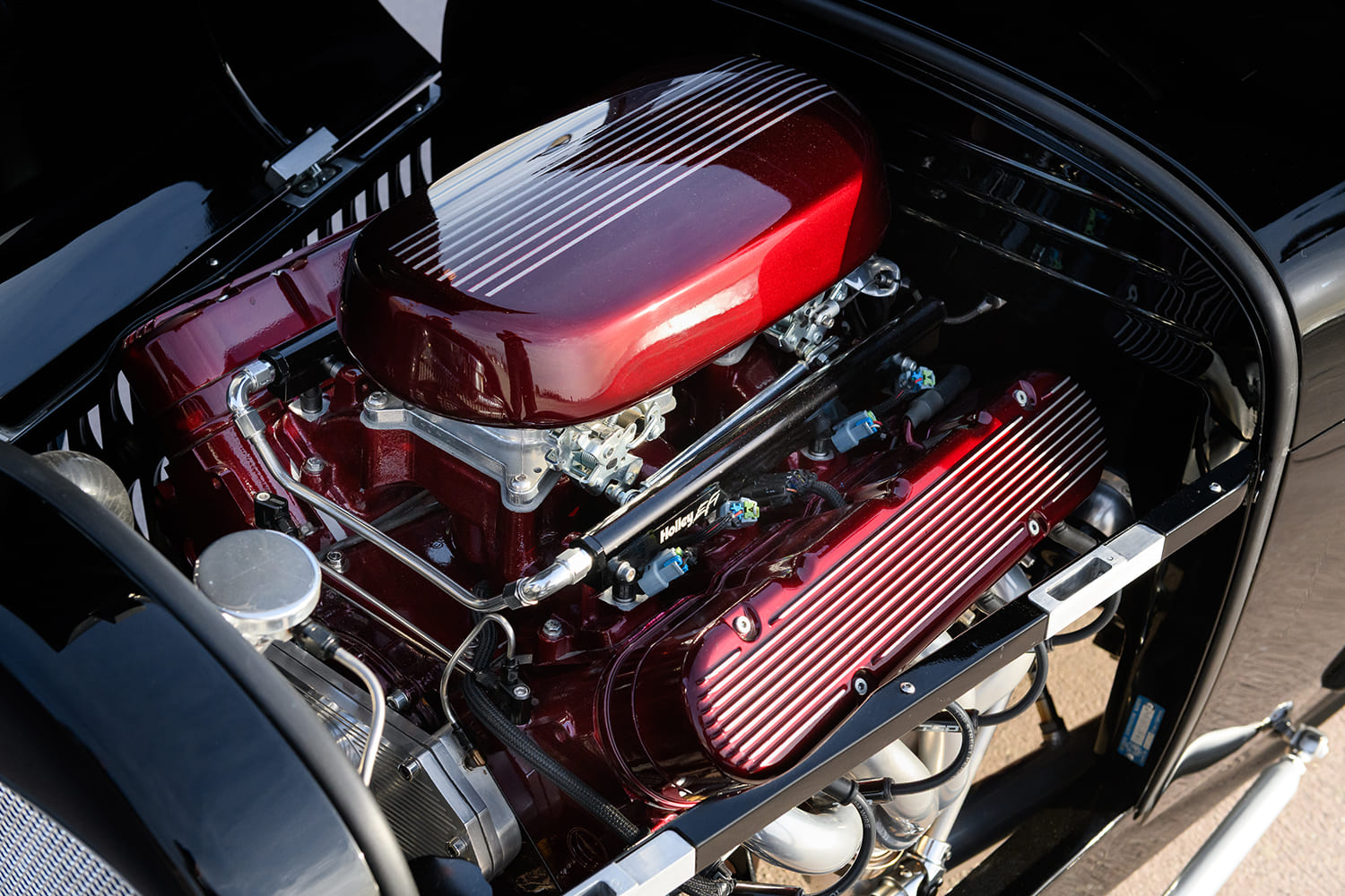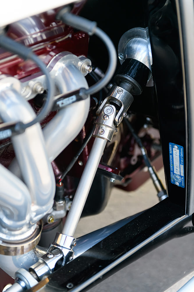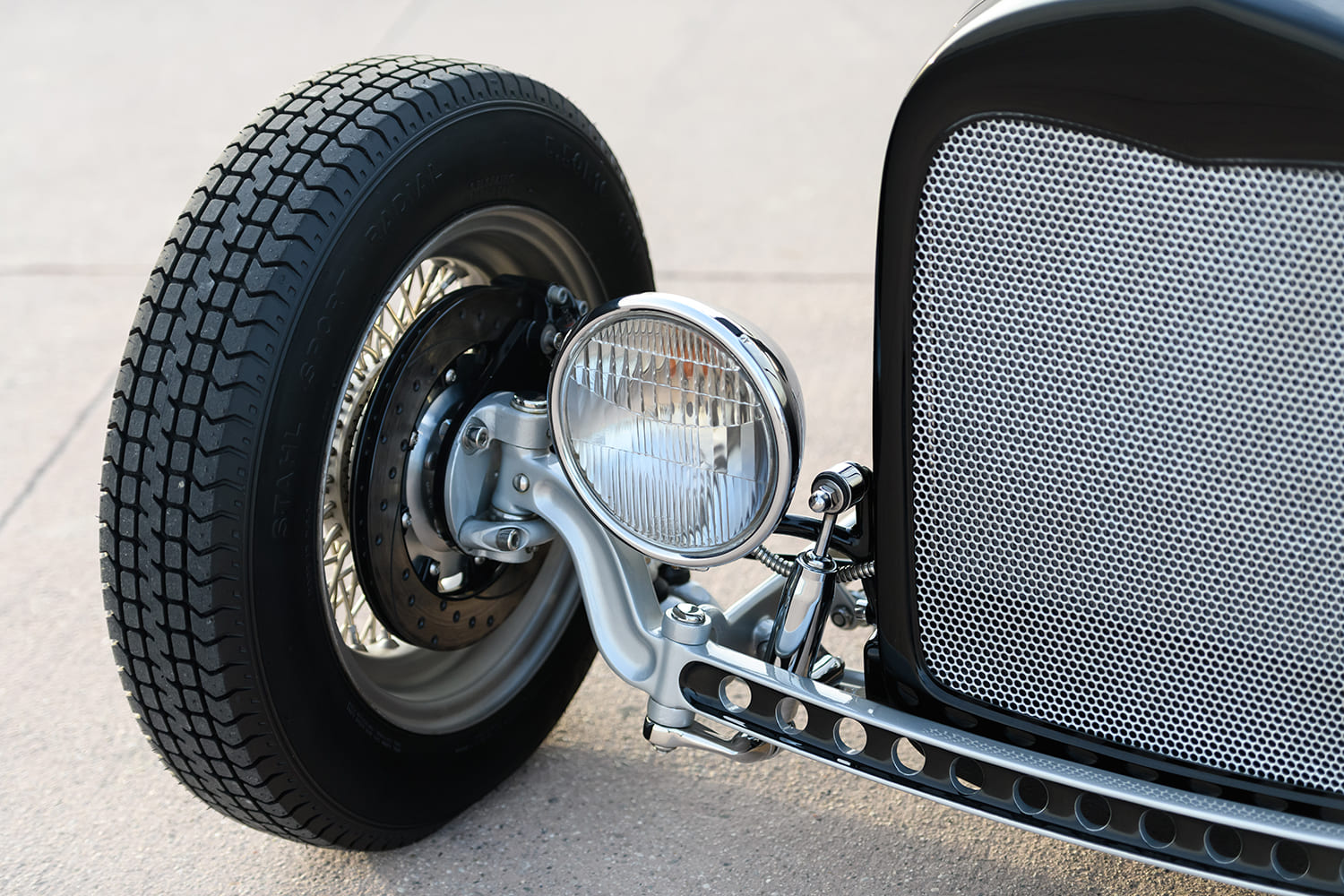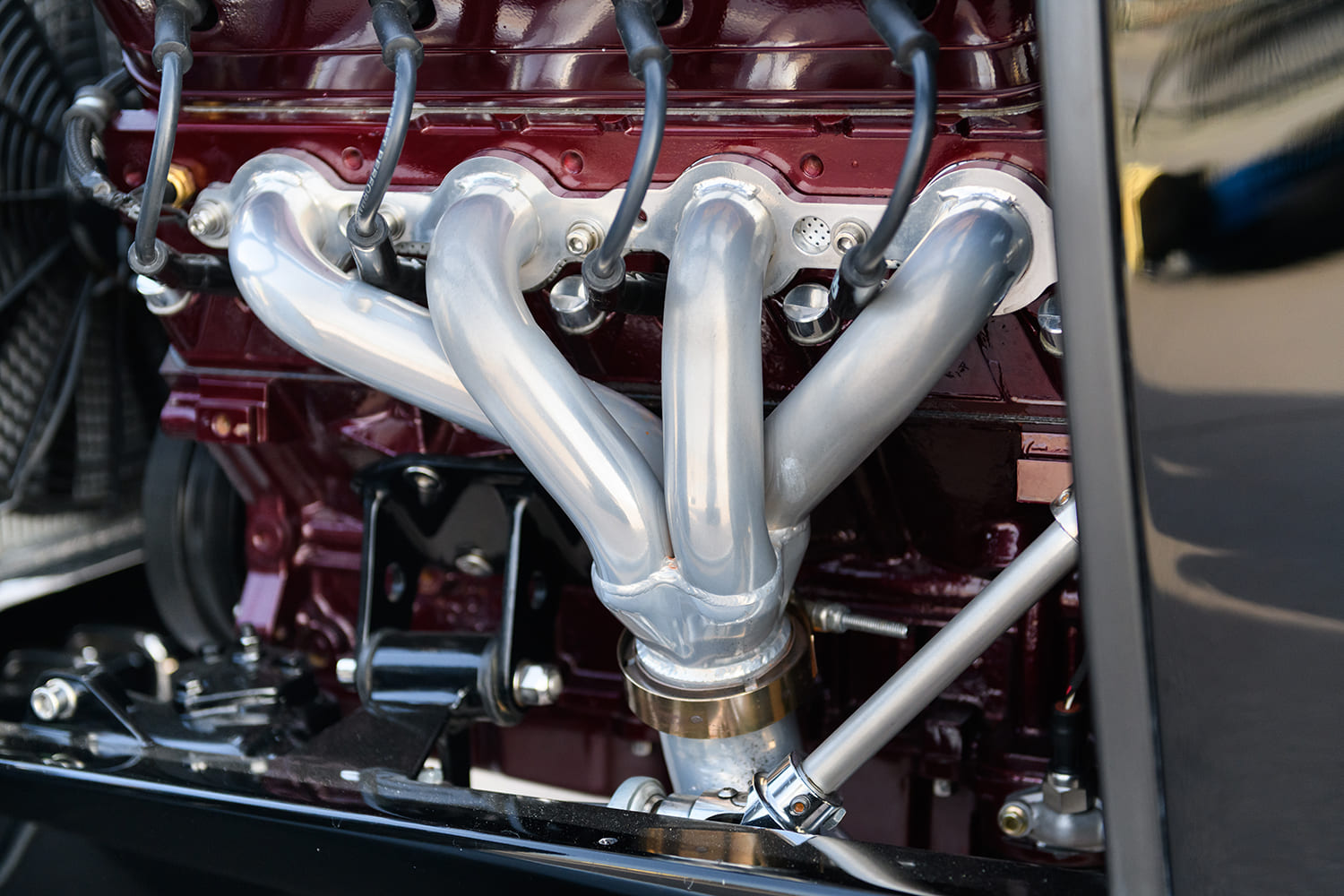 The chassis started as a SO-CAL Speed Shop 1932 Ford frame with an enhanced 110-inch wheelbase. John pinched the front portion of the framerails, bobbed the framehorns to achieve a low overall ride height, and positioned the I-beam axle (“suicide”) out front. At the rear, the frame was kicked up 6 inches. These modifications raised the powertrain package by 4 inches, and the steering box was also repositioned 2 inches upward on the frame, providing essential ground clearance. The front suspension features a SO-CAL drilled I-beam axle, chromed front tube shocks, and a Vega-style steering box. The rear axle is a Ford 9-inch with a limited-slip 4.88 ring-and-pinion. Can you say acceleration! The housing is centered using a custom four-link setup and Afco adjustable coilover shocks. Bringing this hot rod to a rest is a Wilwood brake system based on a master cylinder and Wilwood 11-inch rotors and calipers.
