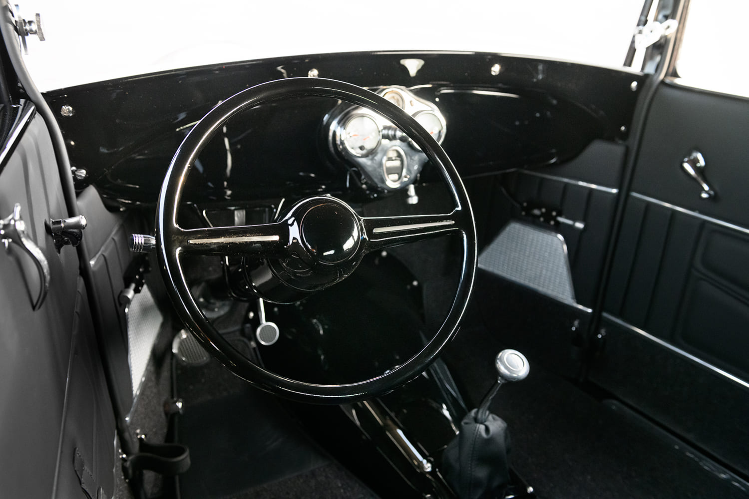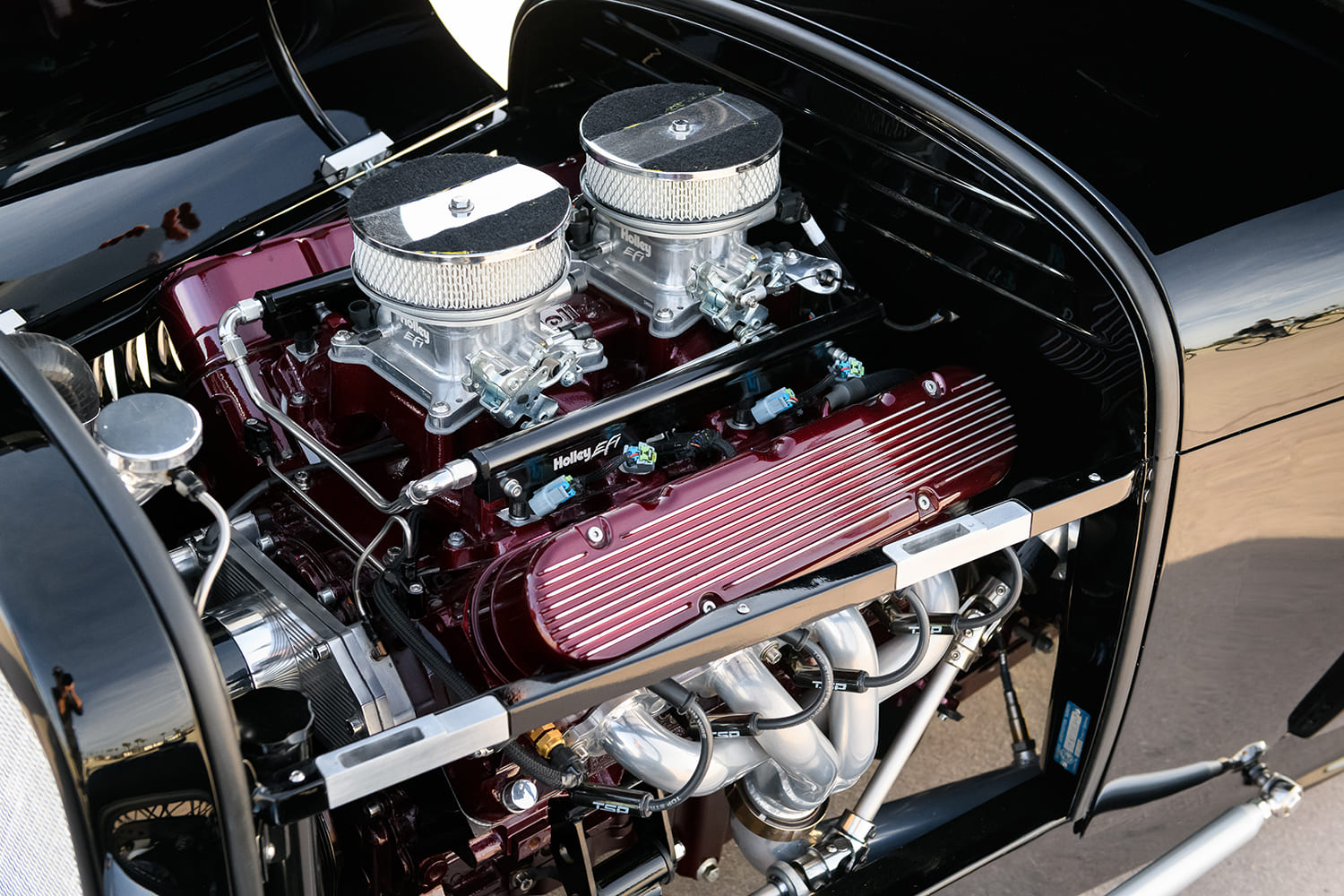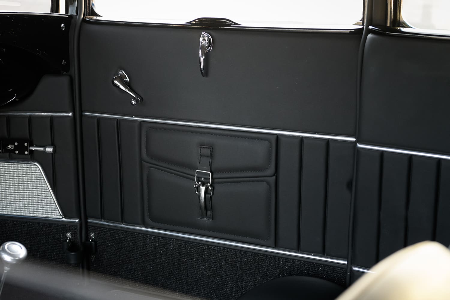 The interior features a stock Model A dash paired with Auto Meter gauges, integrated with the hot rod’s electrical needs through Painless Performance Products wiring, all managed by John. Additional features include a Lokar floor shifter mounted to a sheetmetal trans cover painted in body black, along with pedals for the throttle, brake, and high-beam switch. The Ultimate Performance steering column is affixed to the dash and sports a 1940 Ford wheel. The seating is based on 1929 Ford seat frames, shortened by 3 inches and wrapped in black leather by Joe’s Deluxe Interiors. Joe’s also installed the gray headliner and the “salt and pepper coloring” in gray and black carpeting. The storage area in the back showcases the custom baggage that rests atop the hidden compartments containing the battery and gas tank.