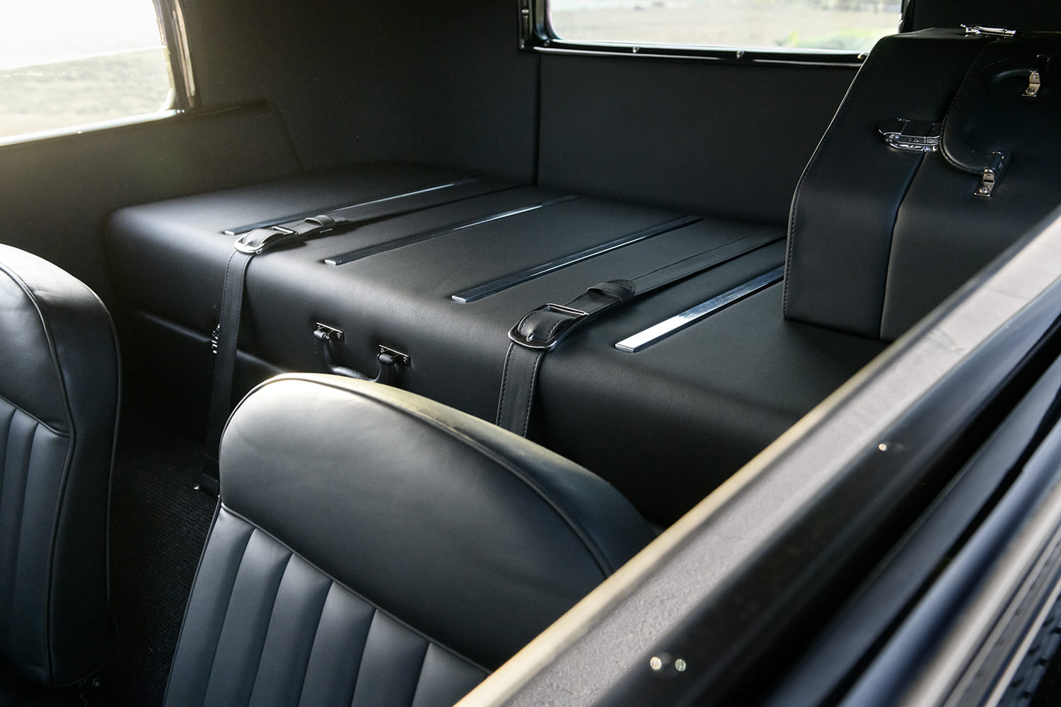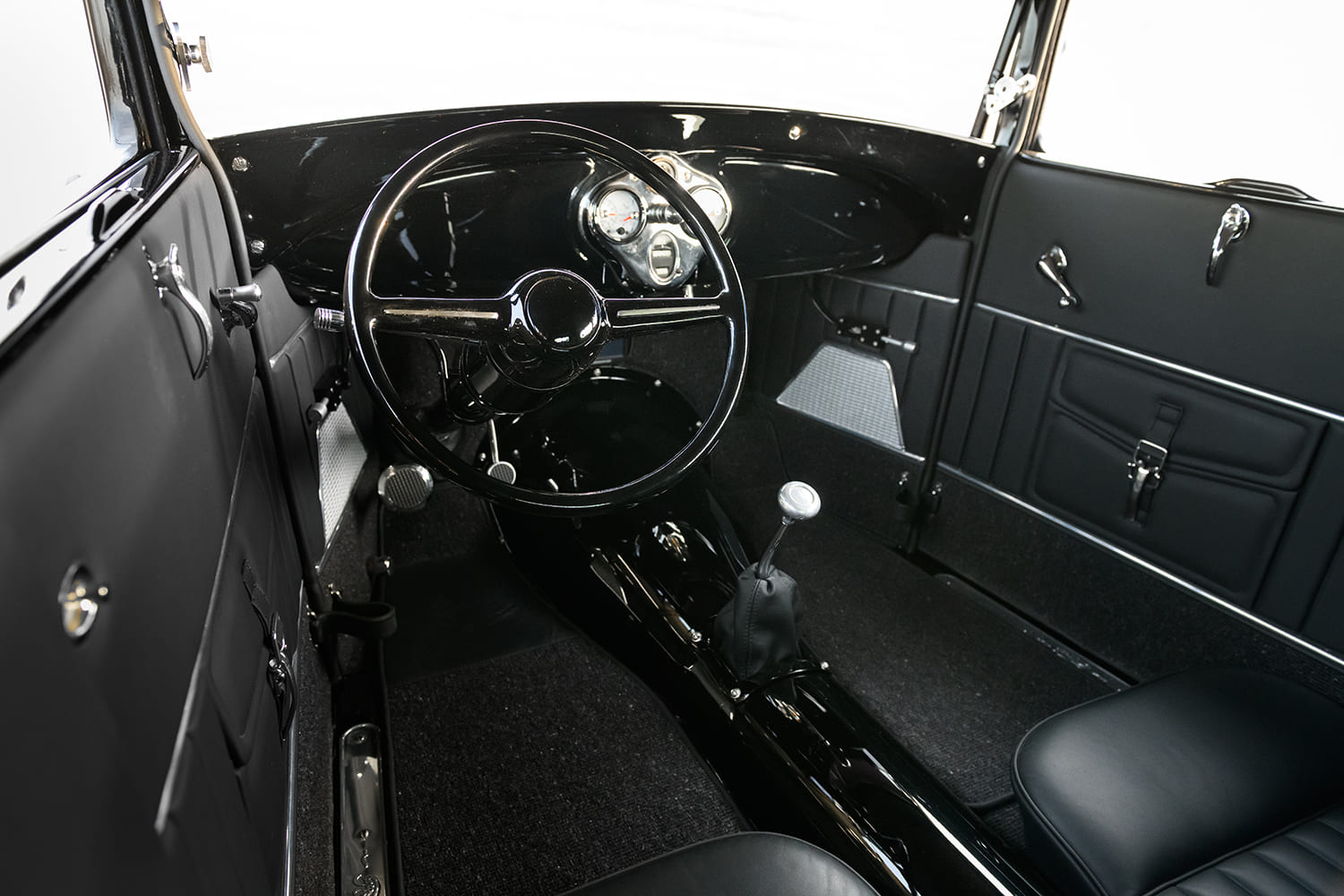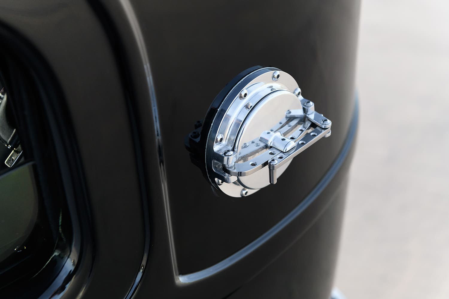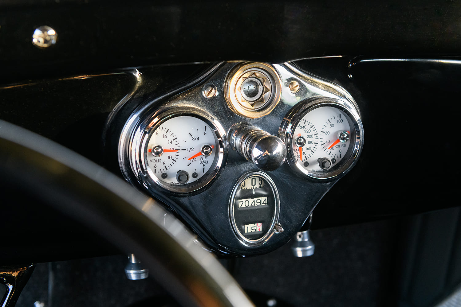 The interior features a stock Model A dash paired with Auto Meter gauges, integrated with the hot rod’s electrical needs through Painless Performance Products wiring, all managed by John. Additional features include a Lokar floor shifter mounted to a sheetmetal trans cover painted in body black, along with pedals for the throttle, brake, and high-beam switch. The Ultimate Performance steering column is affixed to the dash and sports a 1940 Ford wheel. The seating is based on 1929 Ford seat frames, shortened by 3 inches and wrapped in black leather by Joe’s Deluxe Interiors. Joe’s also installed the gray headliner and the “salt and pepper coloring” in gray and black carpeting. The storage area in the back showcases the custom baggage that rests atop the hidden compartments containing the battery and gas tank.
