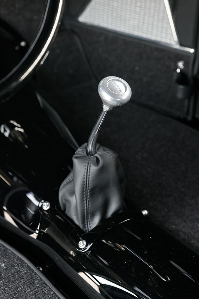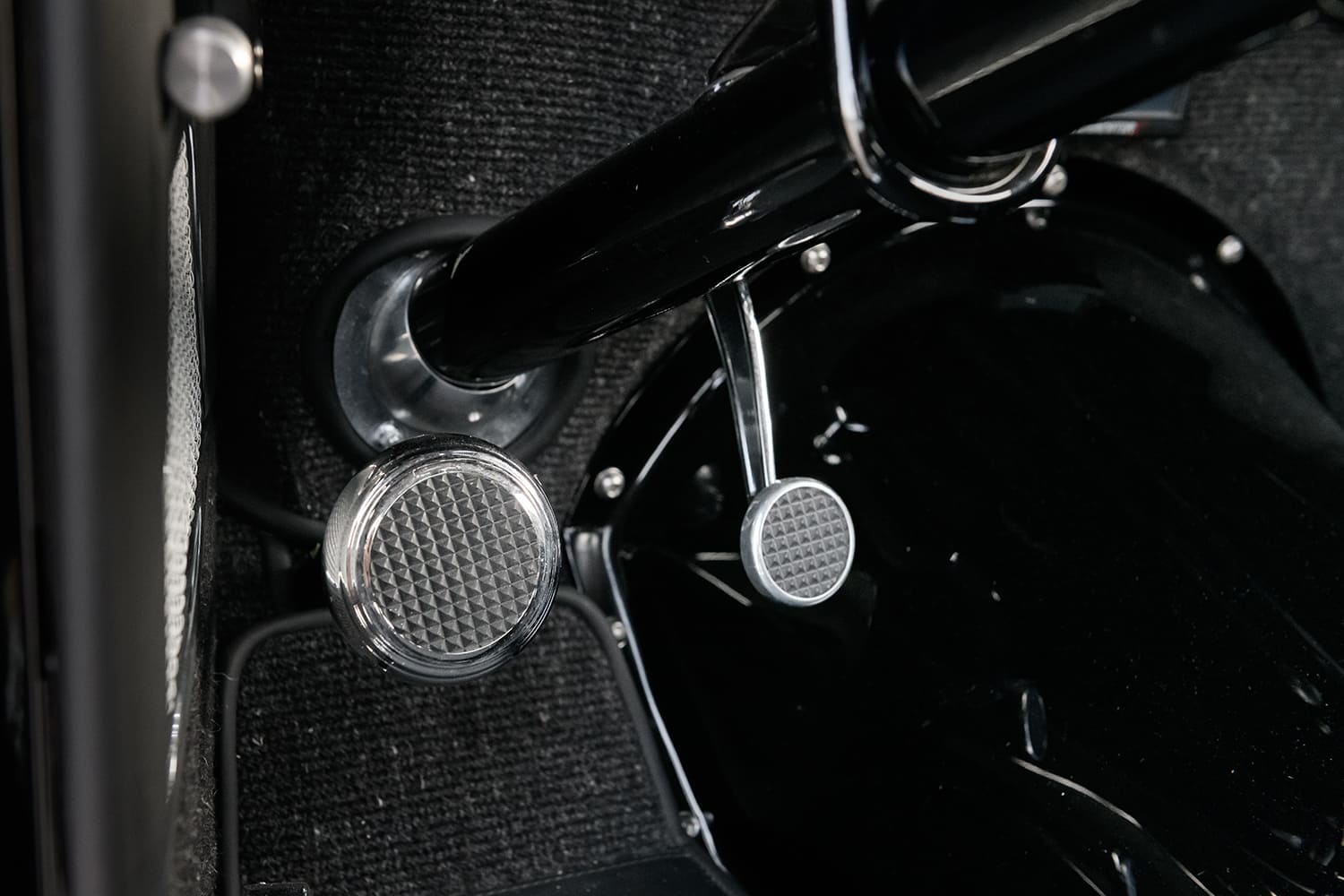 The wheel and tire combination features Dayton cross-lace knockoffs (144 stainless steel spokes) measuring 16×4.5 in the front and 18×5 in the back. Additionally, the Excelsior Sport Radial by Coker measures 5.50R16 and 7.00R18. An interesting aspect of the nuts and bolts used throughout is that all the stainless steel hardware is polished. While this isn’t new, seeing it against an all-black hot rod adds a nice touch.