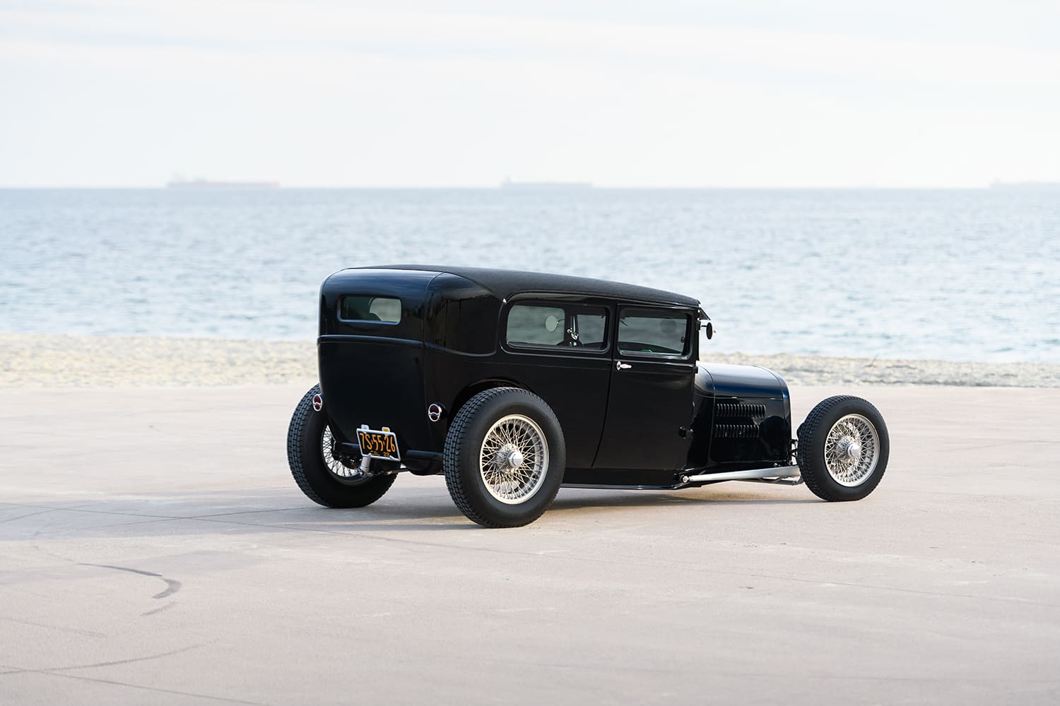 The sheetmetal of the two-door sedan, over 95 years old, features a 5-inch top chop and is channeled over the frame by 1-1/2 inches. Another noticeable body modification is the raising of the rear wheelwells by 6 inches and mini-tubbing by 2 inches. Additional modifications include filling in the cowl where the gas tank opening once existed, a smoothed grille shell (now lowered), and a pair of custom-mounted Model A taillights positioned in the corners of the rear quarter-panels. The firewall is recessed and smoothed, featuring a new steel floor. The radiator was then shortened by 4-1/2 inches. John fabricated the hood and side panels, which are now 3 inches longer, and Jimmy Shine louvered the hood side panels. From this point, John handled his own bodywork and then covered the prepped metal with House of Kolor two-stage acrylic enamel in Pitch Black.