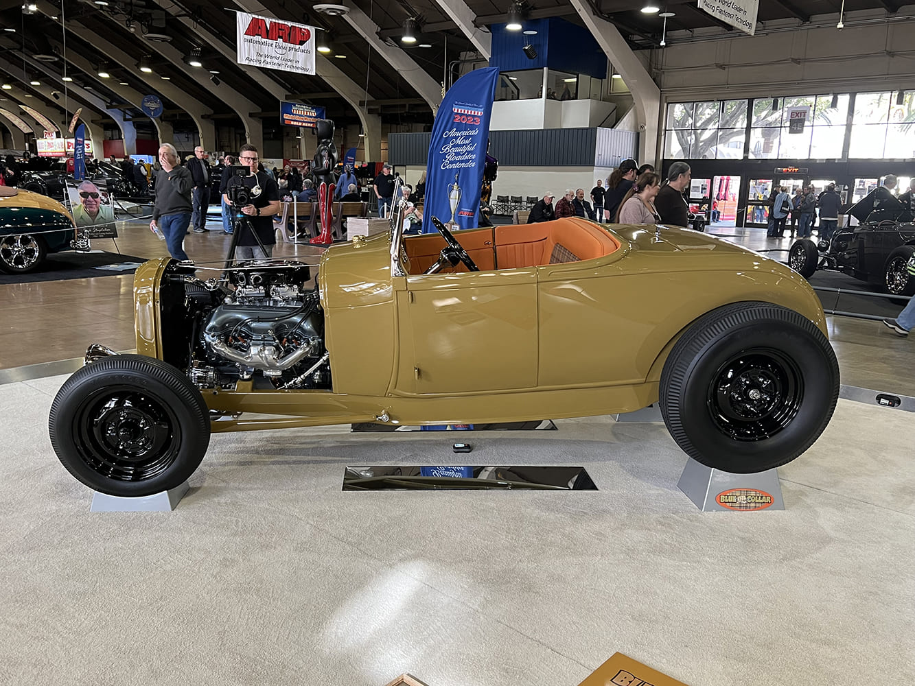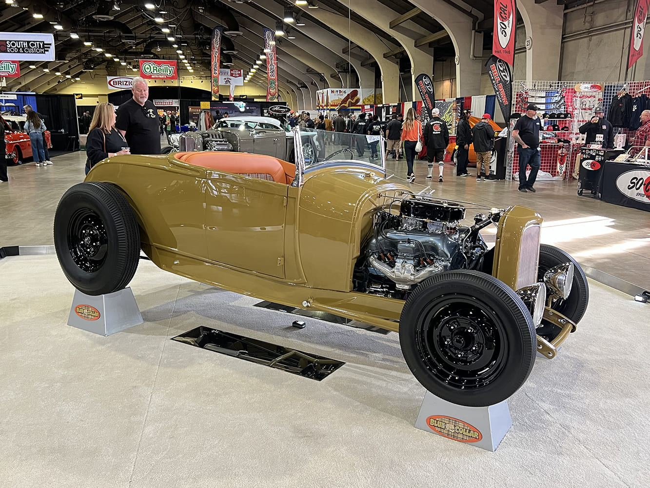 Before you is his ride, a Model Eh roadster brought here a few years ago to the Grand National Roadster Show to compete for America’s Most Beautiful Roadster (AMBR) award. Known as “JF,” he is no stranger to building incredible hot rods and winning prestigious awards. While his 1929 highboy roadster didn’t win the AMBR award, he built a Ridler-winning car in the past, solidifying his reputation as a top builder.