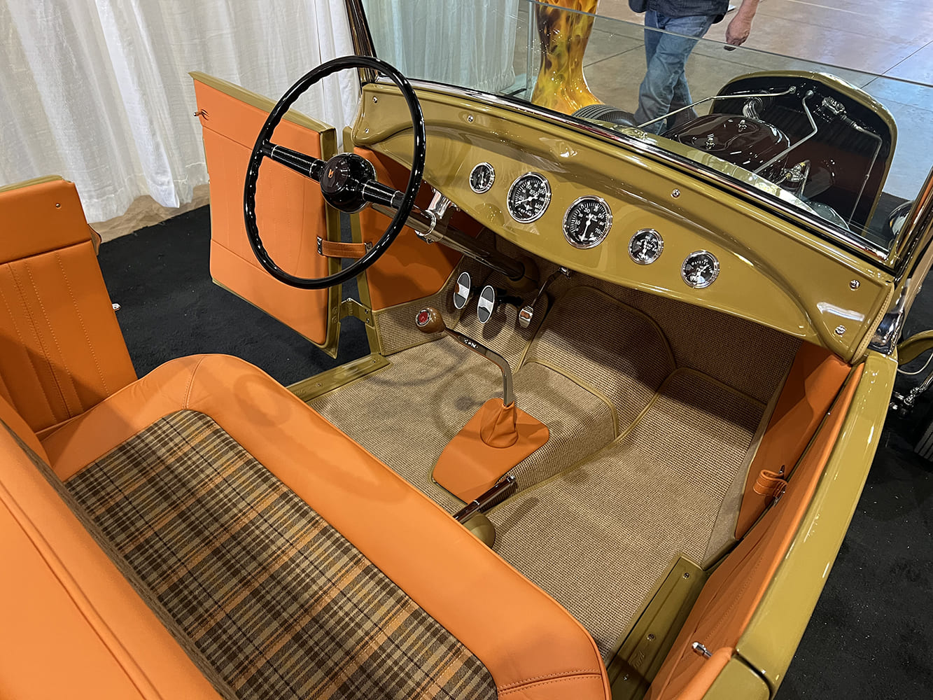 The Spartan interior boasts a 1932 Ford dashboard now fitted with a Stewart-Warner five-gauge package (speedometer, tachometer, fuel, water, oil pressure) and showcases a 1940 Ford steering column that supports a stock 1940 Ford wheel with its flat-faced, two-spoke design. Gary Yorston wired an American Autowire kit into place. Lee Baxter fabricated the single bench seat and received approval to stitch it in orange leather with a plaid insert through his company Lee Baxter Hot Rod Interiors.