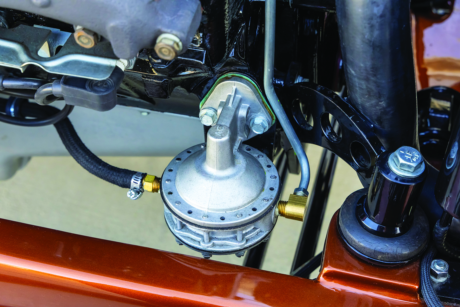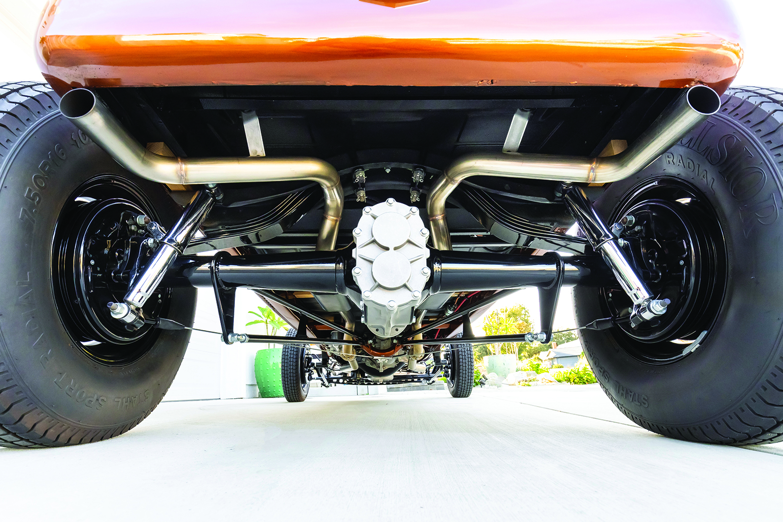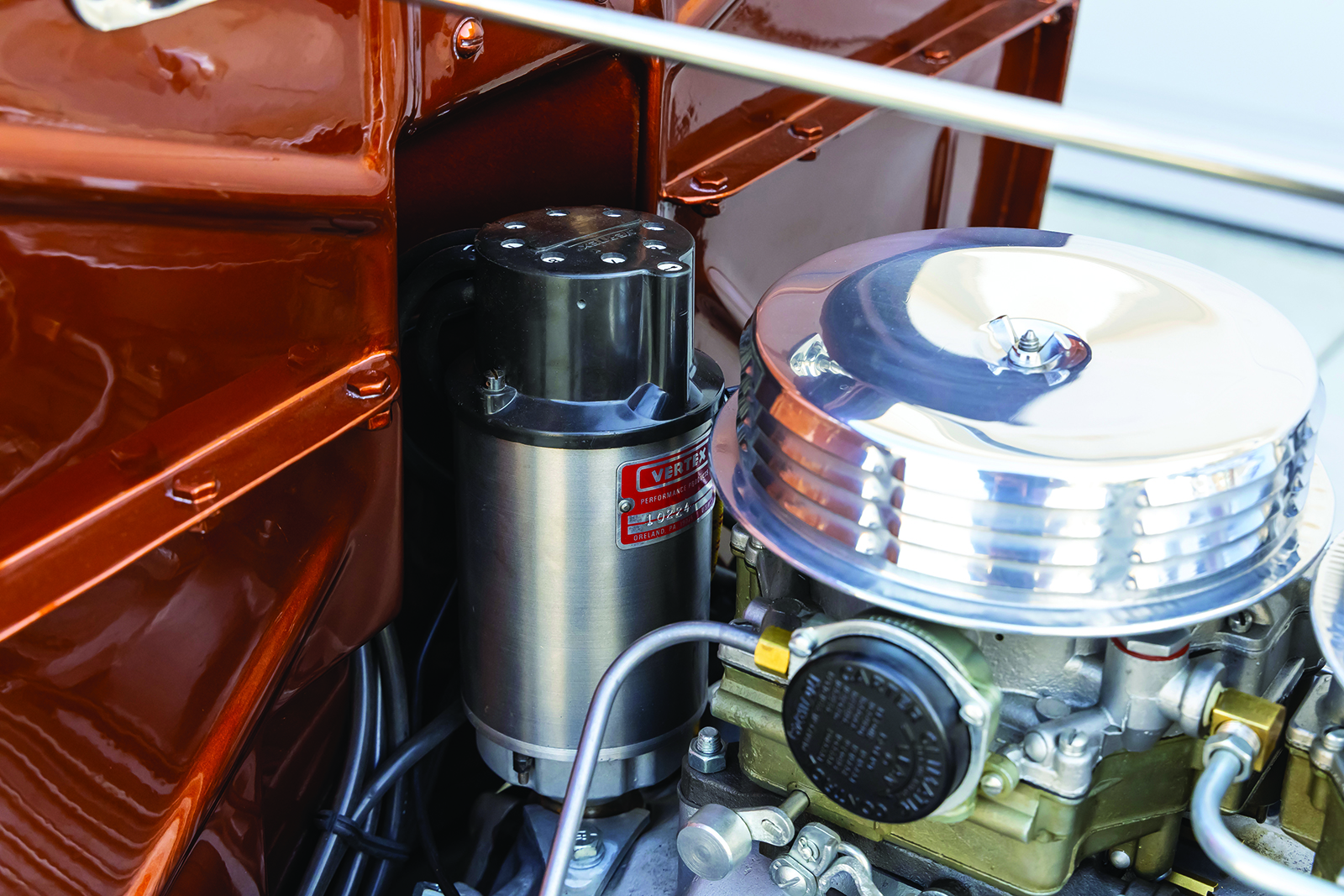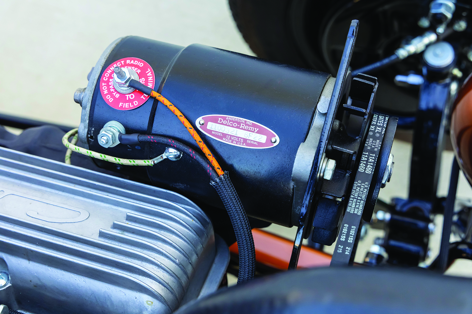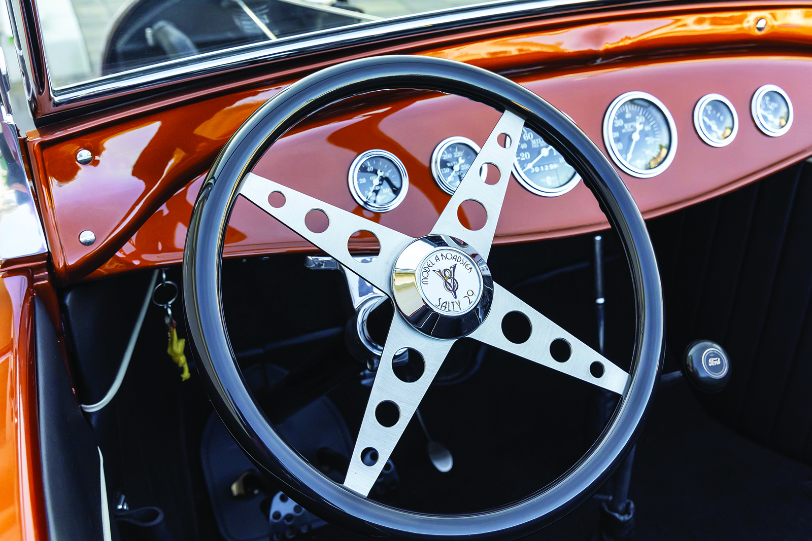 The body is a vintage 1929 Ford Model A roadster and features a 2-inch chopped windshield, the removal of the door handles, a notched firewall for magneto clearance, and removal of the cowl gas filler neck and cap. An aluminum flip-top gas cap (14-gallon stainless steel tank is now hidden in the trunk) was added and is located on the rear sail panel directly behind the driver’s head. In the back, a roll pan and OE 1942 Buick tail lights were added while in front Guide 903-J headlights (complete with brass ID tag) rest on custom stands that also serve as the upper shock mounts. The roadster does run minus a hood. From here the bodywork and paint were performed by Felix Sumano of Sumano’s Custom Painting in a Axalta Centari Cromax Pro waterborne basecoat in a Copper Penny color.