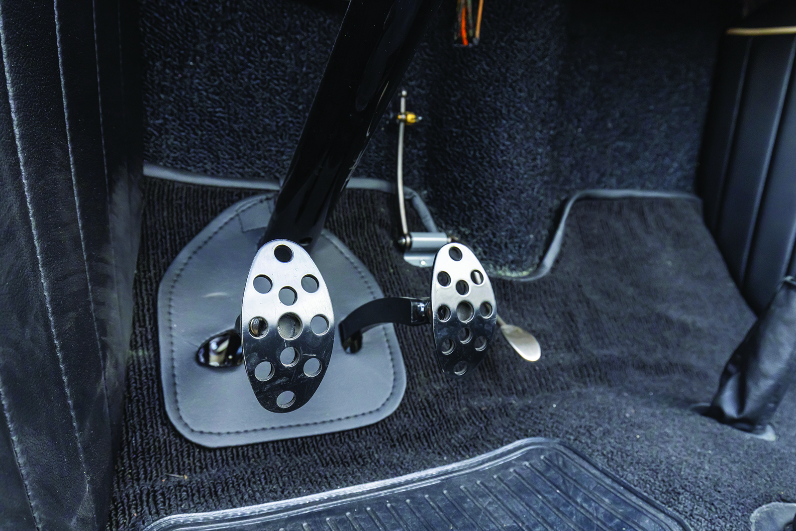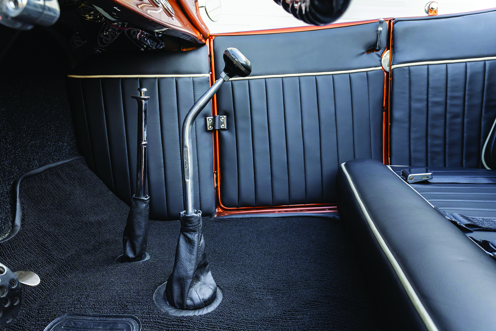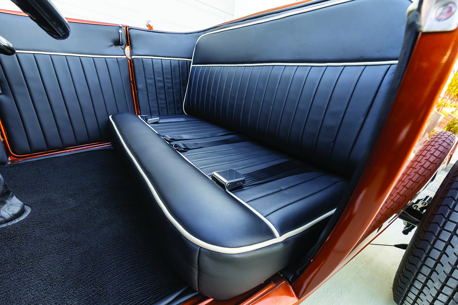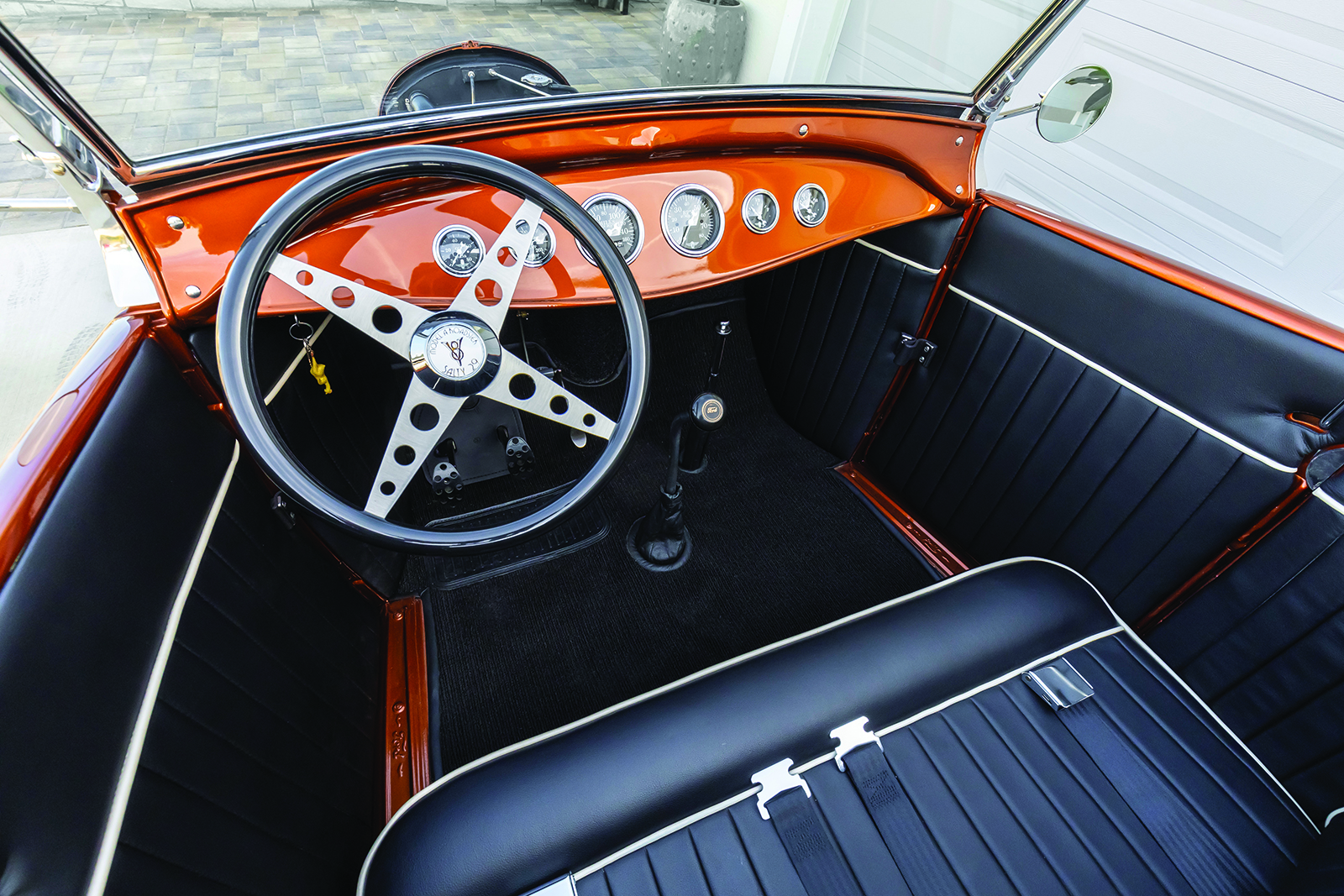 The “office” includes a Brookville Roadster dashboard with a stock Model A “eyebrow,” rooted within is a six-pack of Stewart-Warner “Wings” gauges. These vintage-looking gauges come in a speedo, engine rpm, oil pressure, water temp, gas level, and volt configurations. The LimeWorks steering column and its drop rest appropriately below the dash. The steering wheel is a vintage-looking drilled four-spoke CON2R with an engraved (Model A Roadster Salty ’29) horn button. The black vinyl with Pearl White piping by Mac’s Auto Upholstery covers the Wise Guys bench seat plus a pair of 3-inch-wide RetroBelt seat belts.