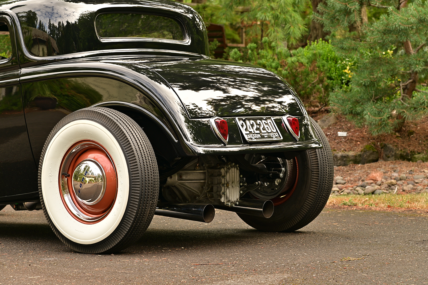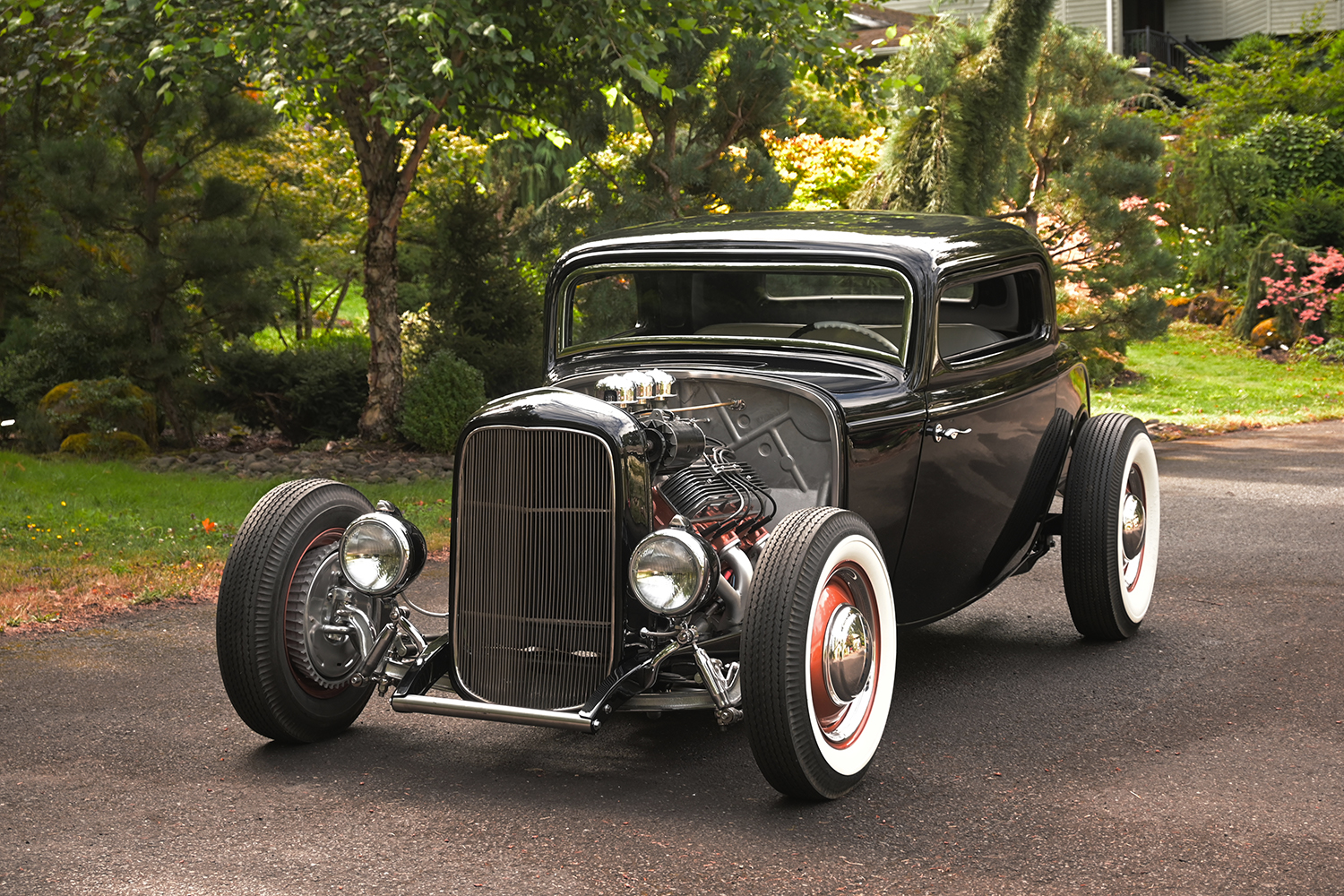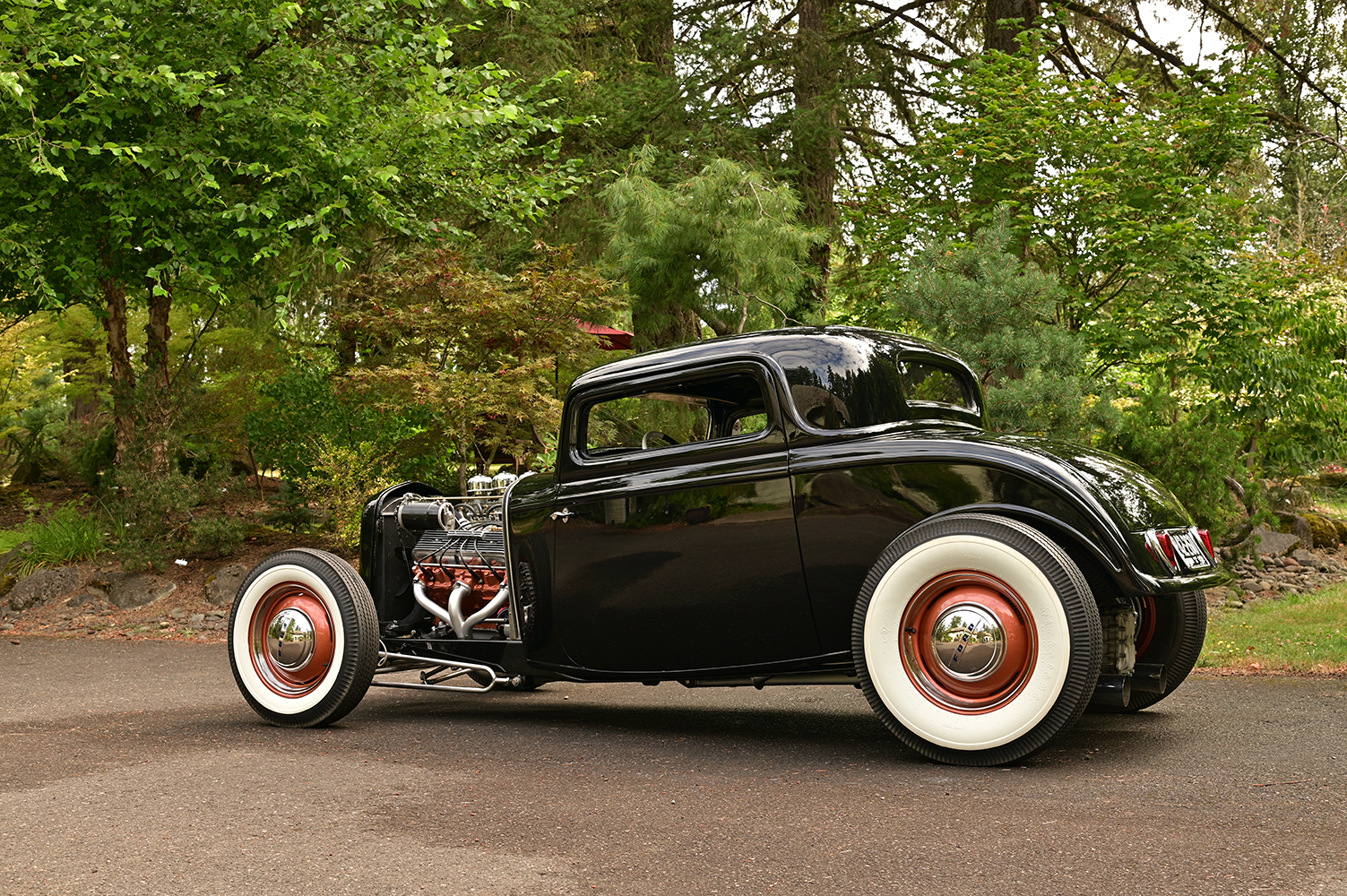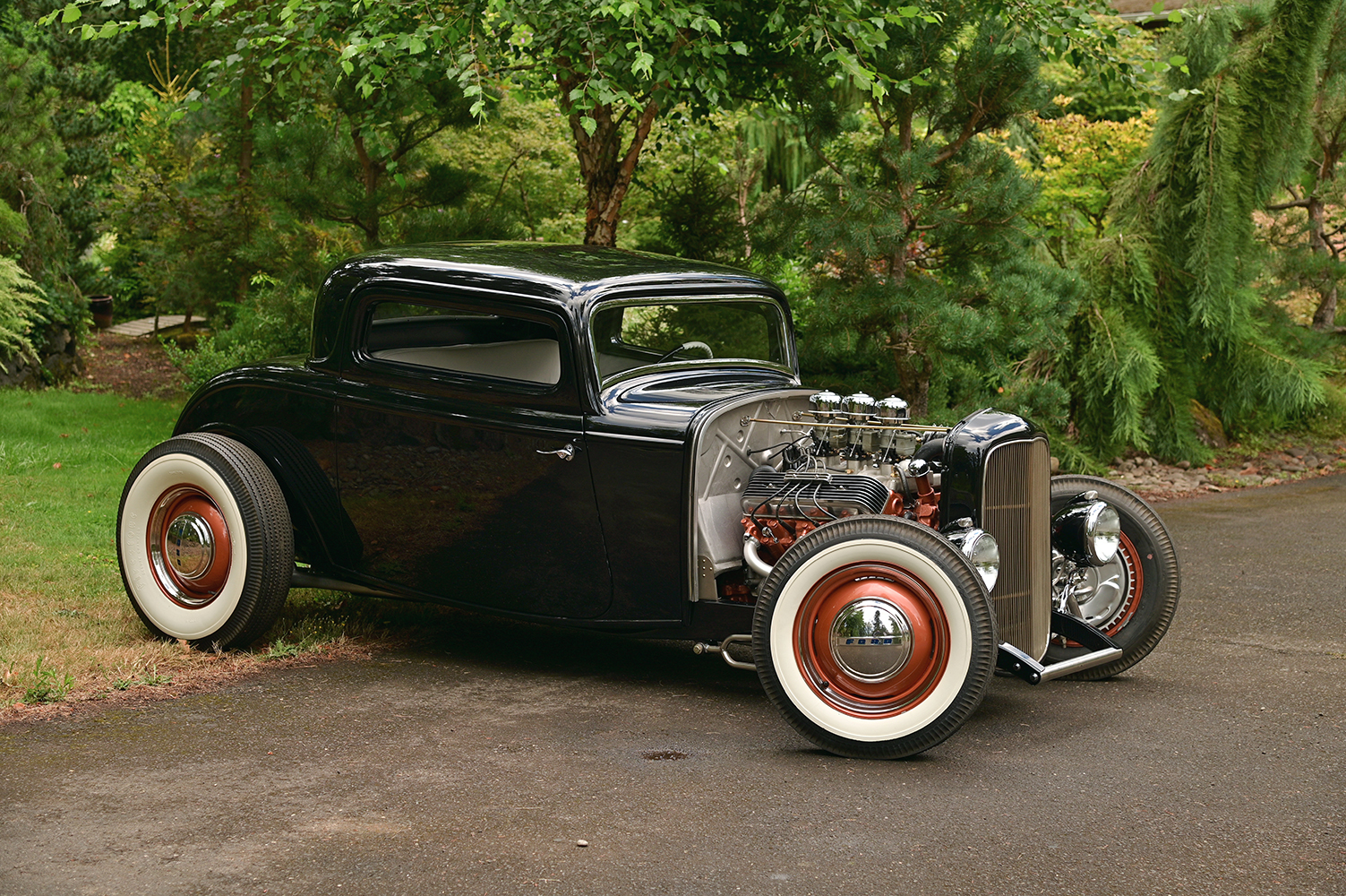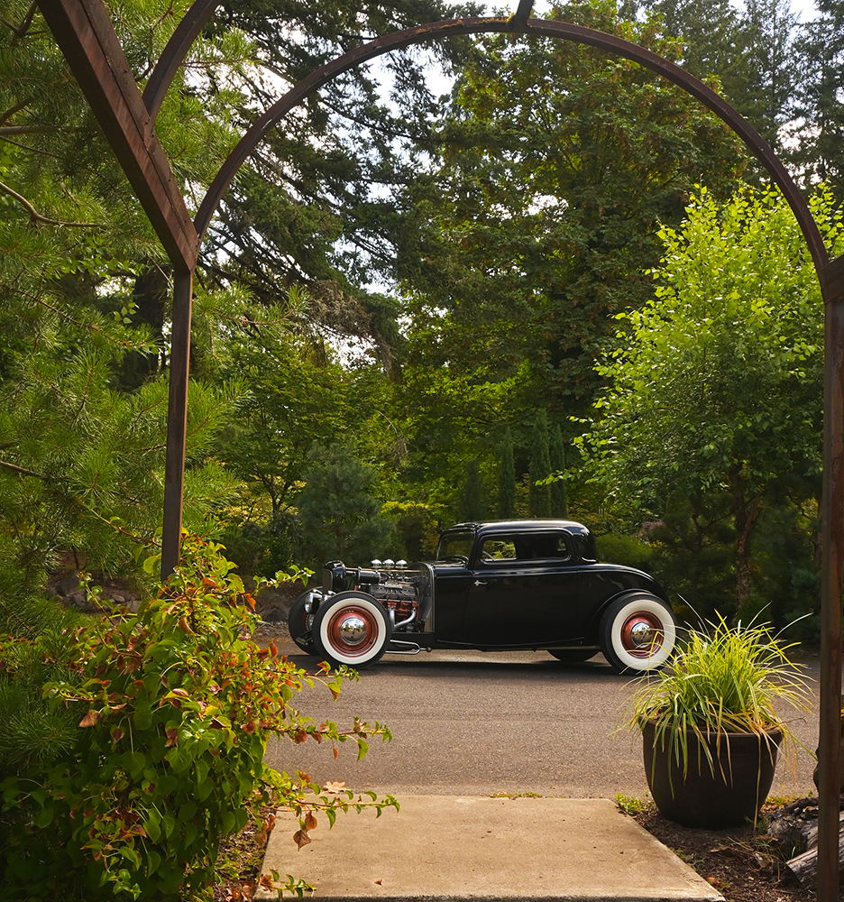 When you turn into Arnie Chupp’s driveway in Oregon, which is more of a country road, you are instantly surrounded by gardens and trees. Further on, there are small ponds and a bridge over a creek that would make the Gardens of Versailles jealous. Arnie carries on that artistry in many mediums, from painting to sculpture. His 1932 Ford chopped-and-channeled coupe, Oldsmobile-powered, is just another of his artistic endeavors.