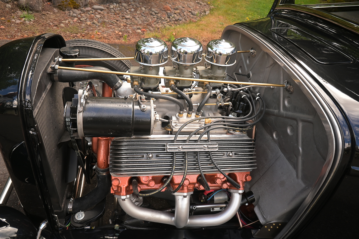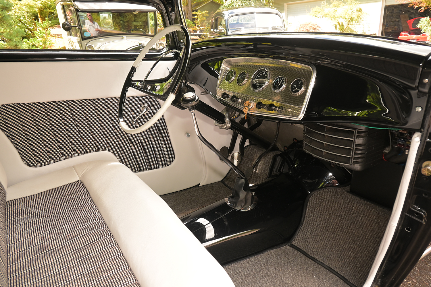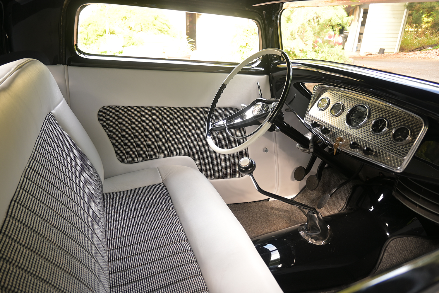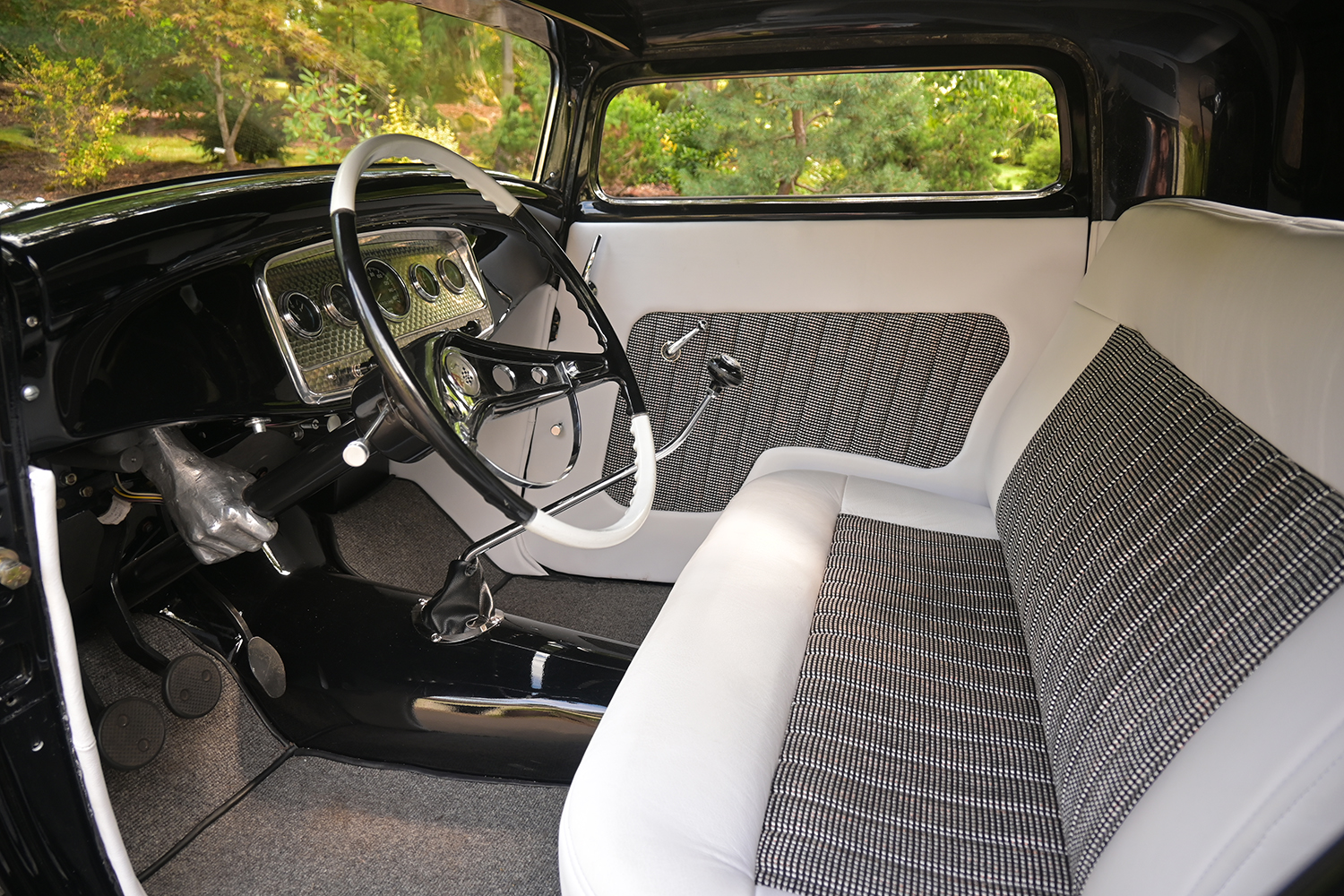 Starting with a 1932 Ford three-window–style Harwood body (2-inch chop from Harwood), Arnie and Hansen’s Body Shop added a steel Deuce Ford cowl vent and lowered the reveal on the rear 1-1/4-inch to accommodate the rear license plate. Then they moved the bulkhead back and stretched the dash a bit to fit the SO-CAL Speed Shop gauge cluster filled with Stewart-Warner gauges and finished up by raising the trans tunnel 3-1/4 inches. The rich Ford U-Tech black finish is also thanks to Hansen’s.