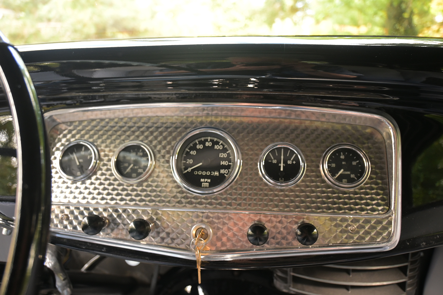 Arnie likes the look of channeled hot rods but prefers not to sit on the floor. Starting with repro ASC framerails, he moved the frame into the transmission tunnel like an X-frame. That makes the tunnel higher, but the floor is at its correct height. He ended up with the stock interior space but with the body channeled 3-1/2 inches. This meant that the brake, clutch, heater, coil, cowl vent mechanism, and fuse panel all had to fit under the dash. He also kicked up the rear to accommodate the 301 Halibrand rearend. Arnie did not want all those fittings to show under the hood on the firewall. Making a pattern from a pristine original 1932 firewall, he sent it to a foundry to be cast out of aluminum. It is ¾-inch thick and weighs 60 pounds. He mounted the above items with “blind” holes, resulting in a clean firewall.