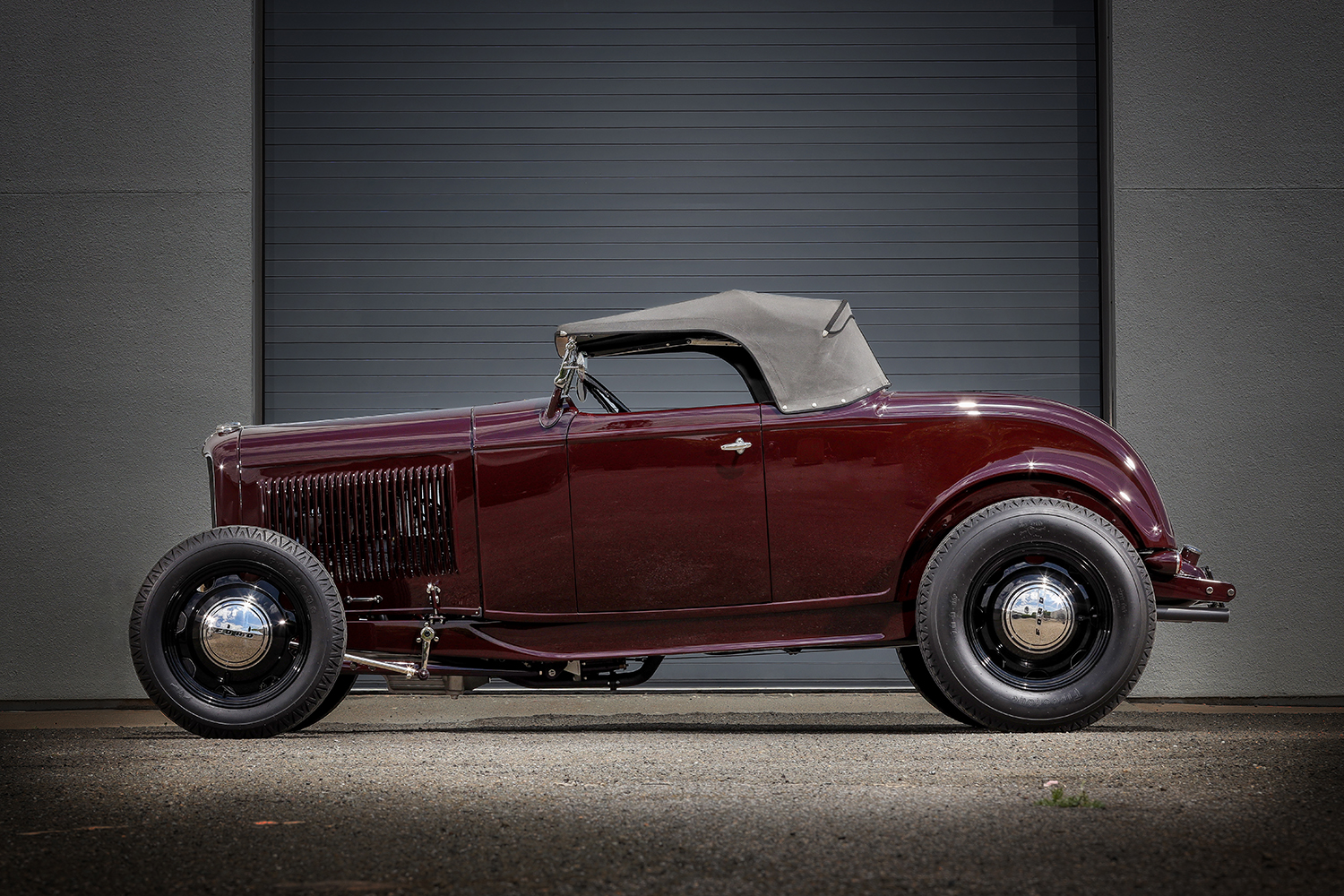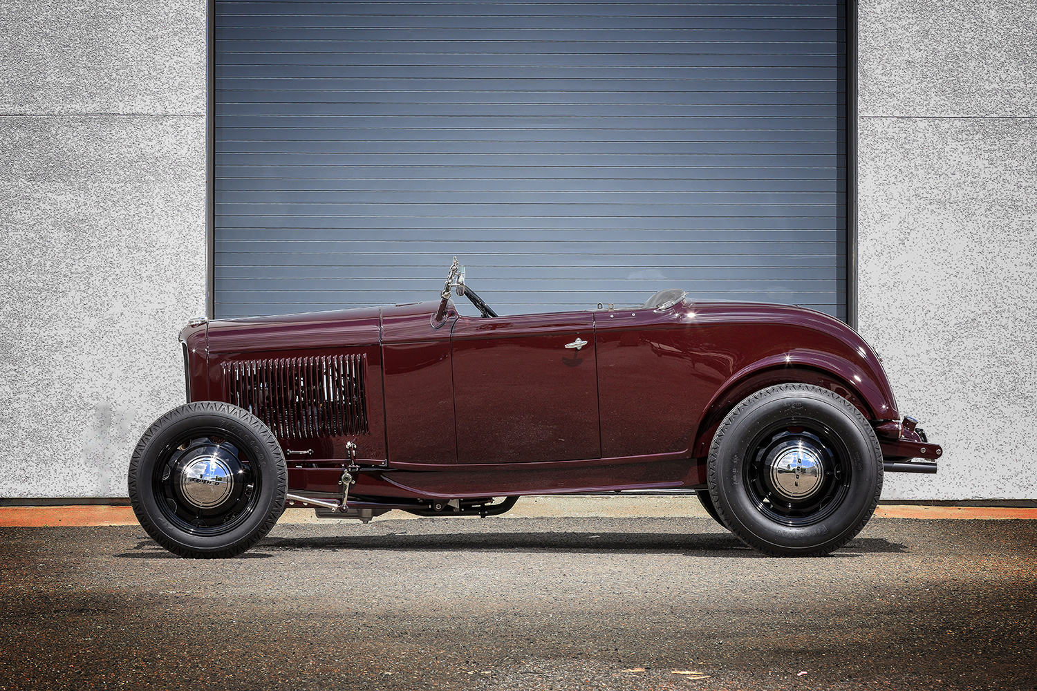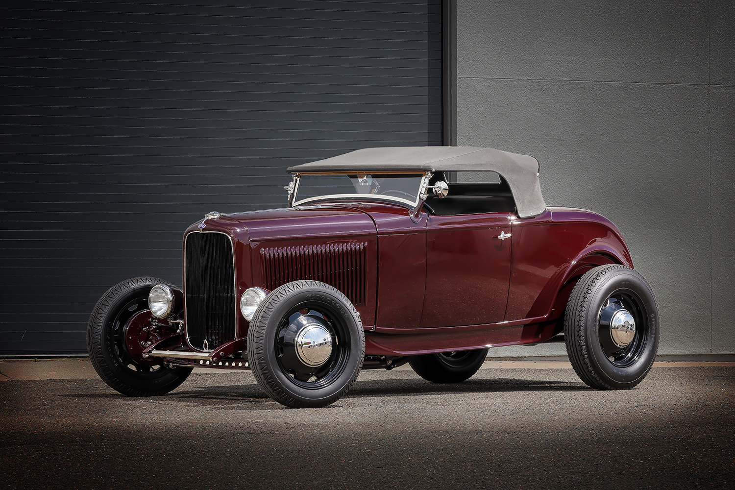 03 1932 Ford Roadster three quarter front view with a chopped windshield and classic grille