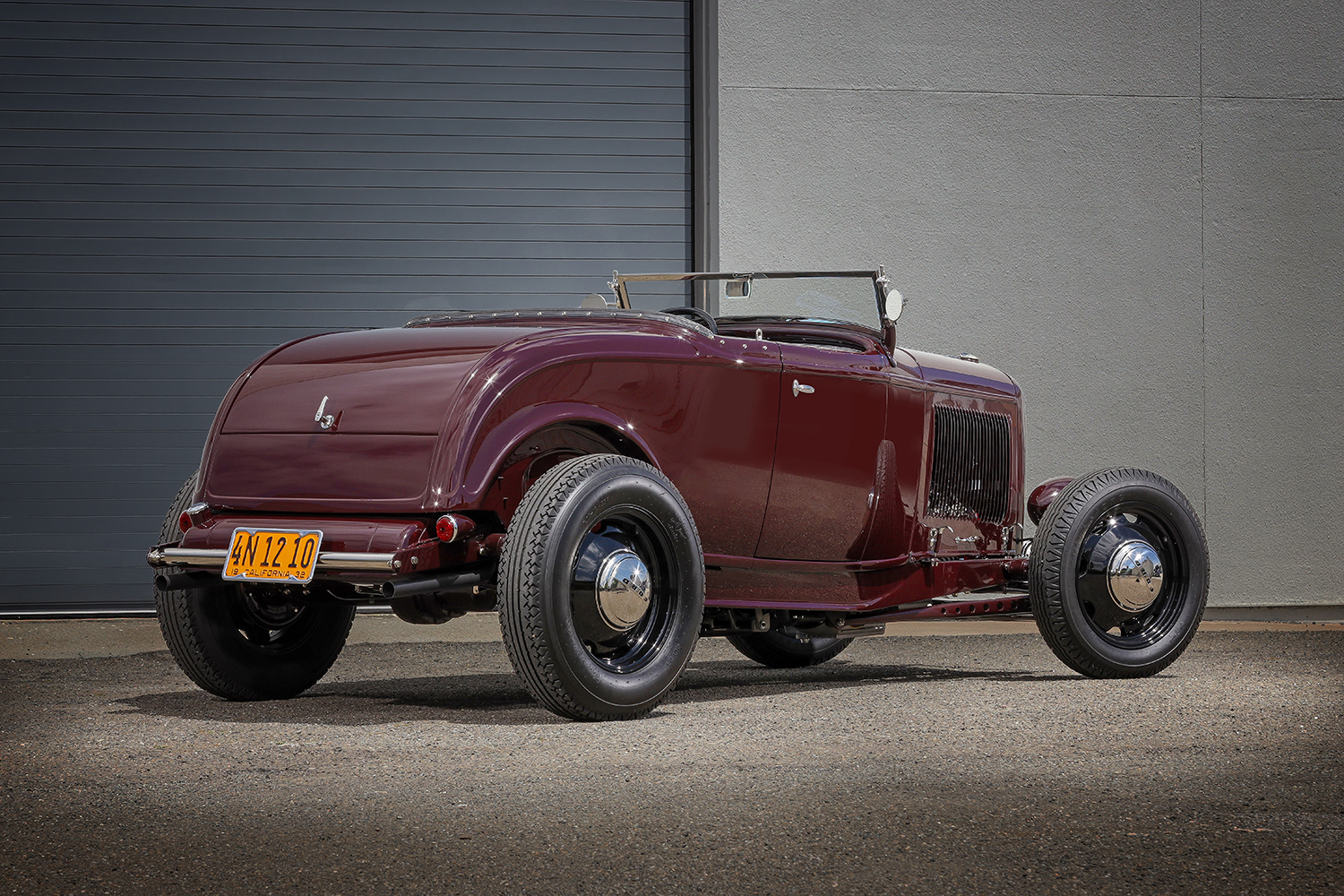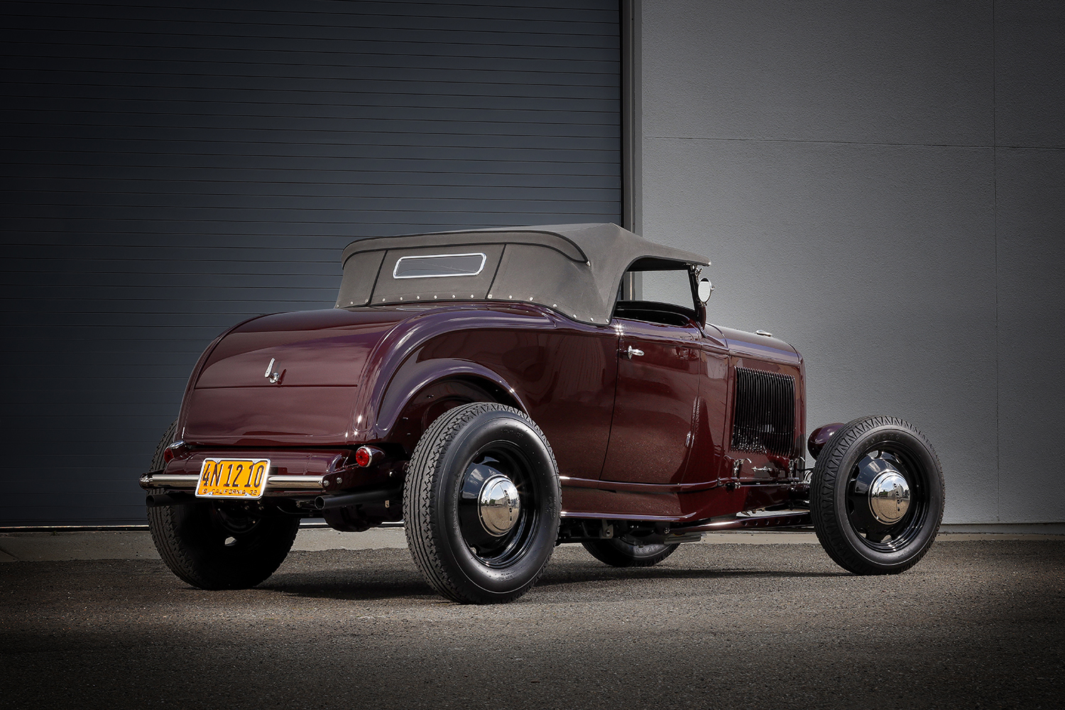 05 1932 Ford Roadster rear view with a black soft top and California yellow license plate