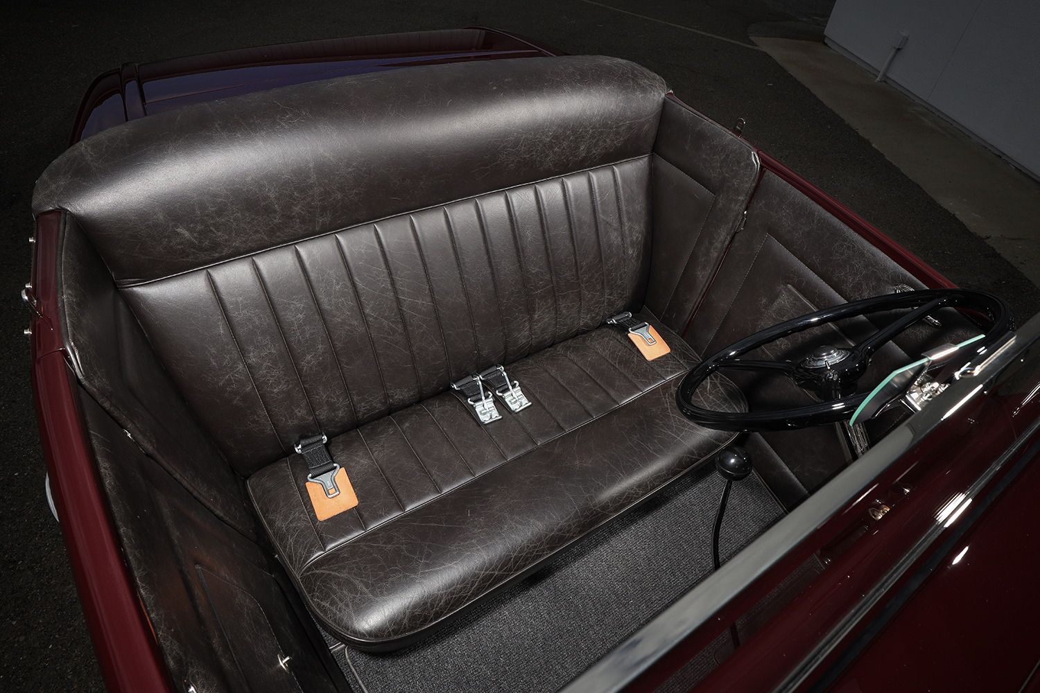 Jim Vickery from Brizio’s took care of the custom wiring. The factory steering column features a 1932 Ford wheel. The bench seat is custom-made and upholstered in charcoal leather, equipped with 2-inch-wide race belts from Crow Safety Gear, provided by Sid Chavers Fine Auto Upholstery, who also installed the German square-weave carpeting. The top is the original 1932 Ford cover that Sid modified to make it functional and aesthetically pleasing for today’s standards. The distressed leather finish also enhances the door and kick panels.