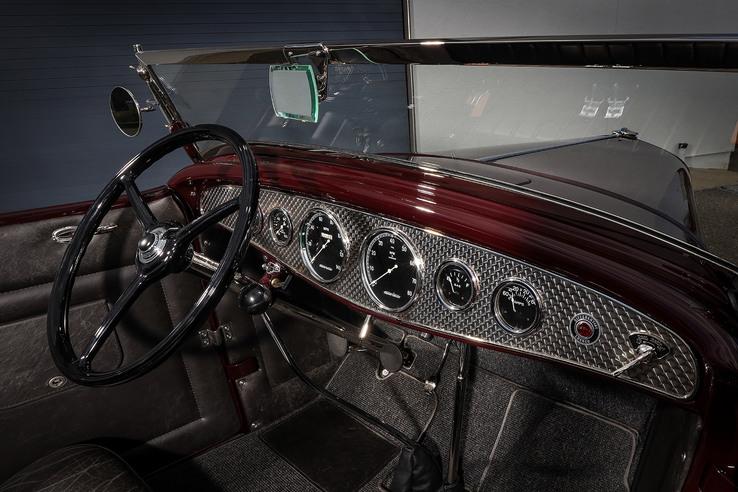 The interior features a stock 1932 Ford dashboard, modified by Brizio to fit the original 2-5/8- and 5-inch-diameter Stewart-Warner gauges, set against a Mike Curtis machine-turned insert. It should be noted that these gauges are quickly becoming, if they aren’t already, as rare as the proverbial “hen’s teeth.” To the passenger side of the dash located within the Curtis panel is the “Differential Locked” red warning light, and to its immediate right is the “Dual Ratio/Low and Hi” position switch that controls the vacuum-operated Columbia two-speed overdrive.