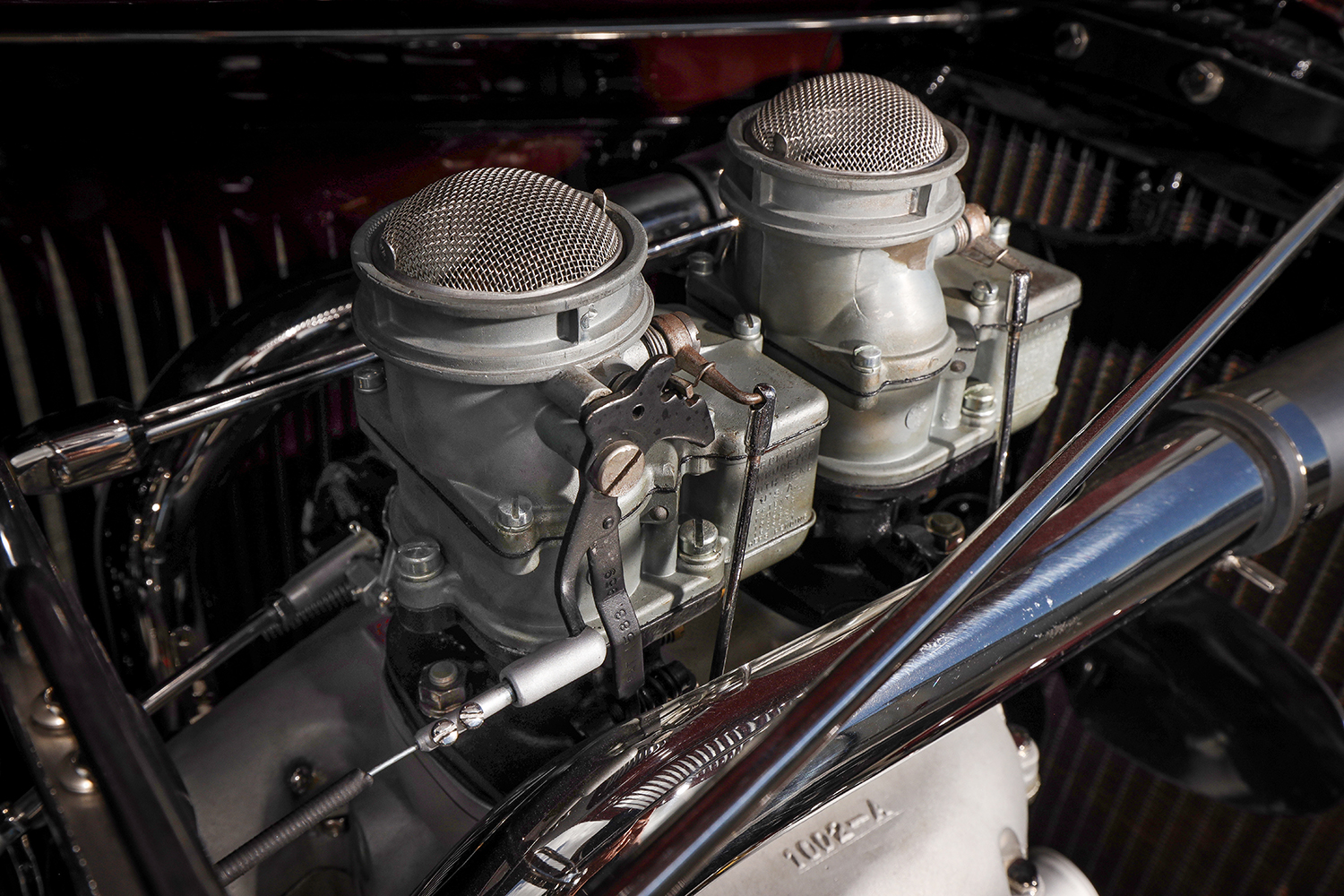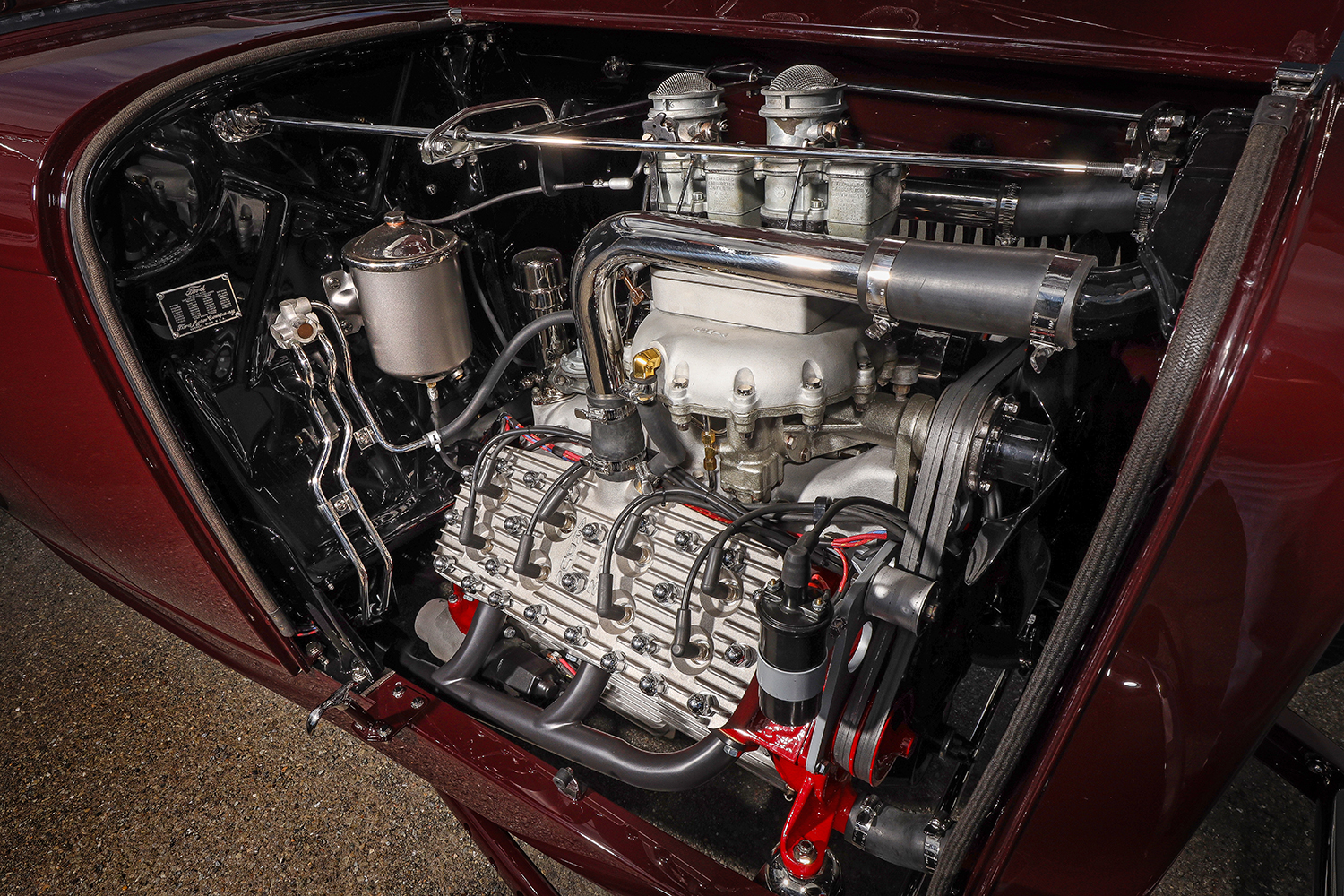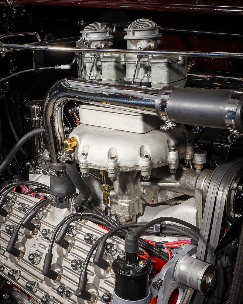 12 1932 Ford Roadster engine bay featuring a high performance Ardun OHV converted Flathead V8 with dual carburetors and polished components