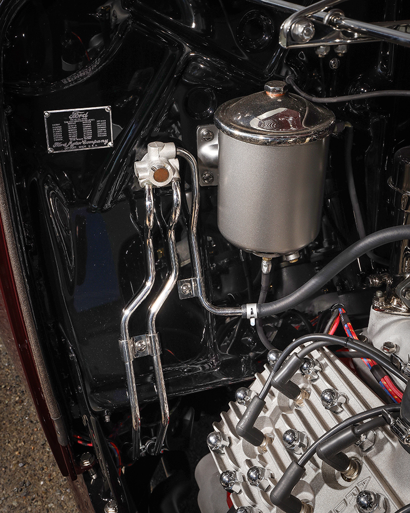The chassis was constructed with original framerails, while the factory wishbones were split; the team at Brizio’s handled all fabrication needs. The modified Deuce front axle showcases hot rodding flair with a dropped-and-drilled treatment. A reversed-eye transverse leaf spring, 1937 Ford spindles, and 1932 Ford Houdaille friction shocks (introduced in 1932) are utilized at this stage. The side steering incorporates Nash Jennings and Ford components, operated by a 1932 Ford steering column. A torque tube-fitted Ford rearend, featuring 3.78 gears, is paired with a 1940 Columbia two-speed overdrive conversion. The roadster also highlights additional Deuce components, such as the rear springs and shocks. The braking system consists of 1940 Lincoln “juice” brakes matched with a 1940 Ford master cylinder. The wheel and tire setup features a set of reproduction “milk truck” wheels with chrome caps displaying the Ford logo, sized at 18×5 in the front and 18×6 in the back. Coker provided Firestone rubber replicas, measuring 5.60×18 in the front and 7.00×18 in the back.