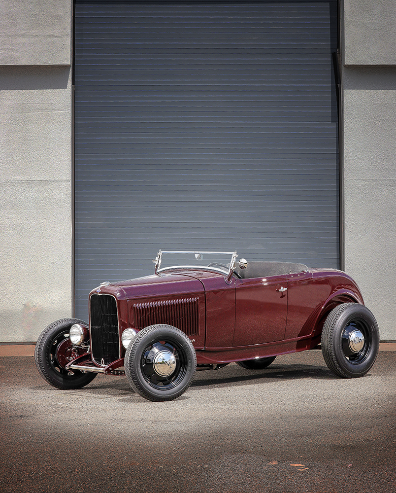 Starting from where one should—at the beginning—Barron’s hot rod is constructed with original sheetmetal based on a 1932 Ford roadster body, which includes the hood, grille shell, and the car’s original top. It was later transformed into a highboy with a 4-inch chopped windshield and hidden hinges, and the unused frameholes that once accommodated the running boards and fenders were filled. Joe Compani of Compani Color expertly completed the body- and paintwork and applied the Rubino Scuro (maroon) color from a 1932 Alfa Romeo 8C. To answer the ongoing question: The headlights are from OTB and are recreations of the Guide-style lights, while the taillights are 1937 Ford models mounted to custom Brizio posts attached to the frame just below the rear of the body.
