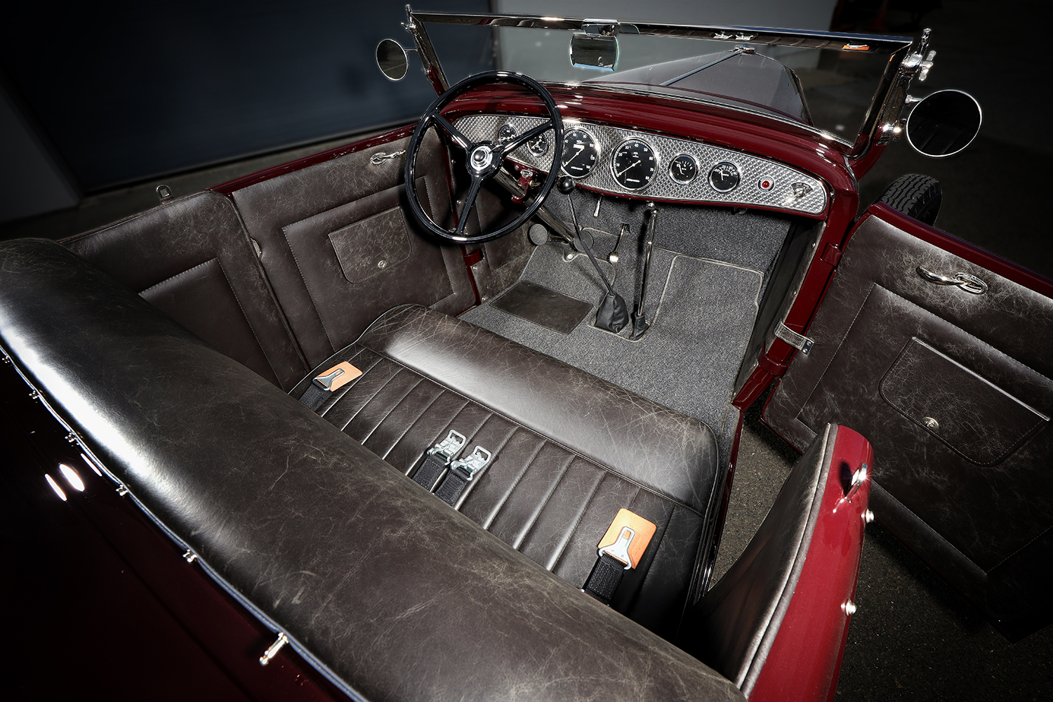 09 1932 Ford Roadster interior with distressed black leather seats a period correct dash and a custom floor shifter