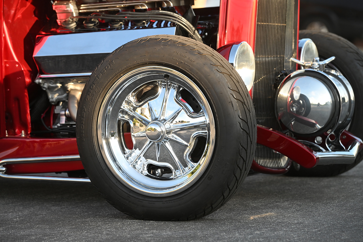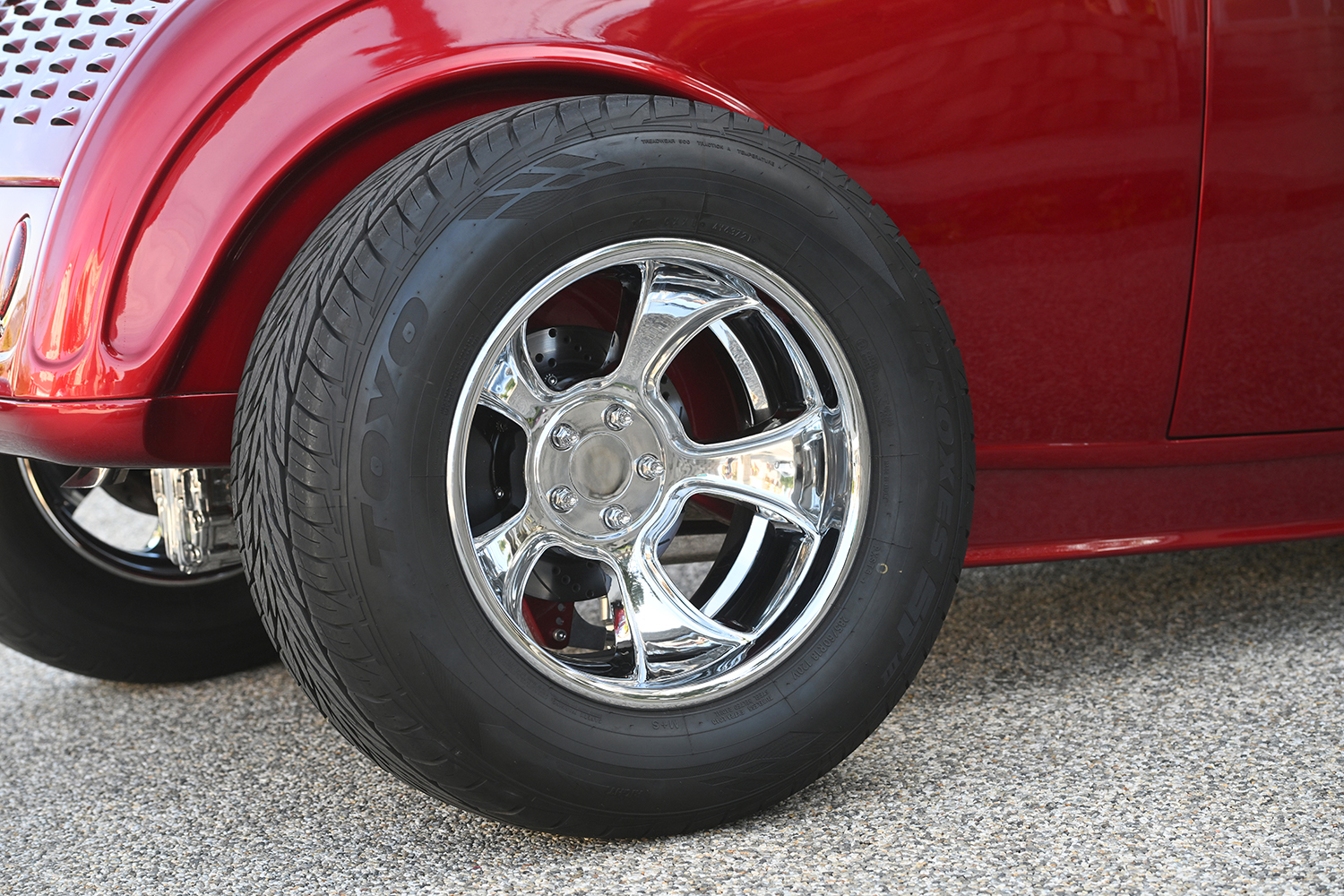 Working with the Coyote V-8, moving the horsepower and torque rearward is a Richmond six-speed transmission complemented by Ken’s handmade custom shift lever with a McLeod twin-disc clutch and flywheel package linked to a Driveline Specialties driveshaft. In the rear is a Winters quick-change rearend with a limited-slip differential and 5:13 gears. Braking and suspension are based on Wilwood Dynalite calipers with drilled-and-slotted rotors, air shocks, and a Deuce Factory Panhard bar. Talk about stoplight acceleration! Together, this configuration produces a formidable horsepower output approaching 500! More corner appointments include the Rebel Spindle mounts measuring 15×5 and Mike Curtis 18×10 wheels with Mickey Thompson rubber 24×5.00 in front and 285/60R18 in back.