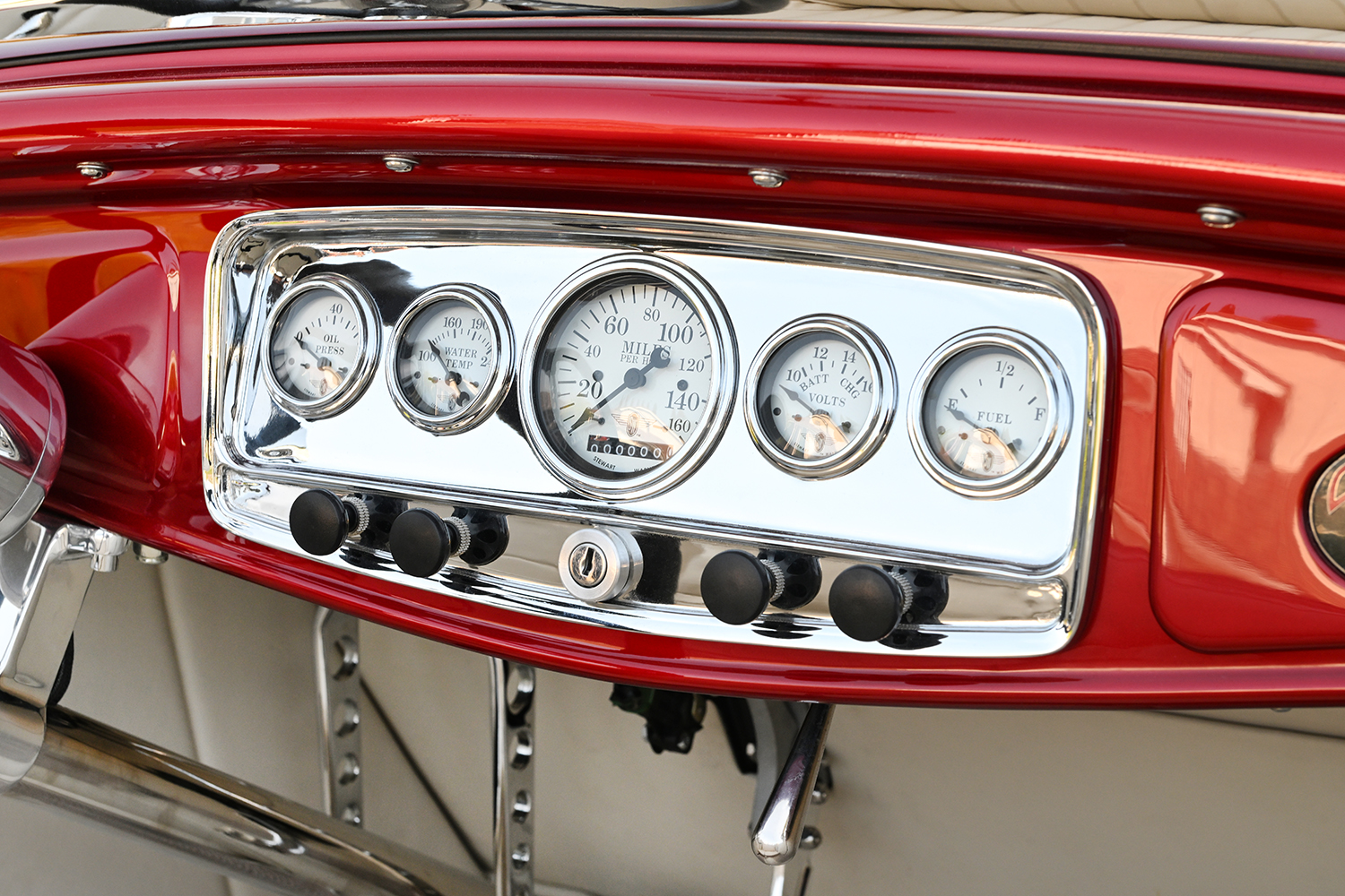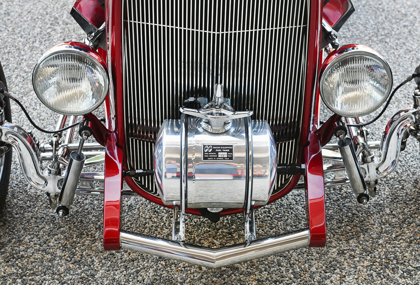 The front axle also features more of Ken’s handiwork. He used a narrowed, drilled, and chromed Magnum axle and a 46-inch-wide I-beam modified for a 5-inch drop. Chromed Bilstein tube shocks, UniSteer rack-and-pinion steering, and Ken’s handiwork in the machined front sway bar complete the frontend. Additional frontend goodies include spindle-mount wheels, eliminating the need for hubs, thus yielding an even more compact appearance. The Moon tank up front is the fill point for the gas tank, located in the trunk just behind the bench seat.