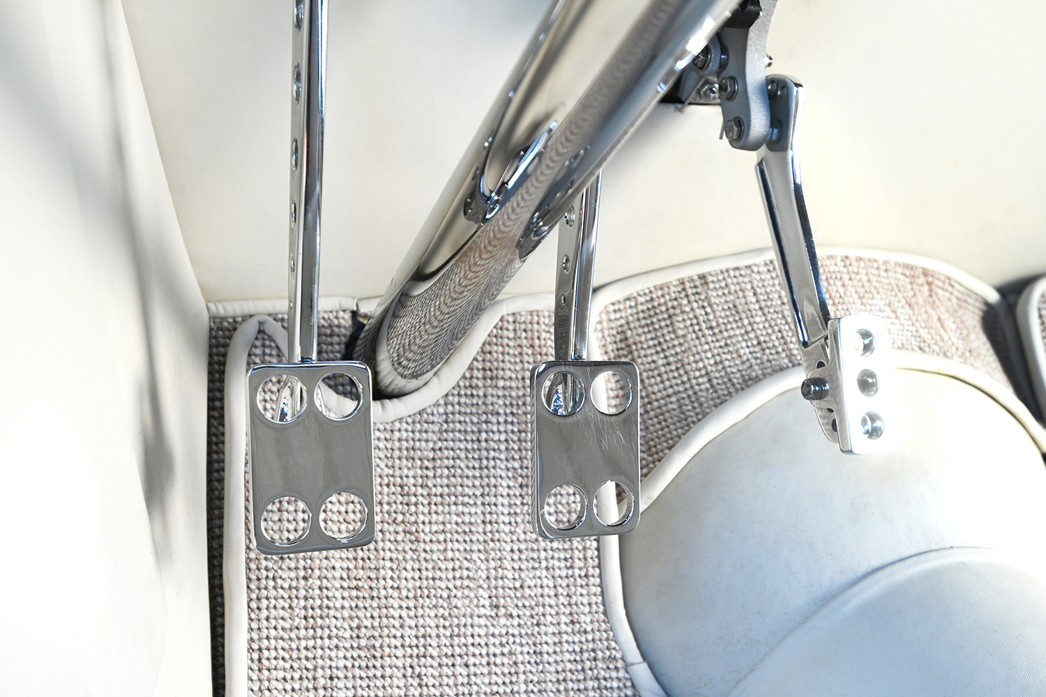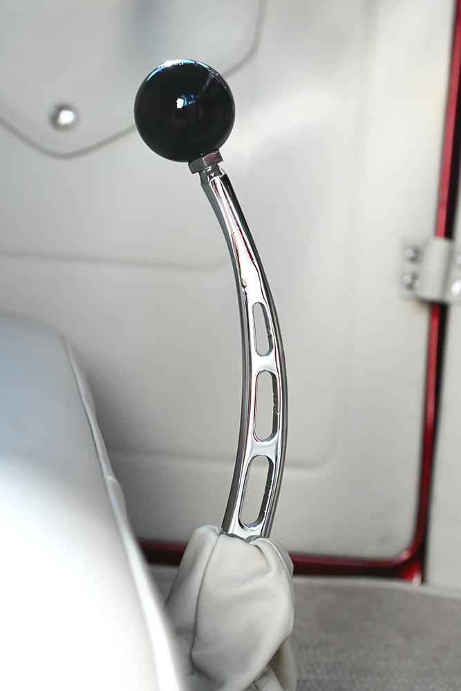 The interior shows off a Brookville three-window coupe dashboard that now houses Stewart-Warner “winged” gauges resting in a chromed panel. One of Ken’s homemade steering columns and drop now house the column-mounted tach and a drilled four-spoke Sprint Car–style wheel. A Centech fuse panel and battery-kill switch are used with Ken’s handiwork in wiring. A Glide bench is utilized with a heater mounted below the seat. Mercedes off-white leather is used on the bench, door, kick panels, firewall, and trans tunnel; all showcase the use of leather. The carpeting is light-colored, complementing the leather, while Kugel Komponents received the nod for the pedal and master cylinder mount assembly.
