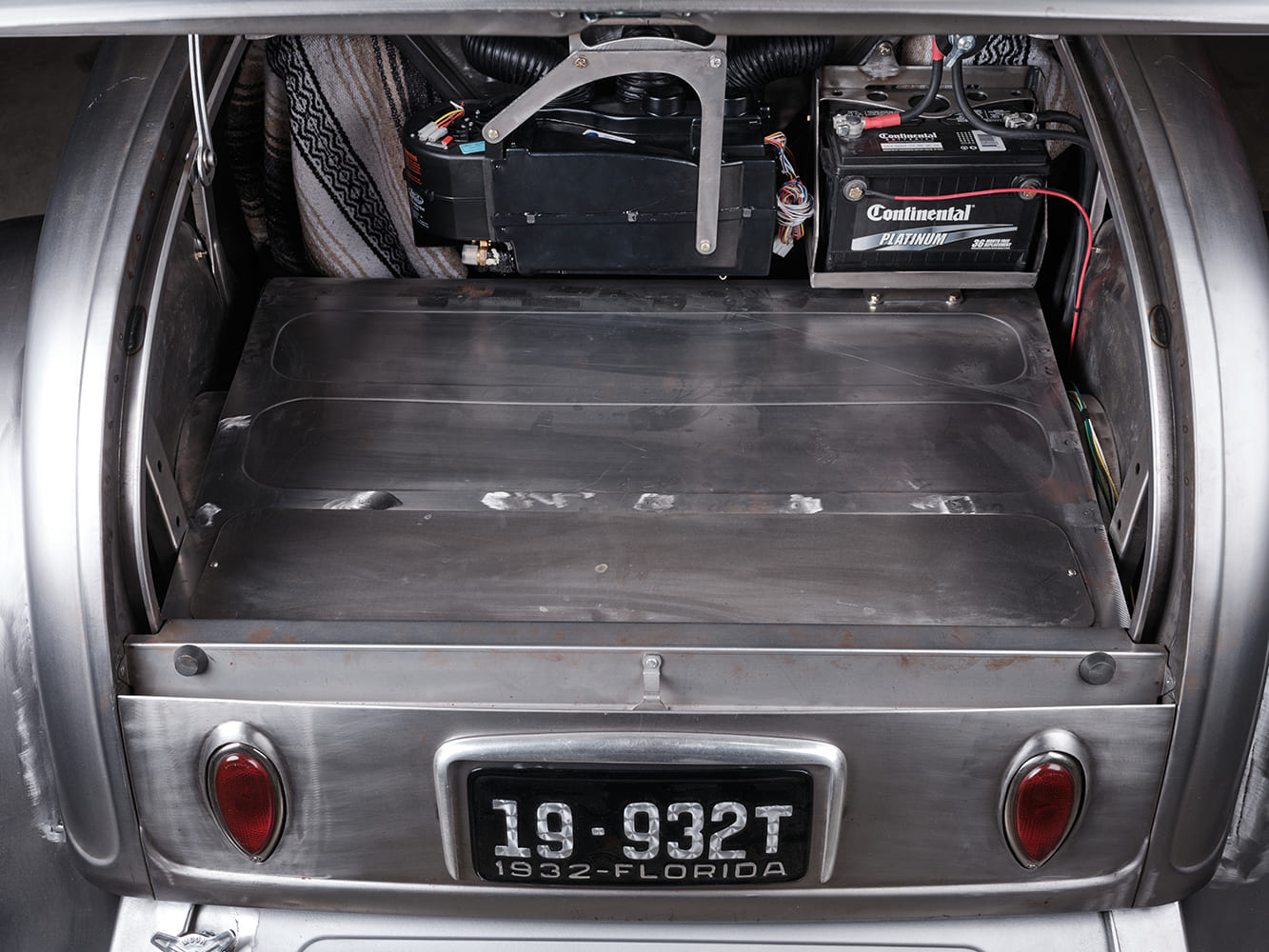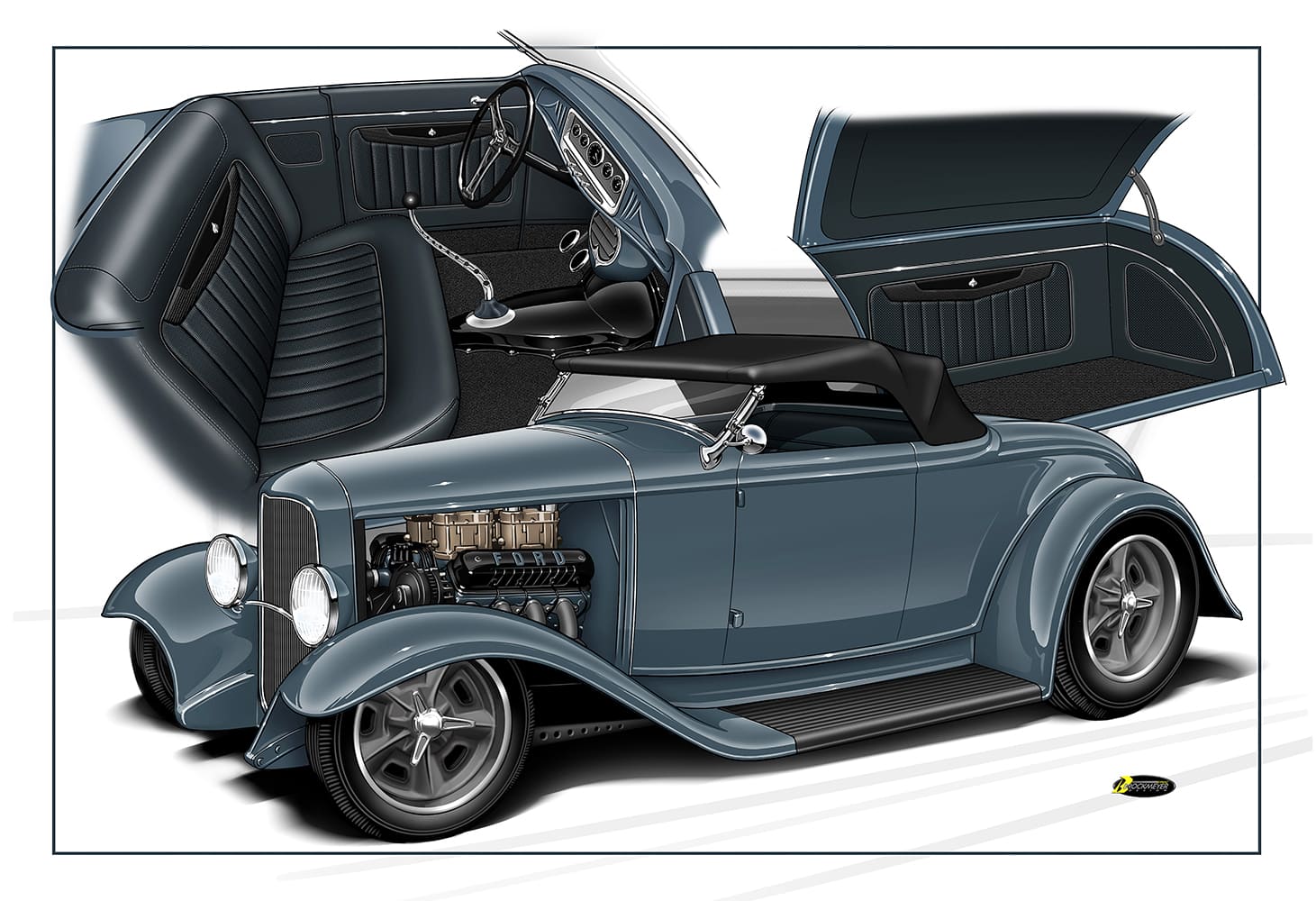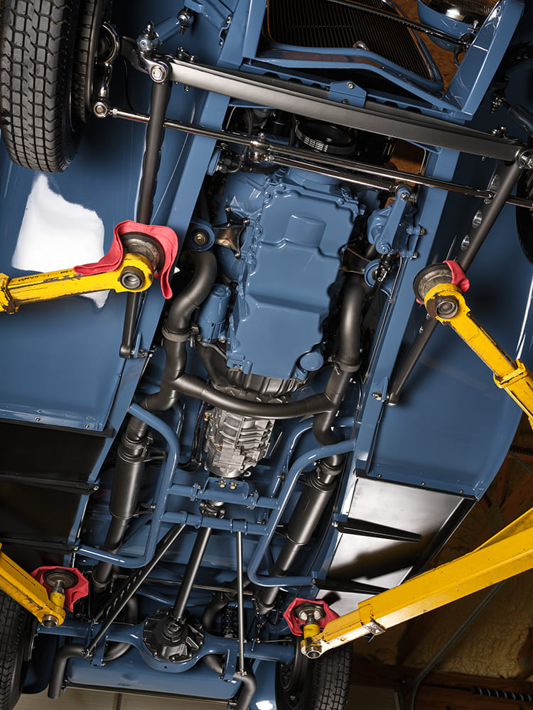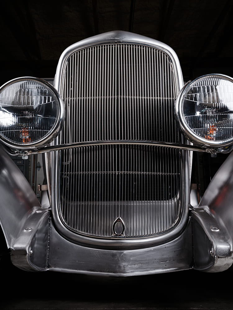 Eric Brockmeyer, a friend of Scott’s, created several renderings based on their conversations, which led to Brockmeyer’s “pen-to-paper” moment, yielding the roadster body that would undergo sheetmetal modifications. A 1932 Brookville Roadster, complete with fenders, running boards, and grille shell, would undergo the desired body modifications. These included raising the rear fenders approximately 3-1/2 inches, which required lengthening the rear fenders and adjusting the fit of the running boards and front fenders to accommodate the change. The hood has been lengthened and the grille shell lowered to create smooth, flowing lines. The Tanks 12-gallon gas tank, equipped with a Moon Spinner fuel cap, was relocated under the body, while the rear framehorn covers received significant modifications. The 1939 Ford taillights have been partially “frenched” with a raised lip along the top. The dropped headlight bar allows the 1932 Ford commercial headlamps to be lowered from their original position and moved closer together. The front splash apron was also heavily modified. The chopped and curved windshield featuring a 37-degree rake is a Stan Wanlass design fabricated by Dick Rodwell. Its laid-back design is connected to the heavily chopped, removable “convertible” top built by Clark and covered by Tracy Weaver of Recovery Room Interiors. Tony Curry and Chance Taylor, both of Show Me Rod and Custom, received the nod to handle the body and paint. The color is a 2023 Porsche Aetna Blue, a modern take on a vintage 365 Porsche color. The hood is a Rootlieb custom-length one-piece top, minus sides, with a hidden latch system, again fabricated by Clark.