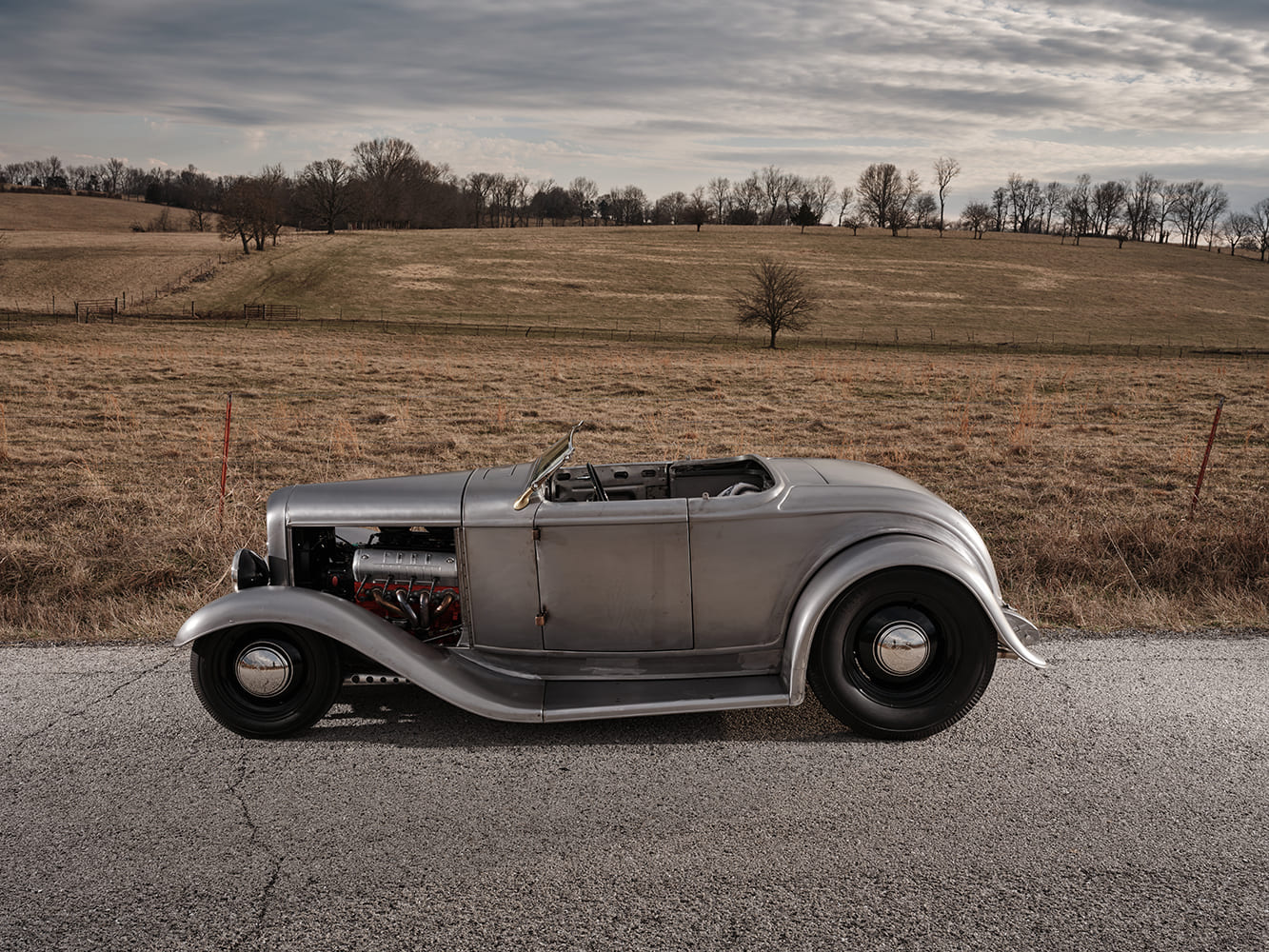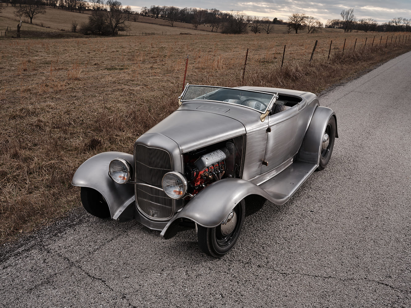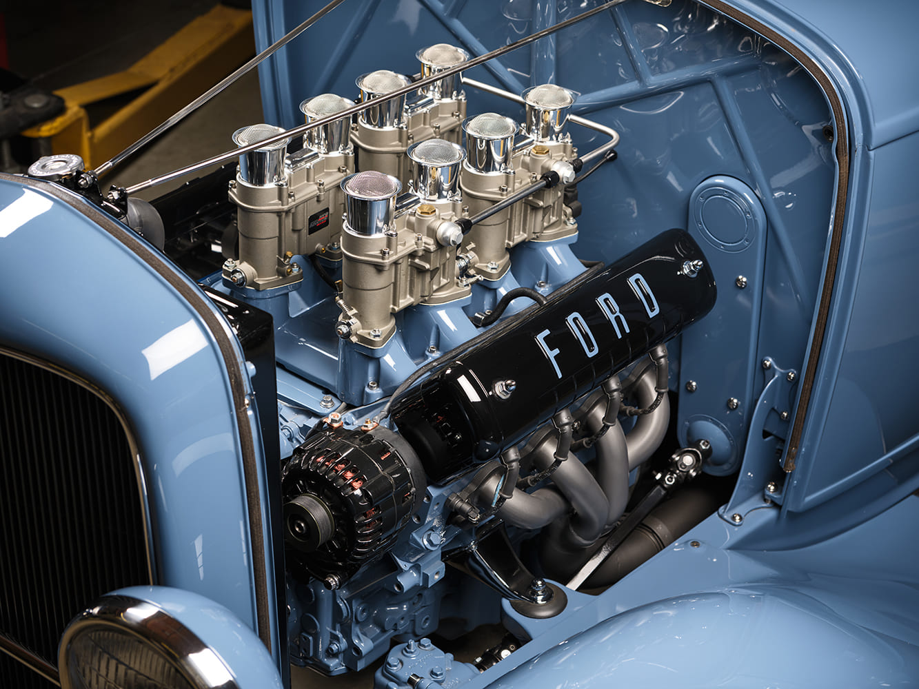 Eric Brockmeyer, a friend of Scott’s, created several renderings based on their conversations, which led to Brockmeyer’s “pen-to-paper” moment, yielding the roadster body that would undergo sheetmetal modifications. A 1932 Brookville Roadster, complete with fenders, running boards, and grille shell, would undergo the desired body modifications. These included raising the rear fenders approximately 3-1/2 inches, which required lengthening the rear fenders and adjusting the fit of the running boards and front fenders to accommodate the change. The hood has been lengthened and the grille shell lowered to create smooth, flowing lines. The Tanks 12-gallon gas tank, equipped with a Moon Spinner fuel cap, was relocated under the body, while the rear framehorn covers received significant modifications. The 1939 Ford taillights have been partially “frenched” with a raised lip along the top. The dropped headlight bar allows the 1932 Ford commercial headlamps to be lowered from their original position and moved closer together. The front splash apron was also heavily modified. The chopped and curved windshield featuring a 37-degree rake is a Stan Wanlass design fabricated by Dick Rodwell. Its laid-back design is connected to the heavily chopped, removable “convertible” top built by Clark and covered by Tracy Weaver of Recovery Room Interiors. Tony Curry and Chance Taylor, both of Show Me Rod and Custom, received the nod to handle the body and paint. The color is a 2023 Porsche Aetna Blue, a modern take on a vintage 365 Porsche color. The hood is a Rootlieb custom-length one-piece top, minus sides, with a hidden latch system, again fabricated by Clark.