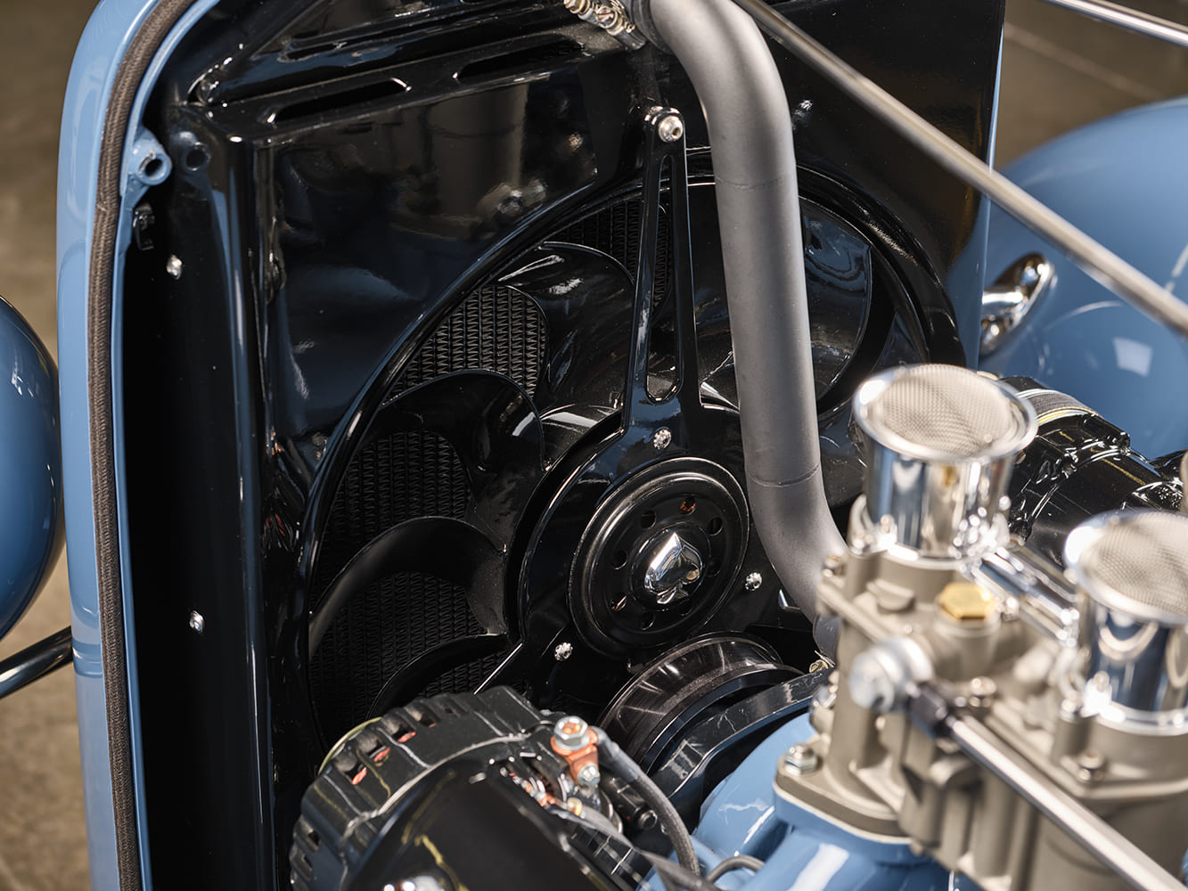 The V-8 engine is an LS3, equipped with a Borla 8-Stack EFI system based on a Weber downdraft throttle body setup with Borla mesh air cleaners. The LS coils are hidden beneath billet faux Ford Y-block valve covers built by EVOD. Fuel is supplied by a Walbro in-tank pump. The engine management uses a Holley Terminator X CPU with custom cloth-covered plug wires made by Clark. Interestingly, power comes from an old-school lead-acid battery that runs the black powdercoated Powermaster starter and alternator. The exhaust system features a pair of Stainless Works block hugger headers coated in Cobalt Blue Cerakote, with 1-5/8-inch tubes feeding into 2-1/2-inch stainless tubing also coated in Cobalt Cerakote, fabricated by Clark. These headers connect to Cobalt Blue Cerakoted Flowmaster Flow FX mufflers. Other engine parts include a smoothed aluminum water pump and LS serpentine belt system from Drive Junky, a Holley LS swap retro-style oil pan, and a radiator from Johnson Radiator. The fan shroud, custom-made by Clark, has a louvered top, a hidden overflow line, and an electric fan from Cooling Components is installed. To move power rearward, the V-8 works with a Bowler Transmissions–prepped TREMEC TKX five-speed manual transmission, with a Johnson’s Rod Shop shifter, along with a Ram flywheel, pressure plate, and clutch. Notably, the transmission tunnel is exposed metal. Scott wanted a custom trans tunnel to highlight Clark’s metalworking skills—and it certainly does that!