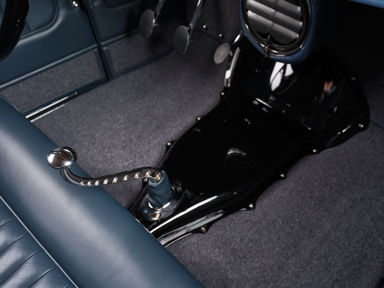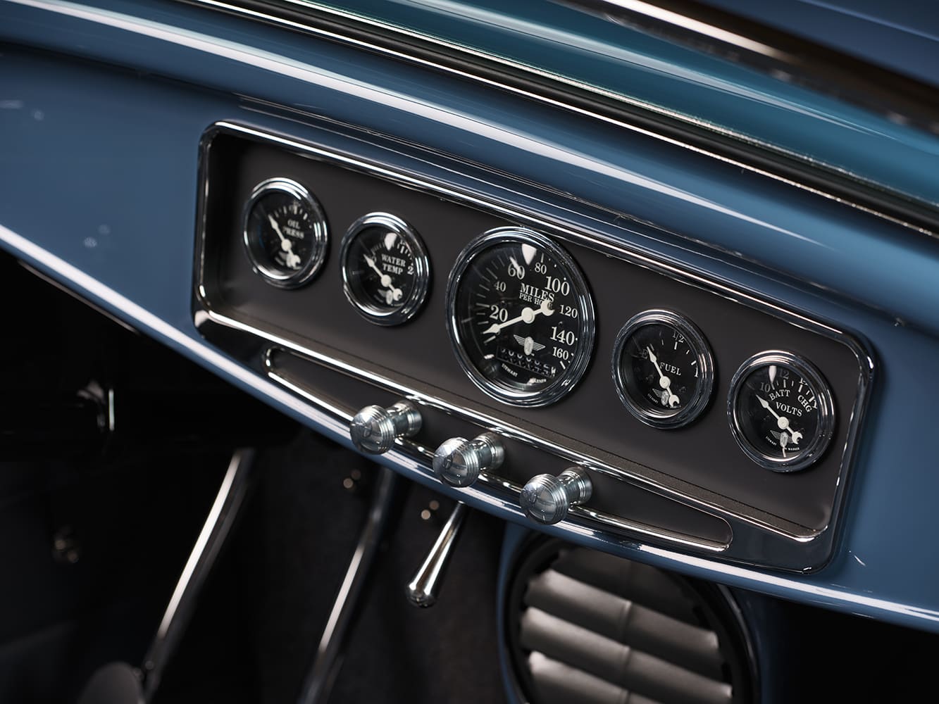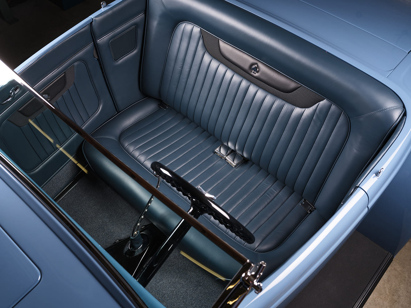 Having a fully functioning A/C system in a roadster is always a luxury. In Scott’s case, he chose a Vintage Air system but installed it in an unconventional manner. Clark installed the evaporator in the trunk, with the A/C hoses running through the framerails. From here, the A/C blows cool air through the bench seat and also out via faux speaker grilles mounted within the rear quarter-panels. The vintage heater box (rescued from eBay), mounted beneath the dash and attached to the firewall, serves as the “command center” for the Borla/Holley EFI arrangement. Tracy at the Recovery Room Interiors crafted the custom bench seat and covered it with dark blue leather from Garrett Leather. At the same time, the chopped and removable top features Hartz Stayfast black canvas material (it’s constructed from an acrylic square-weave facing, rubber inner-layer, and cotton backing). More of Tracy’s work can be seen in the Apex Leather German square-weave carpet in medium blue. The seat details are finished with a pair of Juliano’s chrome clasp buckle seatbelts.