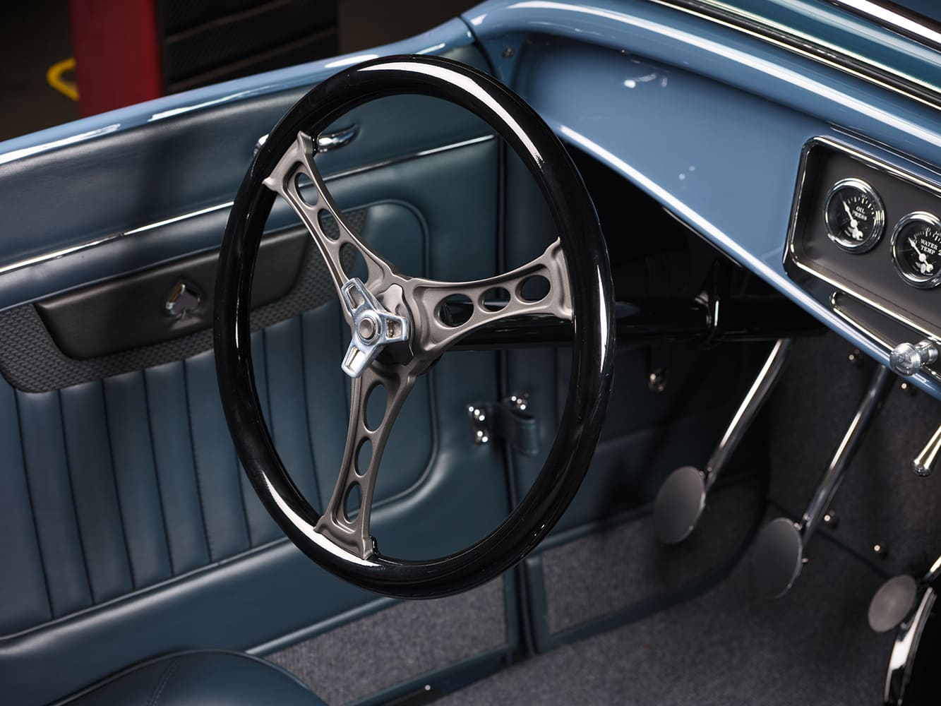 Inside the Brookville Roadster are additional Brookville details, including the 1932 Ford dashboard. During the build, a Lokar engine-turned dash insert was used, but once finished, the roadster now features a Cobalt Cerakoted insert with Stewart-Warner Wings series five-gauge collection. Bringing all the gauges to life, along with the remaining electrical systems, is an American Autowire Highway 15 Plus system (GXL/XLPE GM color-coded wire with labeling every 3-4 inches, self-locking screw clamp interface, and the American Autowire signature gauge cluster disconnect) that Clark neatly routed. Another notable interior feature is the Steadfast Manufacturing three-spoke billet wheel mounted on an Ididit tilt column.