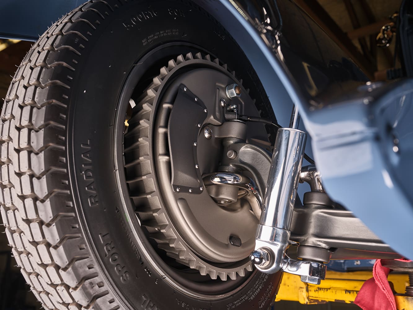 The front wheels measure 16×4.5 (with 3 inches of backspacing) while the rears measure 18×5.5 (again, with 3 inches of backspacing) in a custom Salt Flat–style design by Eric Brockmeyer that are machined by EVOD from 6061-T6 aluminum. These wheels feature a full complement of Coker Excelsior Stahl Sport Radials, measuring 500R16 and 700R18.