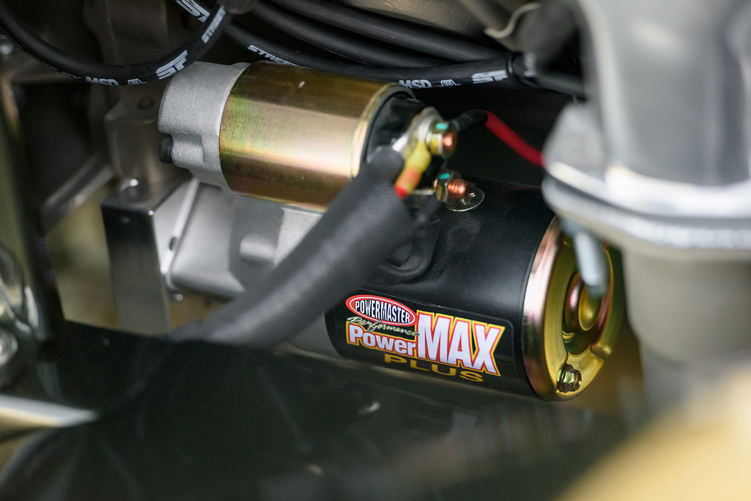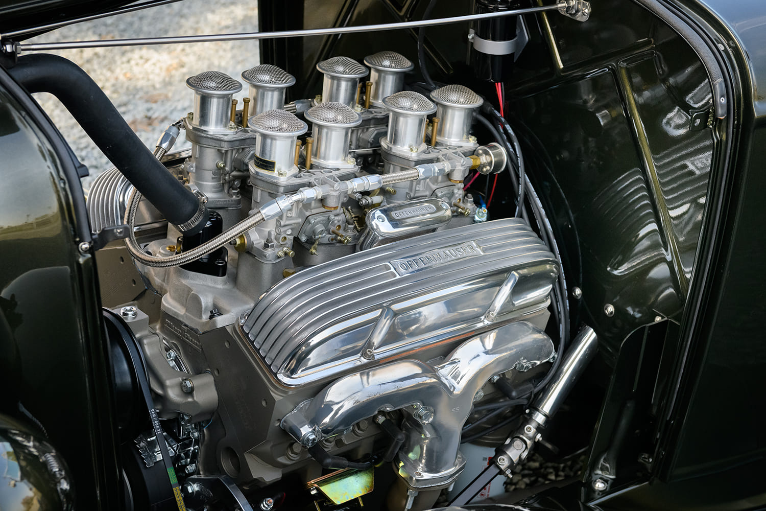 An Inglese 8-stack manifold is equipped with induction via Weber 44 IDF carburetors, supported by a Holley Red fuel pump; bug screens serve as the air cleaners. The ignition features a PerTronix distributor and electronic coil, MSD spark plug wires, all powered by an OPTIMA REDTOP battery located behind the seat. The exhaust system includes smooth, coated Chevy ram’s-horn manifolds connected to a 2-1/2-inch-diameter pipe, fabricated by Mark himself, which then flows into a pair of Flowmaster two-chamber mufflers.