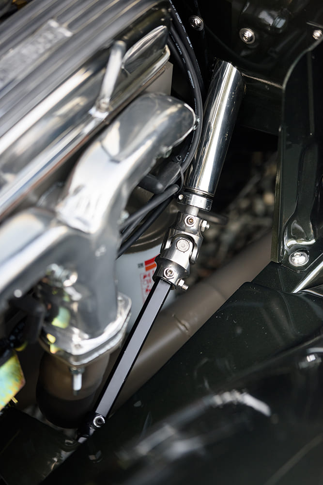 The Deuce sheetmetal, which includes the body, fenders, and running boards, comes from Brookville Roadster and has been modified with a raised trunk floor for rearend clearance. The steel four-piece hood is from Rootlieb, featuring a “winter-style” 1932 Ford grille insert from Alumicraft while the shell is courtesy of Vintique Auto Parts. All necessary bodywork and paint were completed at Double Z Hot Rods in Nori Green, using an Axalta basecoat and clearcoat system. Lighting is a clean combination of taillights from Johnson’s Hot Rod Shop, while the headlights are 1934 Ford commercial units resting on a dropped Deuce headlight bar.
