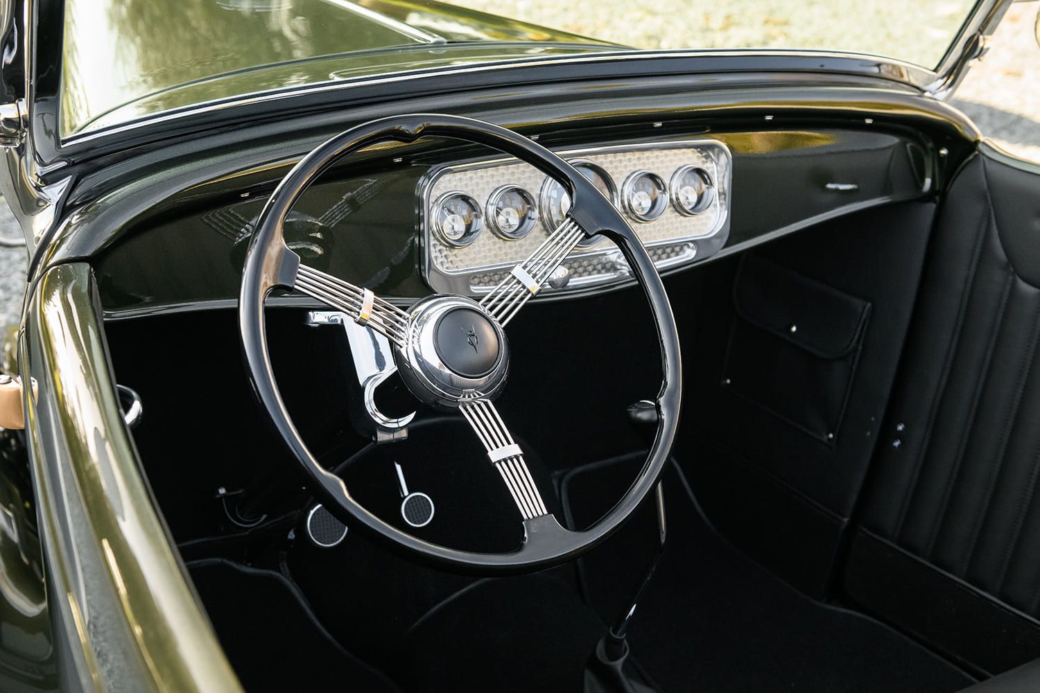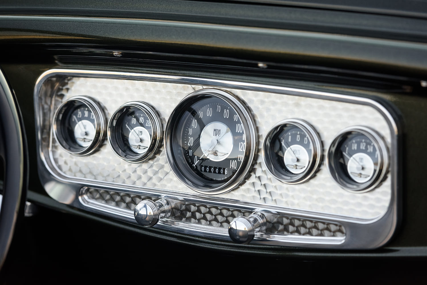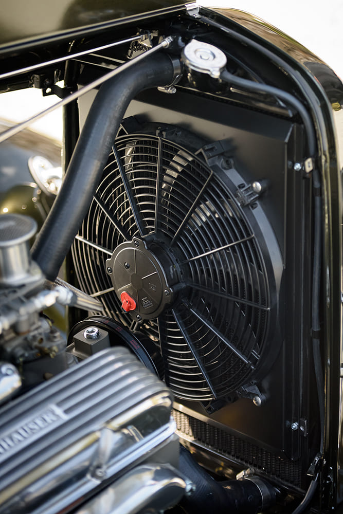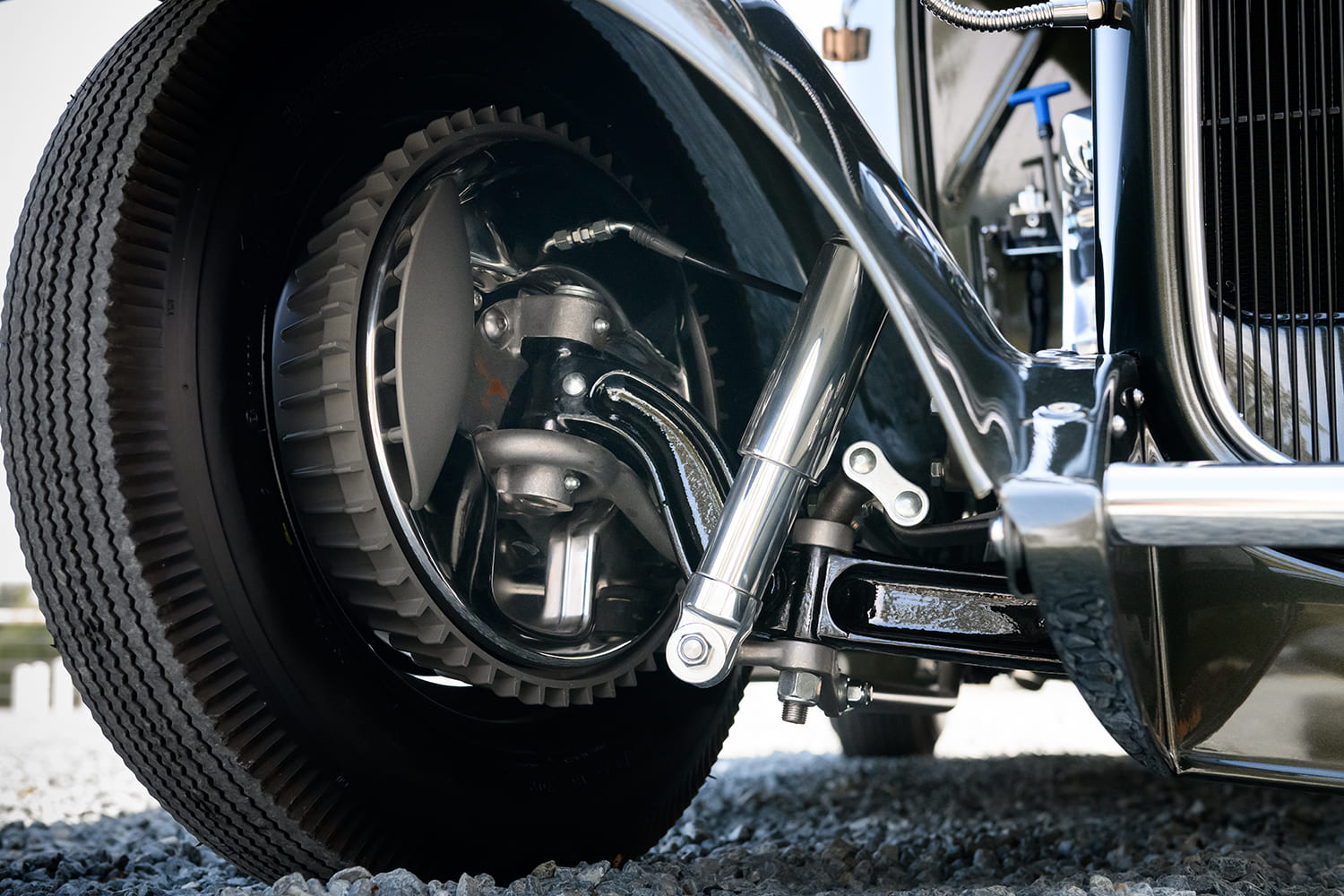 Brakes consist of SO-CAL Speed Shop Wilwood discs hidden inside faux Buick finned drums from the front Hot Rod Brake system. The rear brakes are Speedway Motors 12-3/4-inch drums, measuring 3.75 inches in width. An under-floorboard dual-reservoir SO-CAL master cylinder and pedal assembly controls the brake system. Rolling stock includes original Ford 16×4 wheels in the front and Wheelsmith 16×5 wheels in the back, fitted with Firestone Deluxe tires by Coker, 4.50/4.75-16 in the front and 7.00-16 in the rear.