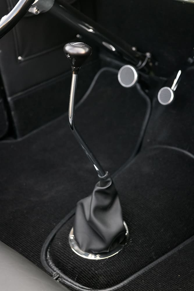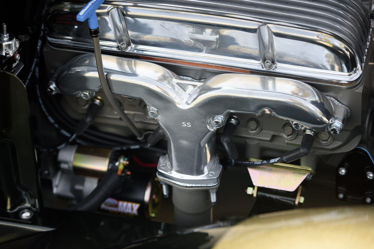 Engine accessories include a smoothed aluminum water pump, a SPAL electric fan, a Powermaster alternator, and a Powermaster PowerMAX Plus starter. The transmission is a Monster 350, paired with a torque converter with a 1,500-rpm stall speed. A Monster Stage 2 Shift Kit complements the valvebody, and a Lokar shifter handles gear selection. A 12-inch finned aluminum trans cooler completes the driveline setup. This setup delivers an impressive 411 hp and 410 lb-ft of torque, making the roadster stand out both aesthetically and in performance.