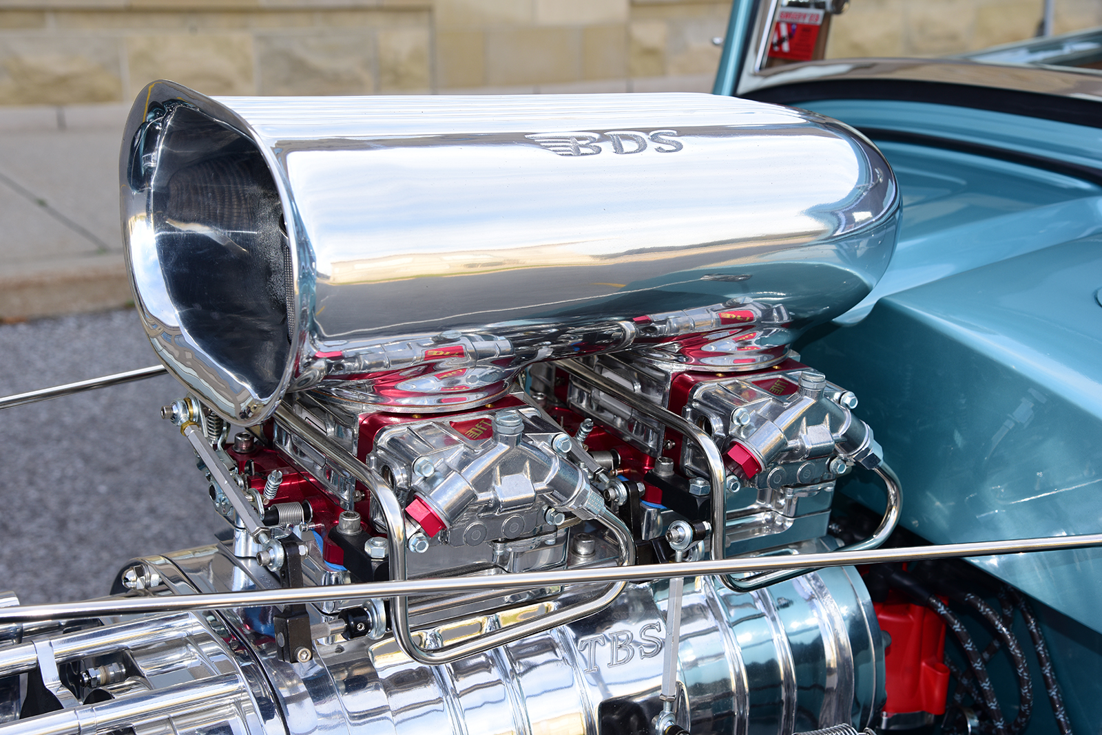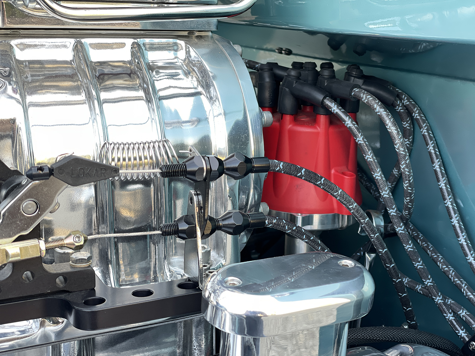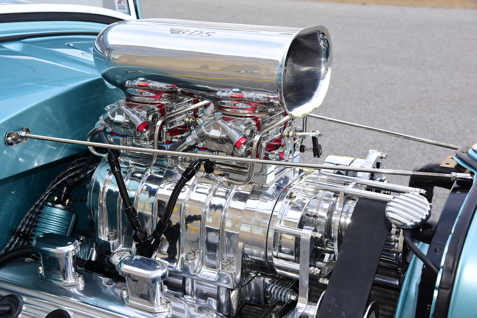 When it came time to address an engine for the coupe, it was obvious the beat would need to come from a vintage Hemi engine. To handle the task, Paul contacted Big Al’s Toy Box of Gaylordsville, Connecticut, to assemble a fire-breathing 1956 Dodge Hemi engine packed with a speed shop full of go-fast goods. A 354ci block was massaged to perfection and filled with a Scat forged steel crank with matching rods capped with forged aluminum JE pistons getting bumped by a Comp Cams camshaft. Up top, a set of warmed-over iron heads make seamless power, especially when matched to a Weiand intake manifold wearing a 71-Series 6-71 supercharger from The Blower Shop breathing deep through a pair of 750cfm Q-Series Quick Fuel Carburetors crowned by a BDS scoop. It all sparks to life through an MSD ignition with hot exhaust moving through a set of Sanderson headers and 2-1/2-inch stainless pipes with four Hushpower II Flowmaster mufflers all fabricated by Schwartz. Other cool bits include finned aluminum Mooneyes valve covers, aluminum Edelbrock water pump, Powermaster alternator and starter, as well as Hot Heads timing chain cover, water crossover, distributor adapter, and oil pump with drive. To move the goods, a TCI Automotive Torqueflite Super StreetFighter 727 transmission links to a custom driveshaft from John’s Industries.