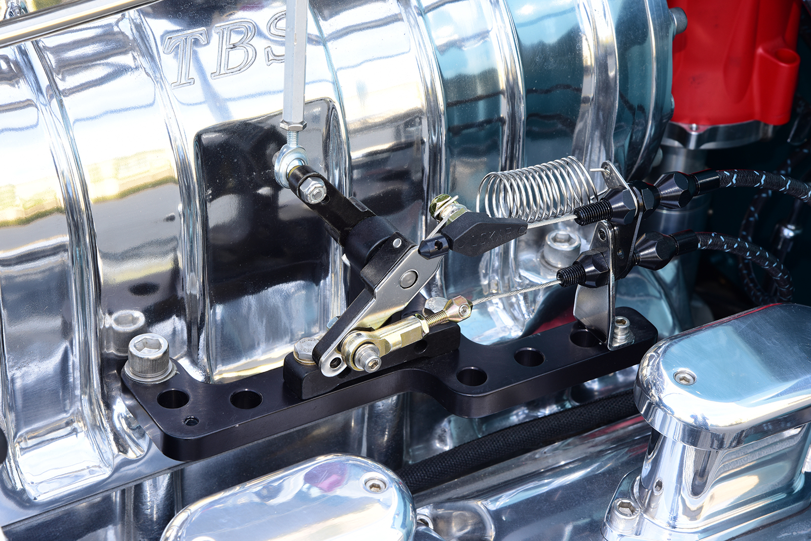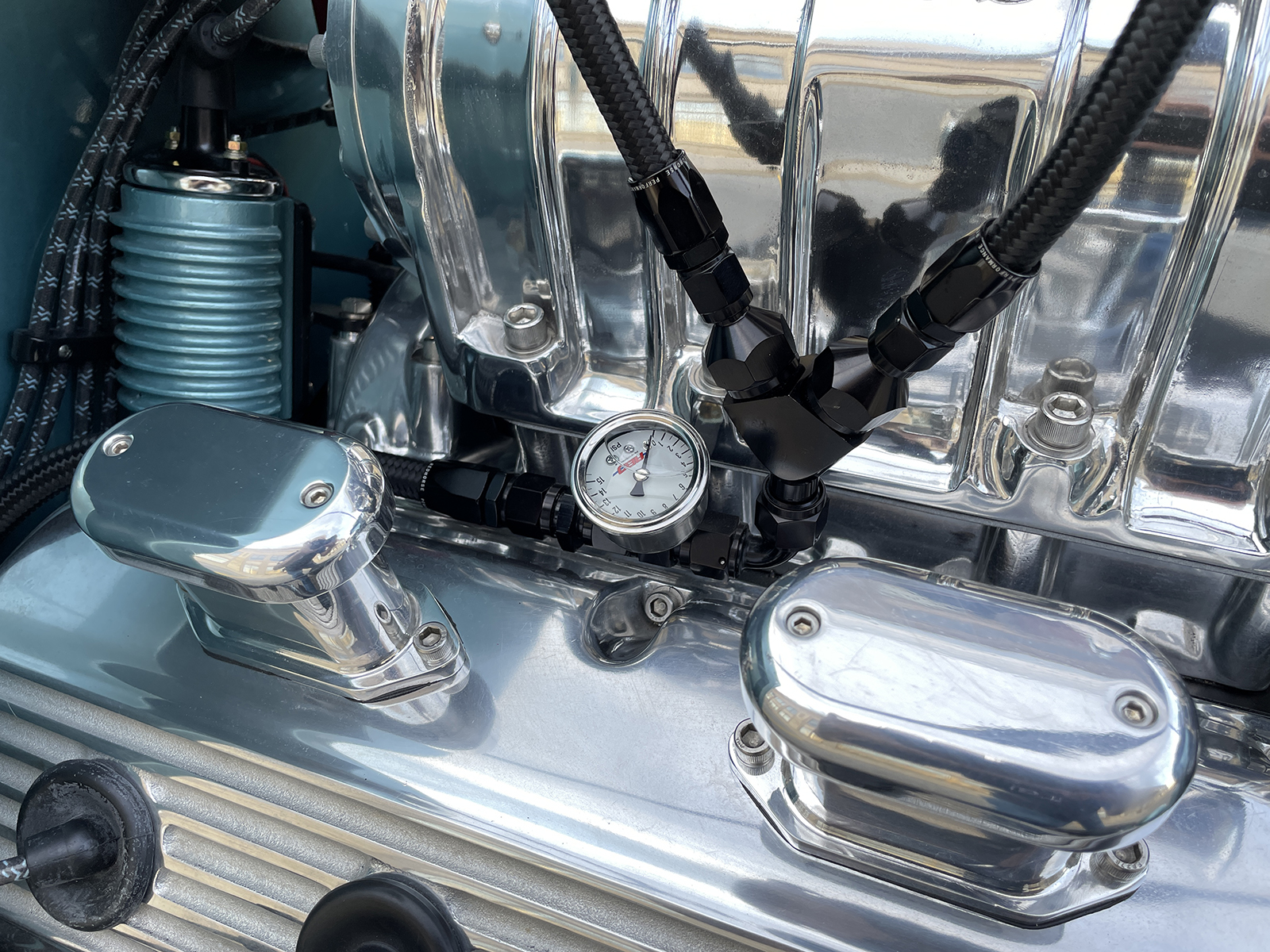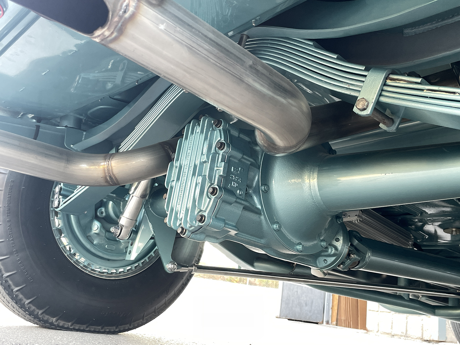 When it came time to address an engine for the coupe, it was obvious the beat would need to come from a vintage Hemi engine. To handle the task, Paul contacted Big Al’s Toy Box of Gaylordsville, Connecticut, to assemble a fire-breathing 1956 Dodge Hemi engine packed with a speed shop full of go-fast goods. A 354ci block was massaged to perfection and filled with a Scat forged steel crank with matching rods capped with forged aluminum JE pistons getting bumped by a Comp Cams camshaft. Up top, a set of warmed-over iron heads make seamless power, especially when matched to a Weiand intake manifold wearing a 71-Series 6-71 supercharger from The Blower Shop breathing deep through a pair of 750cfm Q-Series Quick Fuel Carburetors crowned by a BDS scoop. It all sparks to life through an MSD ignition with hot exhaust moving through a set of Sanderson headers and 2-1/2-inch stainless pipes with four Hushpower II Flowmaster mufflers all fabricated by Schwartz. Other cool bits include finned aluminum Mooneyes valve covers, aluminum Edelbrock water pump, Powermaster alternator and starter, as well as Hot Heads timing chain cover, water crossover, distributor adapter, and oil pump with drive. To move the goods, a TCI Automotive Torqueflite Super StreetFighter 727 transmission links to a custom driveshaft from John’s Industries.