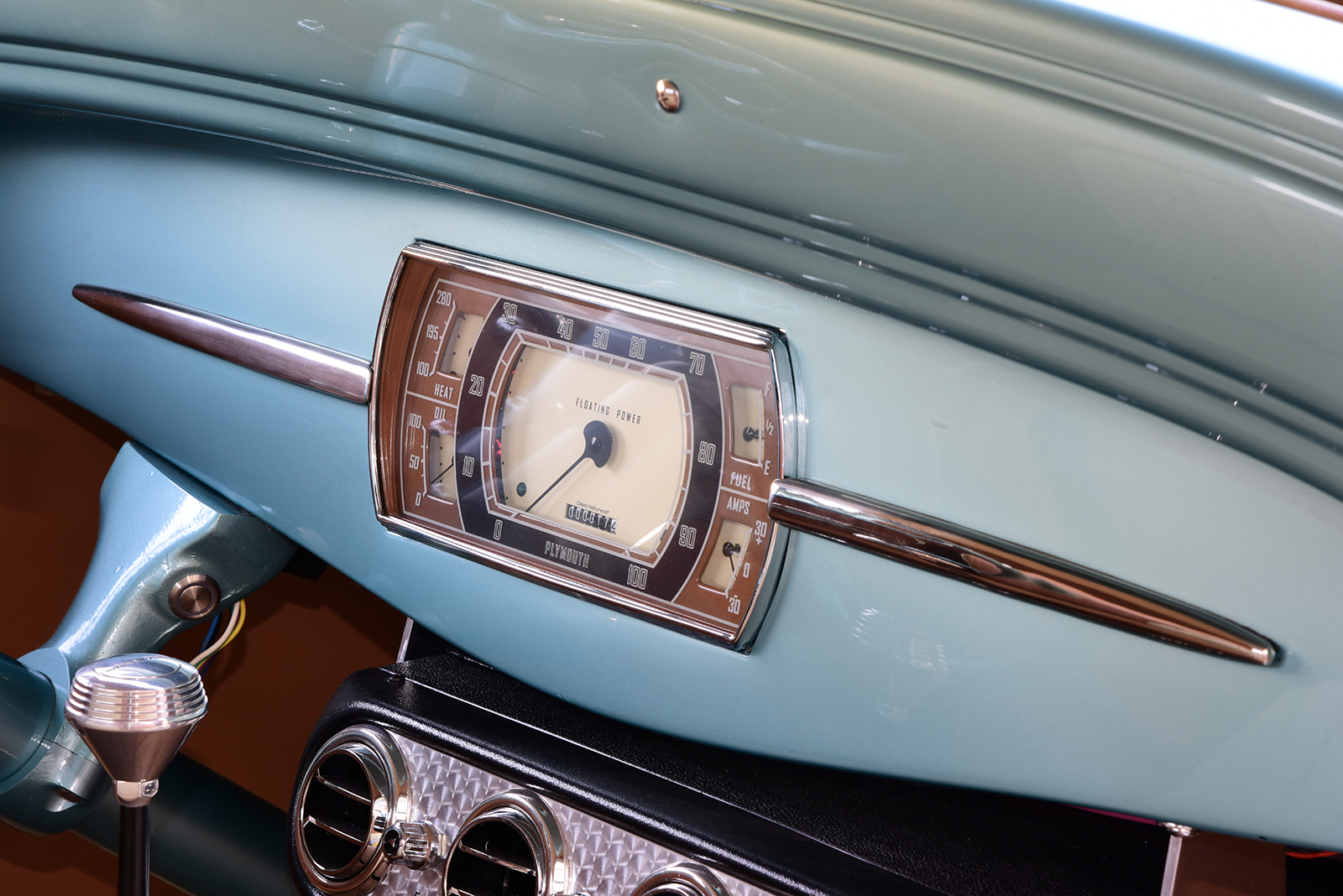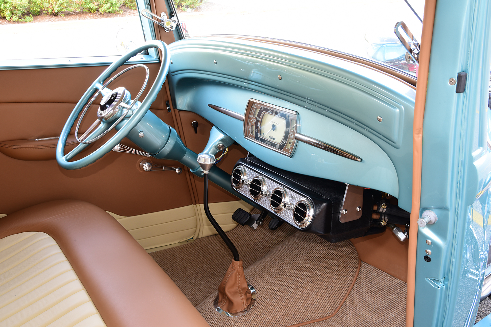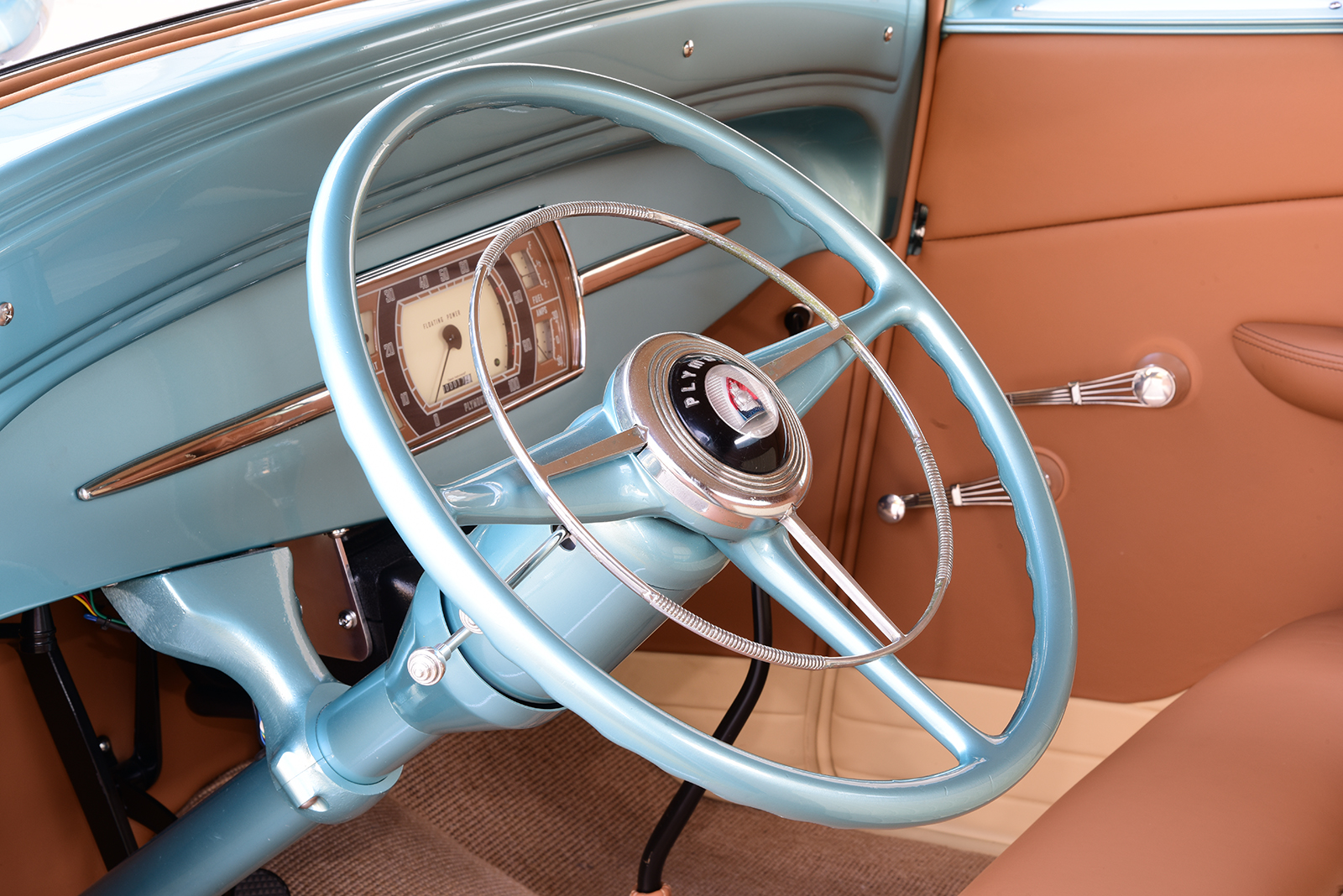 For an equal amount of allure in the business office to match the rest of the build, the factory dash was smoothed and treated to a refreshed 1936 Dodge instrument cluster, converted to Plymouth by the team at Classic Instruments to monitor the vitals. A 1946 Plymouth steering wheel restored by Vintage Performance mounts to a tilt ididit steering column to carve the course while shifts move effortlessly through a Lokar shifter with a Vintage Air Heritage-Series under dash unit, adding a cool breeze on hot days. An American Autowire Builder-Series kit installed by Cam Wadsworth of Guelph, ties it all perfectly together. For the ultimate in comfort, Peter Giampa of Tack Auto & Marine Upholstery in Loretto, Ontario, Canada, covered a Tea’s Design bench in a combination of caramel and beige leather while also crafting all side panels and headliner, wrapping it all up with complementing French-weave carpeting. Finally, special thanks are to Paul Henderson for their support of the project from start to finish. This is one rare coupe packed with a newfound elegance that’s racking up the miles and to us that’s as good as it gets! MR