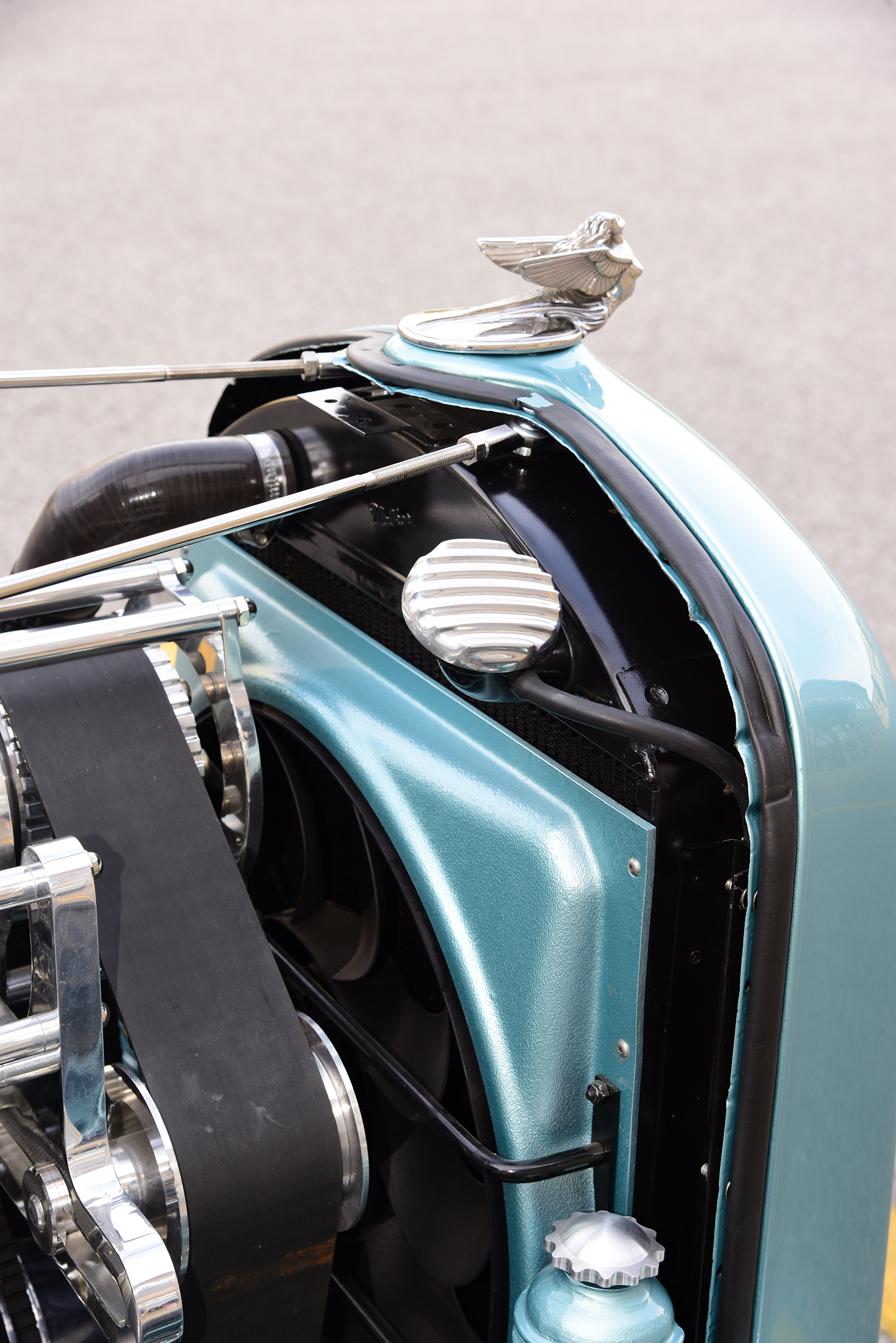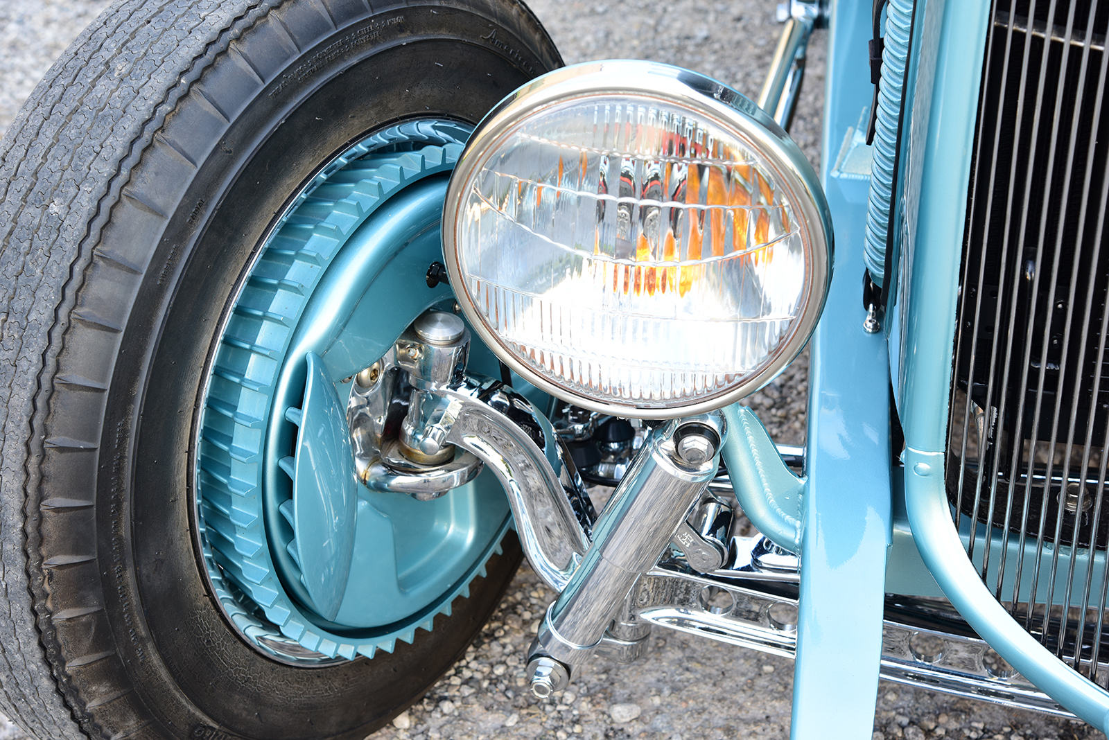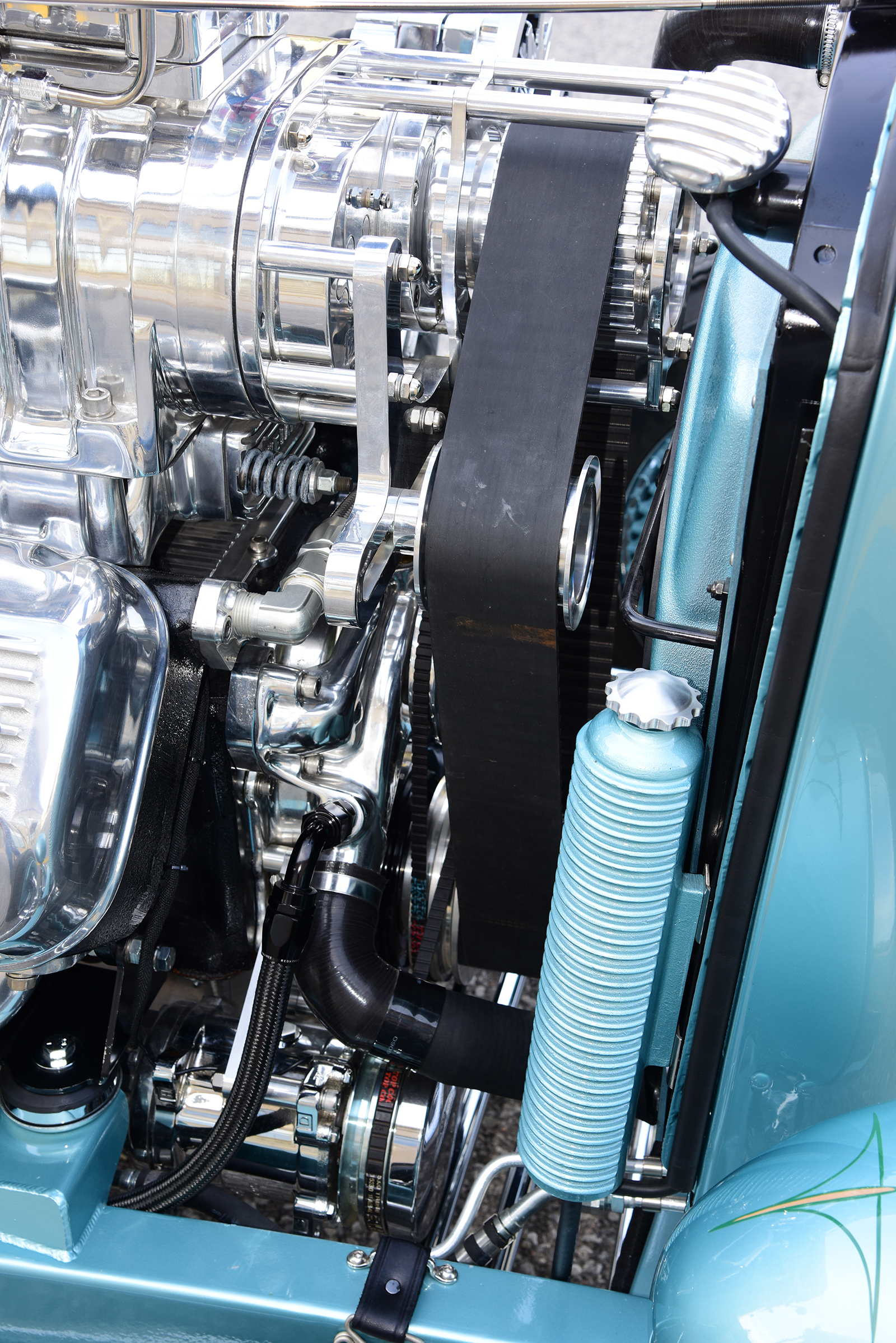 Knowing the car would need a fresh frame capable of handling the new demands, a call was made to Grant Schwartz of Bloomingdale to design and fabricate a rock-solid base. He started with a fresh set of Deuce ’rails from ASC, stretching them 10 inches forward of the firewall and boxing them for added strength while also adding custom crossmembers to the mix and sculpting the ’rails to match the body lines. Out back, a Winters quick change rear end spins 3.70 gears through matching axles, suspended in place by a combination of Pete & Jakes ladder bars and a Welder Series Panhard bar while a transverse Posies Super Slide spring and Ridetech Hot Rod shocks soak up the bumps. For a wicked stance, a 4-inch drop-and-drilled Super Bell axle was deftly matched to Pete & Jakes spindles with matching Viper-Series hairpins, Posies Super Slide transverse spring, and Hot Rod Ridetech shocks. When it’s time to stop on a dime and give change, a Kugel Komponents reverse 90-degree under dash brake pedal assembly with a Wilwood dual master moves fluid through stainless lines to 11-inch finned Ford drums from John’s Industries out back and SO-CAL Speed Shop front discs with finned aluminum drum covers in front. For the perfect bit of dazzle linking it all to the street, a set of Wheel Vintiques chrome Artillery-styled wheels topped with Shannon Cones, sized 15×5 in front and 15×6 in rear, are shod with Coker American Classic Radials, sized 5.60R15 and 8.20R15 respectively.