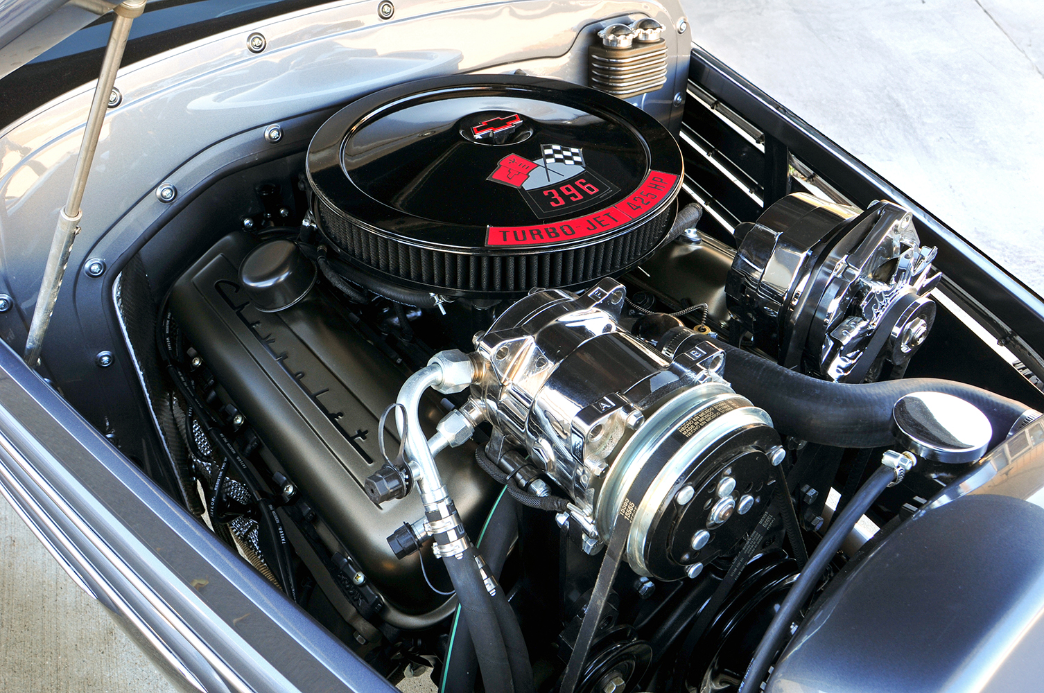 The intake features an Edelbrock AIR-Gap manifold, and a Holley Sniper II EFI throttle body has been added. An MSD Pro-Billet Flat-Top distributor, an MSD box, and Taylor wires, along with a pair of Powermaster components—a starter and alternator—were used to supply power to the plugs. The spent gases exit through a pair of Sanderson block-hugging shorty headers that connect to 2-1/2-inch exhaust pipes, which are ceramic coated and wrapped with DEI material and a shield. A Coan Engineering prepped Turbo 400, complete with its 2,300-rpm stall speed converter and a Gennie shifter, transports the power back to the rear. One note: the air cleaner evokes a time long past; it recreates the Turbo Jet 425 hp 396. This original big-block V-8 was notable as a remarkably powerful BBC.
