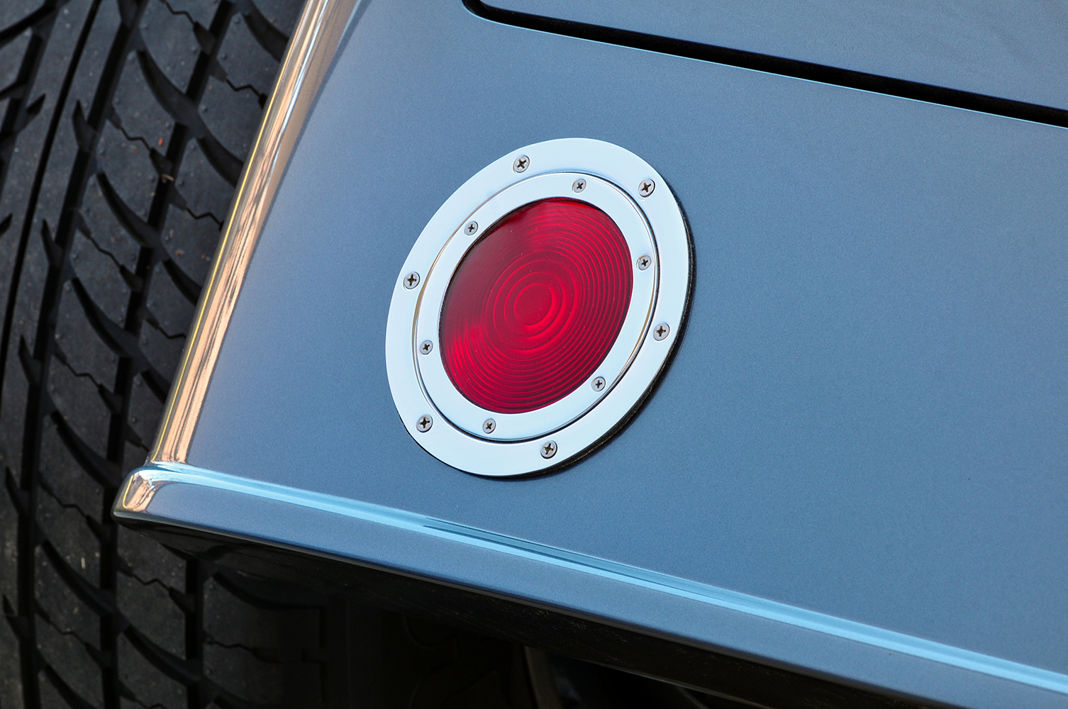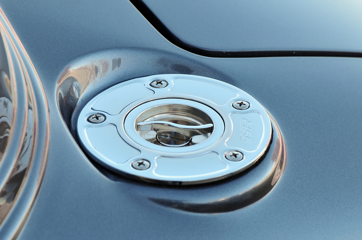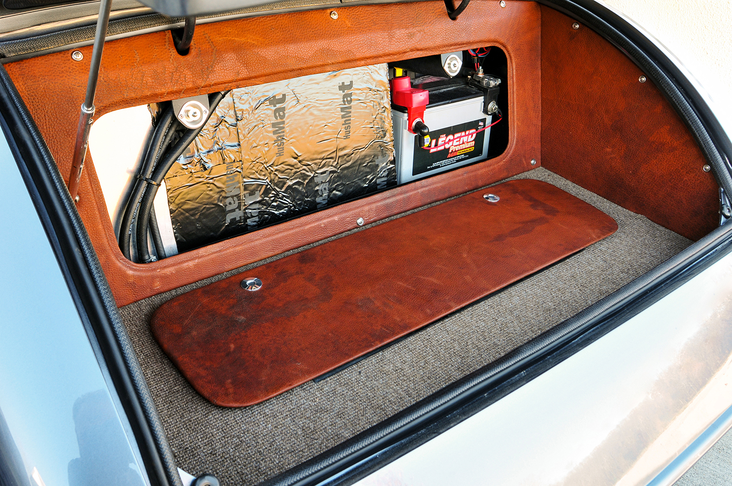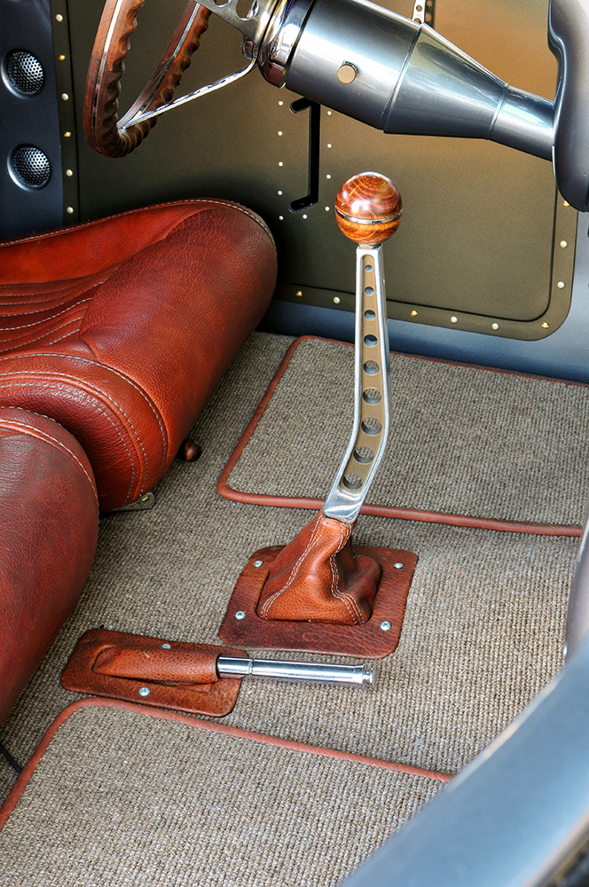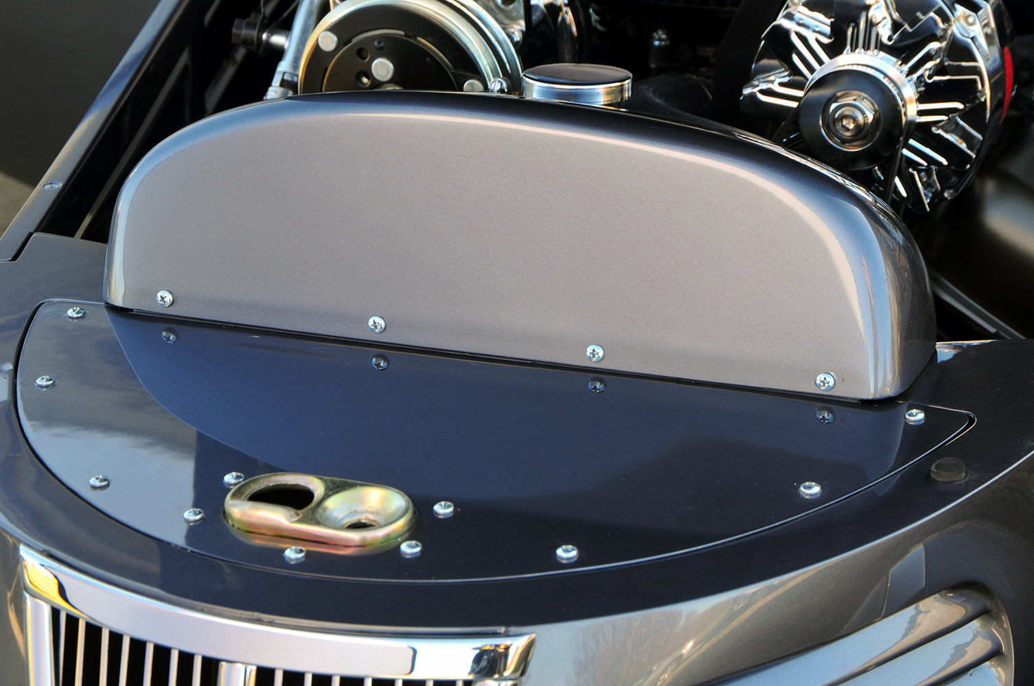 The factory sheetmetal originated from a 1935 Chevy Standard three-window coupe, but that’s where the factory ends and the hot rod begins. The top was chopped 2-3/4 inches in the front and just 2 inches at the rear window. From there it was channeled 4 inches and the rear wheel opening was raised by 2 inches. A new body line was added across the rear, the firewall was repositioned, and the bottoms of the doors were rounded. A custom pop-up top (insert) and then the hood sides were extended to follow the frame’s curve, along with unique one-off hood hinges. The grille shell is a modified 1937 Hudson shell used alongside P-51 fighter plane taillights. VF completed this impressive amount of sheetmetal work. After a hiatus, Michael McLin of McLin Paint Works handled the bodywork and paint and sprayed the Chevy in an Axalta Satin Steel Gray.