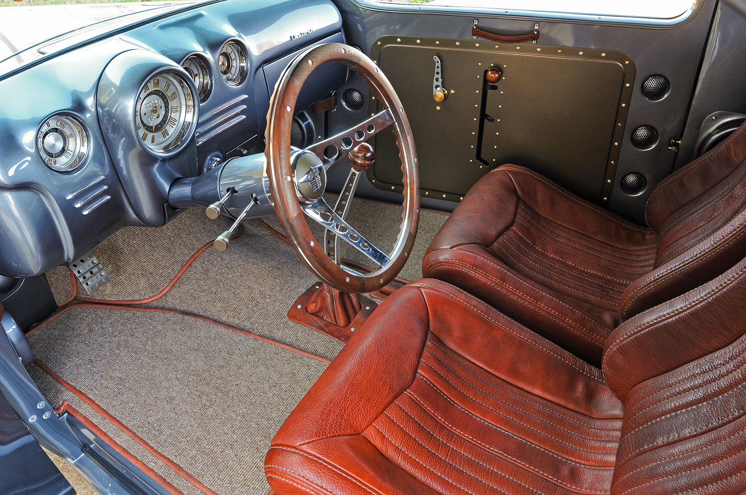 Inside, the 1935 Chevy coupe is an interesting choice for a dashboard as it uses a 1949 Buick modified to fit. From here, the Buick gauges were restored and reused, giving the car a cool retro look and something out of the ordinary. Wiring the gauges and the Vintage Air A/C system is an American Autowire Power Plus 20 by Derick Kurtz of VA. The 1949 Buick dash is fitted with a late-model GM-style tilt column with an N.O.S. 1960 S 500 Superior Performance Products wood steering wheel. The headliner is a steel insert. Now, look closely at the door panels, which are two-piece steel panels. The buckets are stitched in rust-colored buffalo hide by VF and utilize two-point lap belts. The carpeting is Apex Ultra square weave and is trimmed in matching seat color piping.