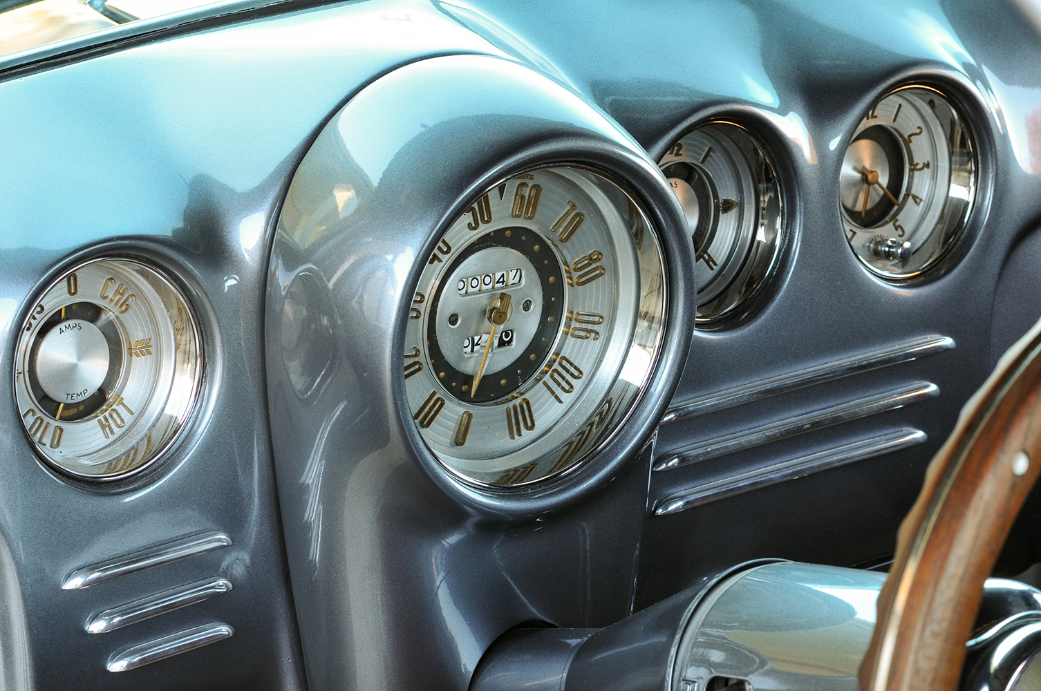 17 1935 Chevy Coupe close up dash shot vintage gauges gold numbering retro design