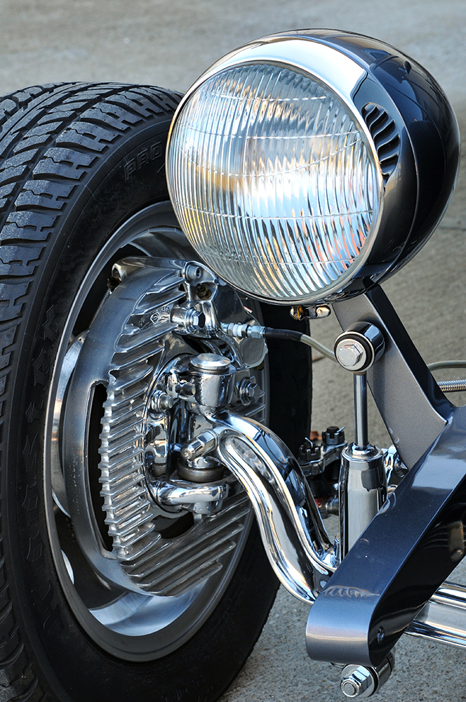 The VF custom framerails extend the stock wheelbase from 107 to 110 inches; VF also designed a custom 15-gallon gas tank. The front suspension uses traditional hot rod components, featuring a chromed Super Bell I-beam axle along with Pete & Jakes spindles, tube shocks, and hairpins. The steering system is based on the reliable Vega box, while the braking system includes a pair of Pete & Jakes Super Stoppers, equipped with Wilwood Dynalite calipers and rotors along with finned backing plates.