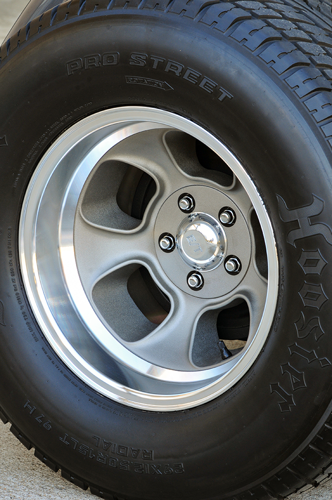 The rear suspension is centered around a Ford 9-inch rearend with Strange Engineering axles and a Gears Unlimited driveshaft, complemented by Pete & Jakes ladder bars, coilover shocks, and a Panhard bar. The rear braking features 11-inch Ford drums, while the entire system uses a Wilwood master cylinder and OTB reservoirs to hold the necessary fluids. You can find ET Dragmasters, 15×5 in front, cast centers with polished lips, and Hoosier Pro Street 25×7.50R15LT rubber. More Hoosier Pro Street tires, measuring 29×12.50R15LT in the back, are mounted to E-T 15×10 five-window high-angle slotted mags.
