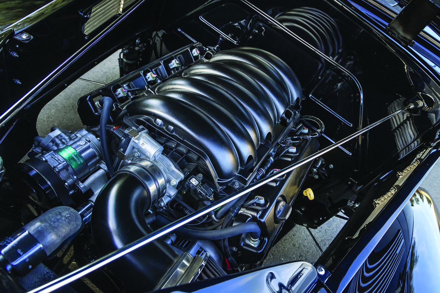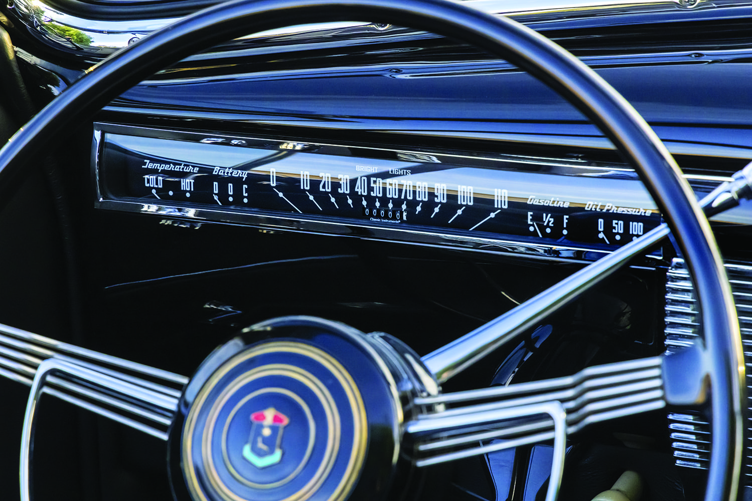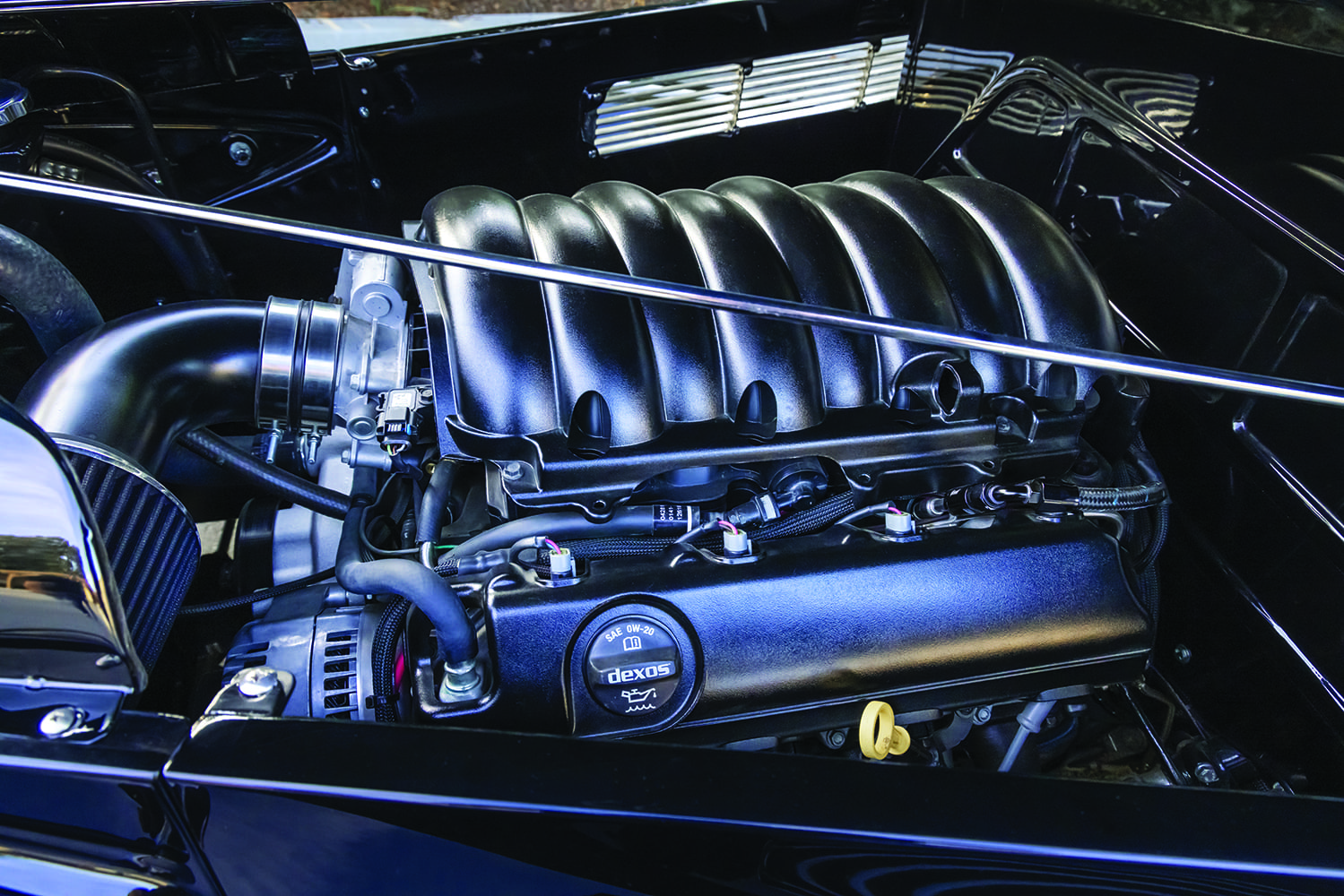 This 1939 Cadillac’s “umph” comes from a 2016 5.3L V-8 engine, the L83, which produces 355 hp and 383 lb-ft of torque. It’s paired with a 6L90 six-speed automatic transmission operated through the original steering column with SHRF modified shift linkage. This engine is part of the EcoTec3 family, featuring an aluminum block and cylinder heads. The V-8 includes GM direct injection, a Spectra air cleaner, and a combination of GM and Howell ECU and other engine and transmission management components. A trunk-mounted, behind-the-back-seat Odyssey 31-925T battery supplies the “juice” for the start-up. These batteries can be mounted in any orientation except inverted (upside down).